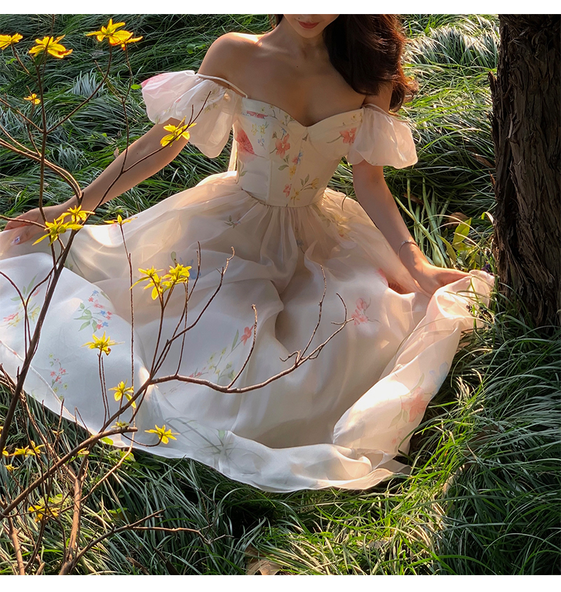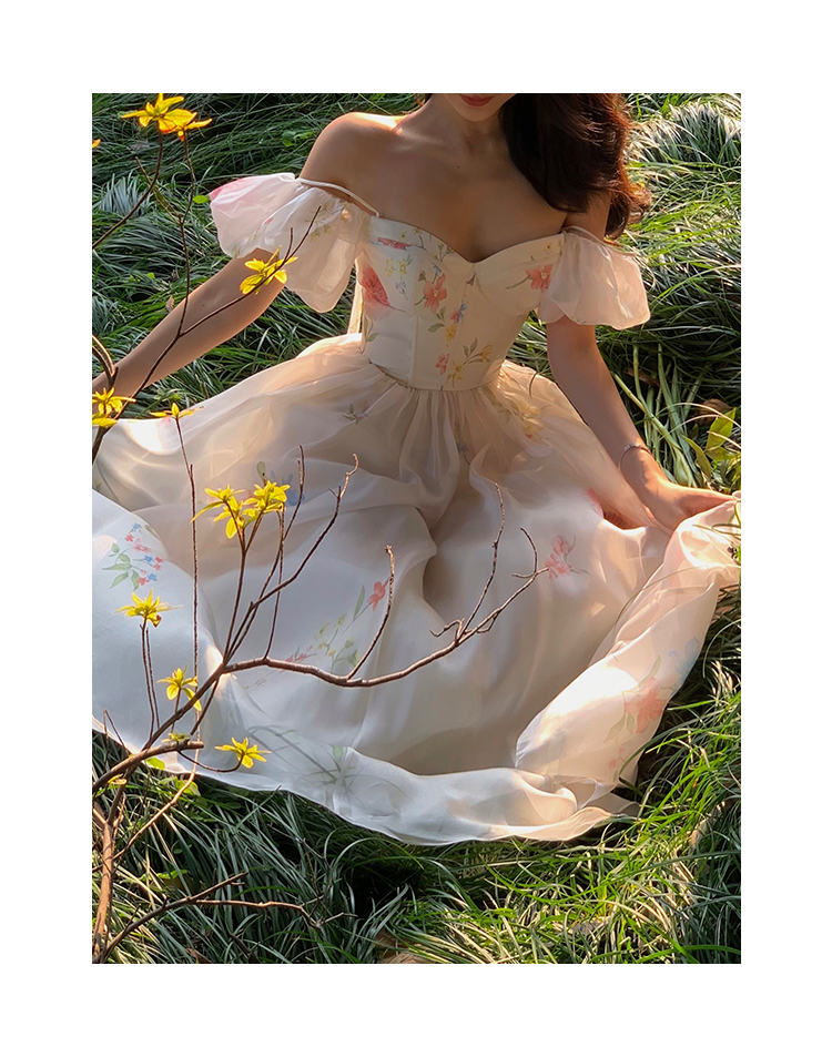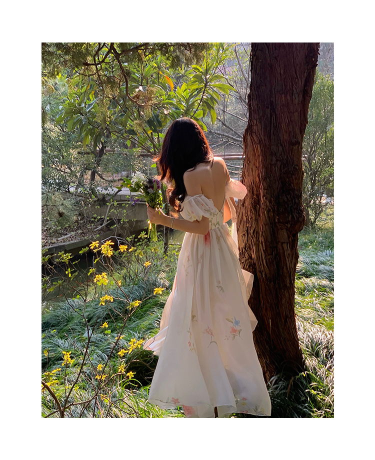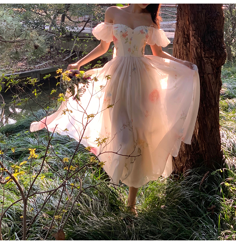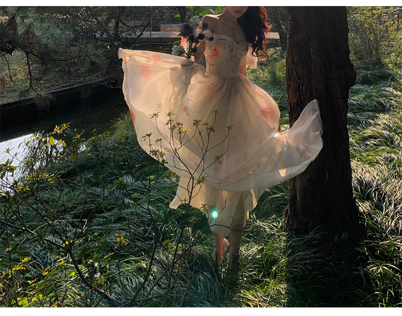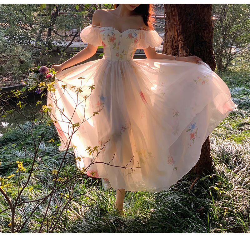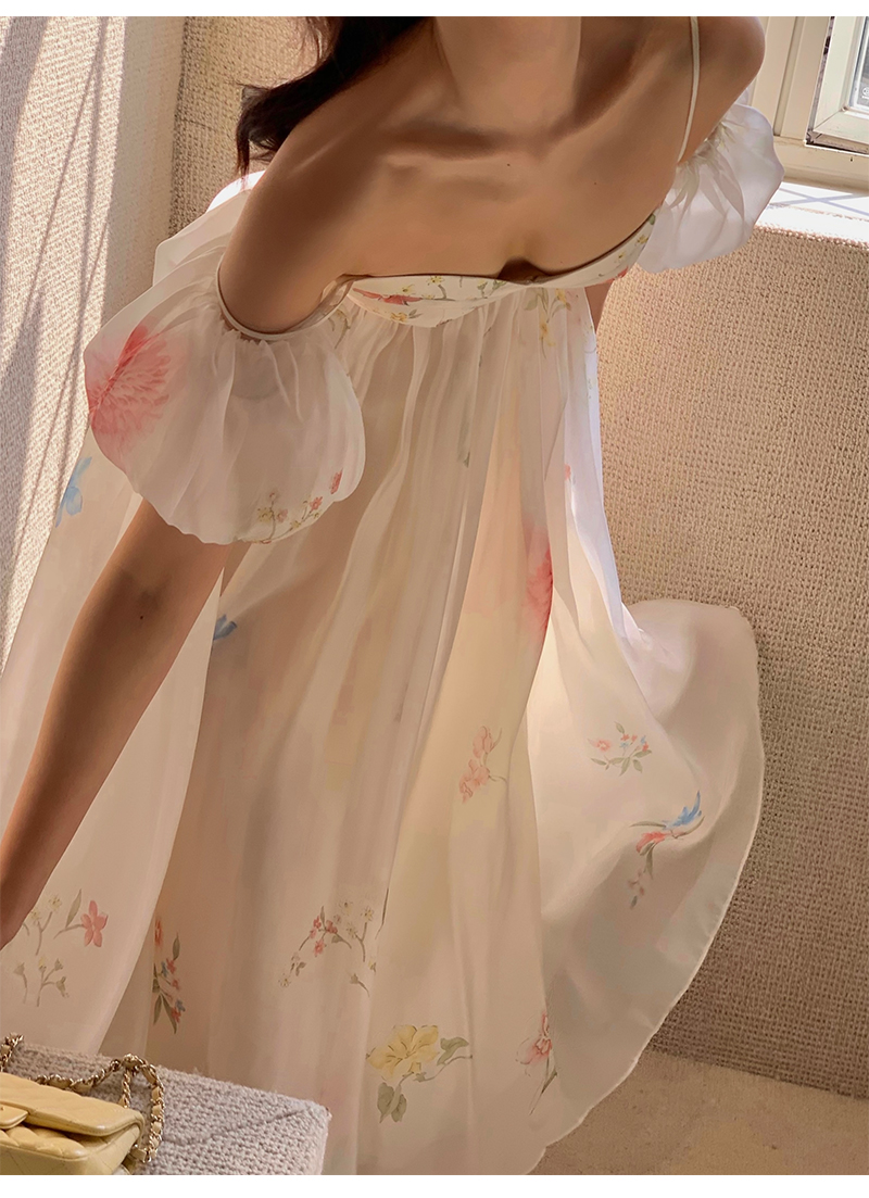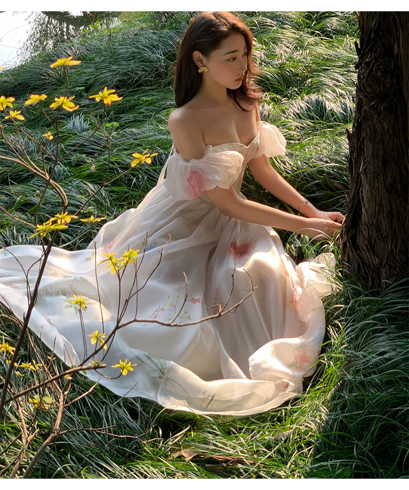 小麗XIAOLI腮紅一字肩泡泡袖吊帶碎花洋裝長裙女夏法式氣質紗裙子