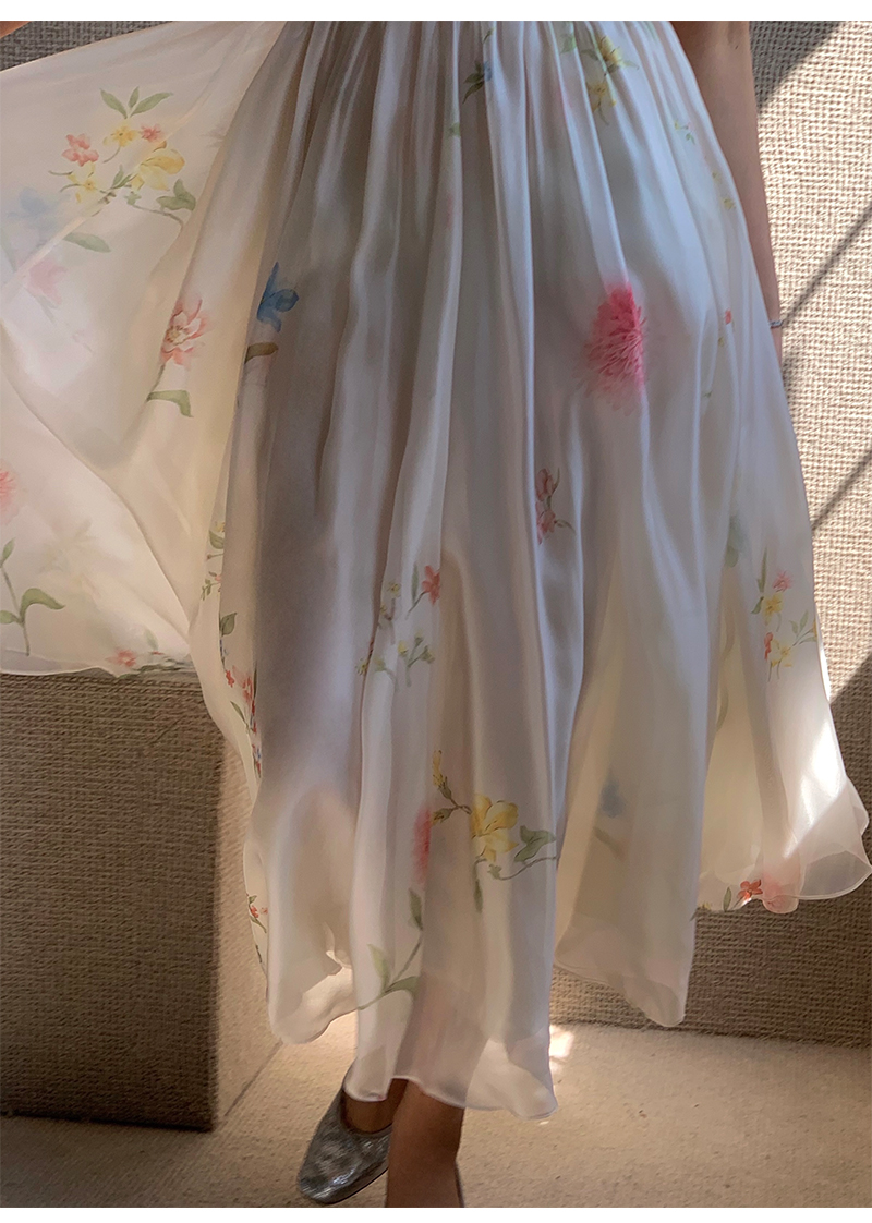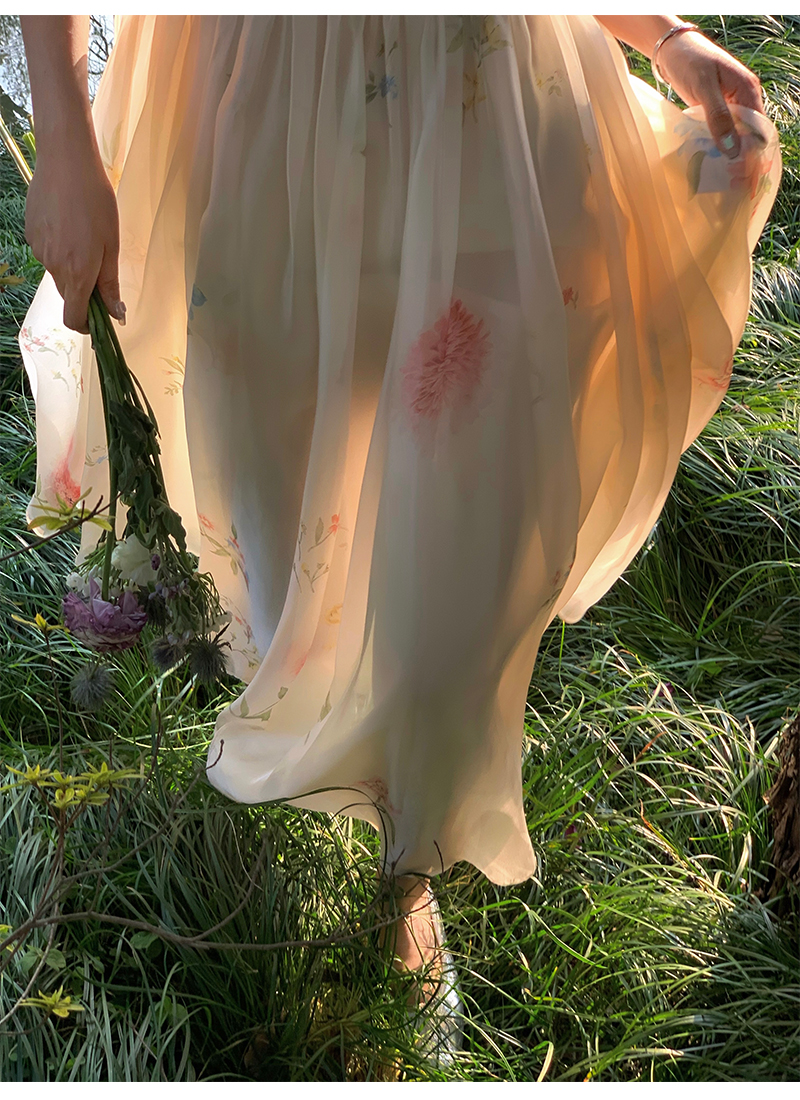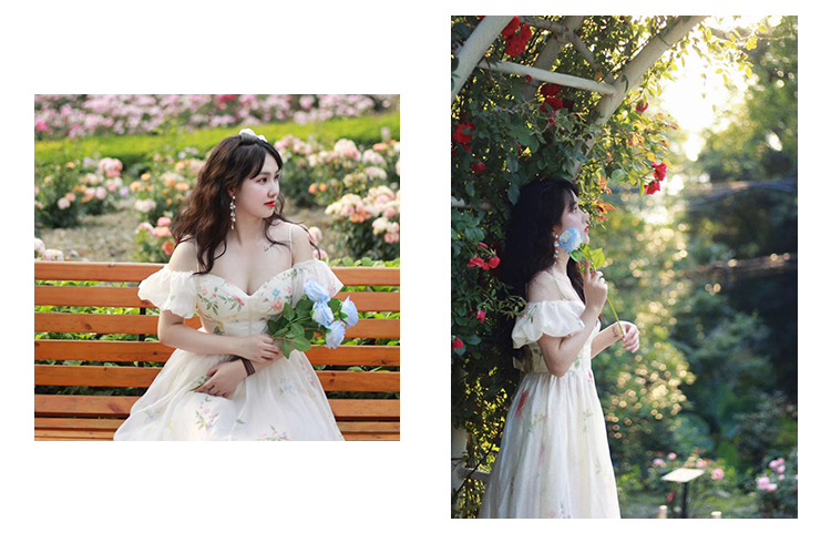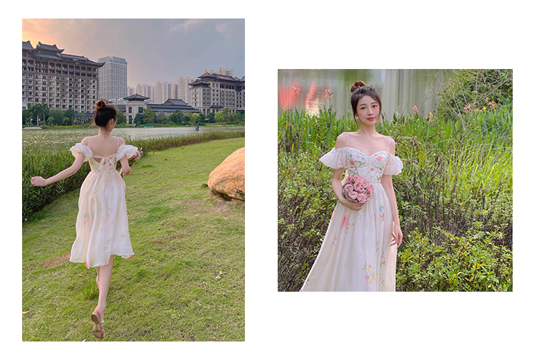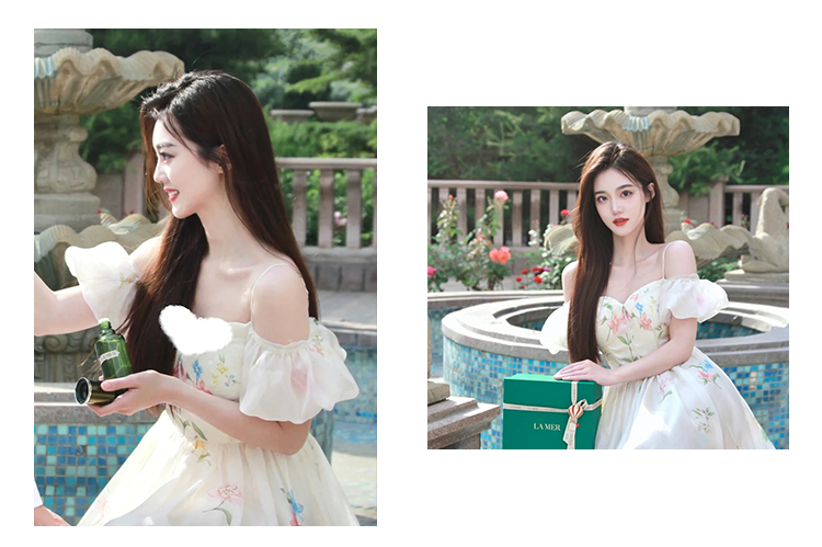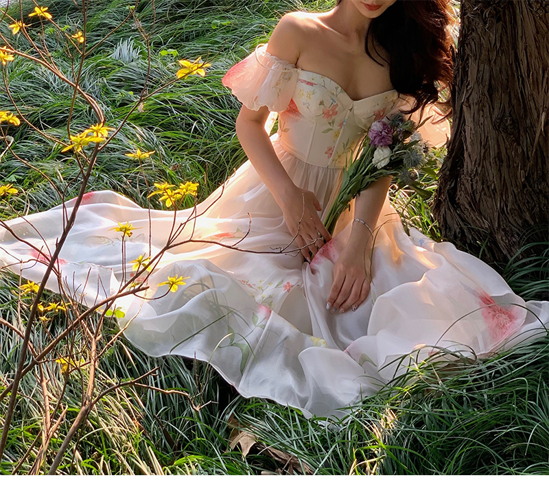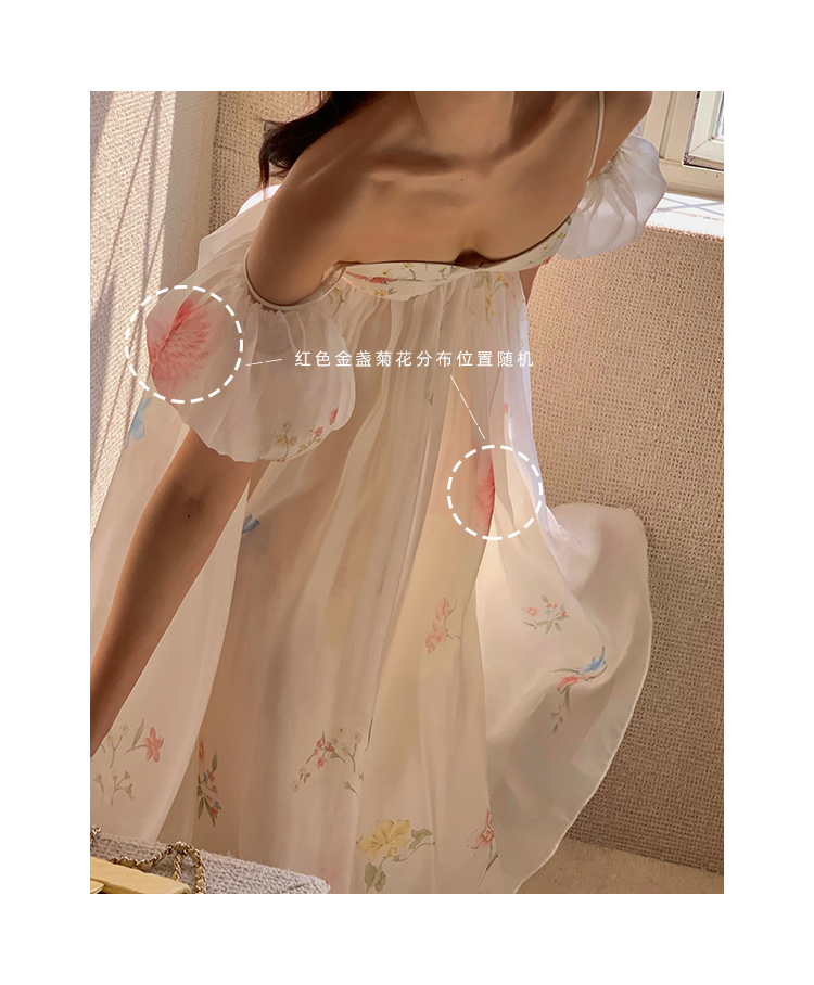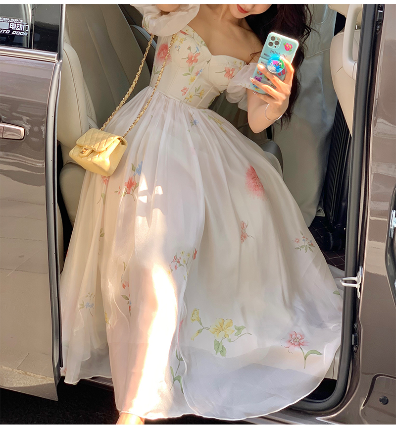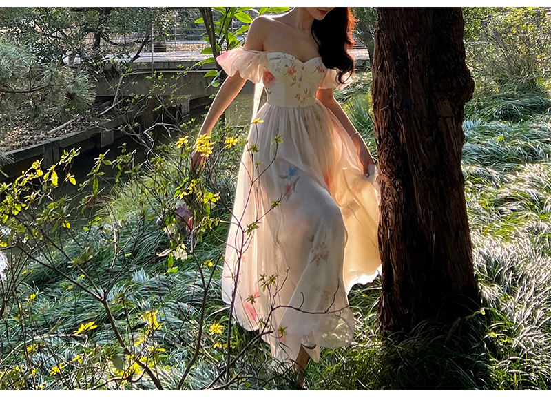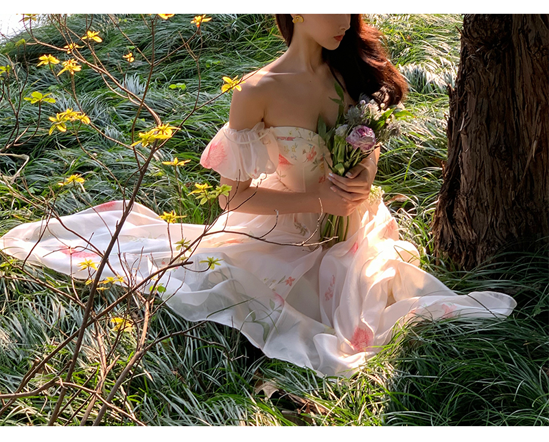小麗XIAOLI腮紅一字肩泡泡袖吊帶碎花洋裝長裙女夏法式氣質紗裙子