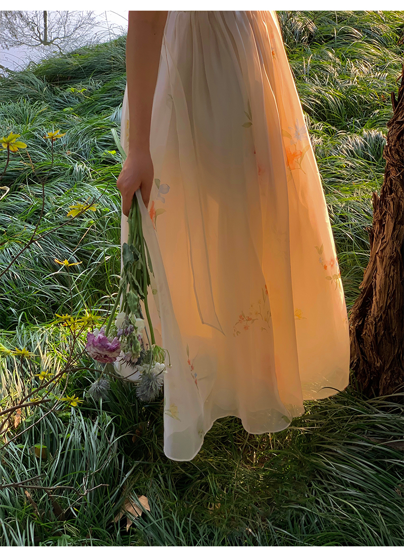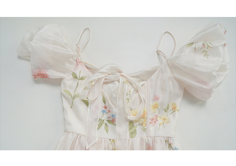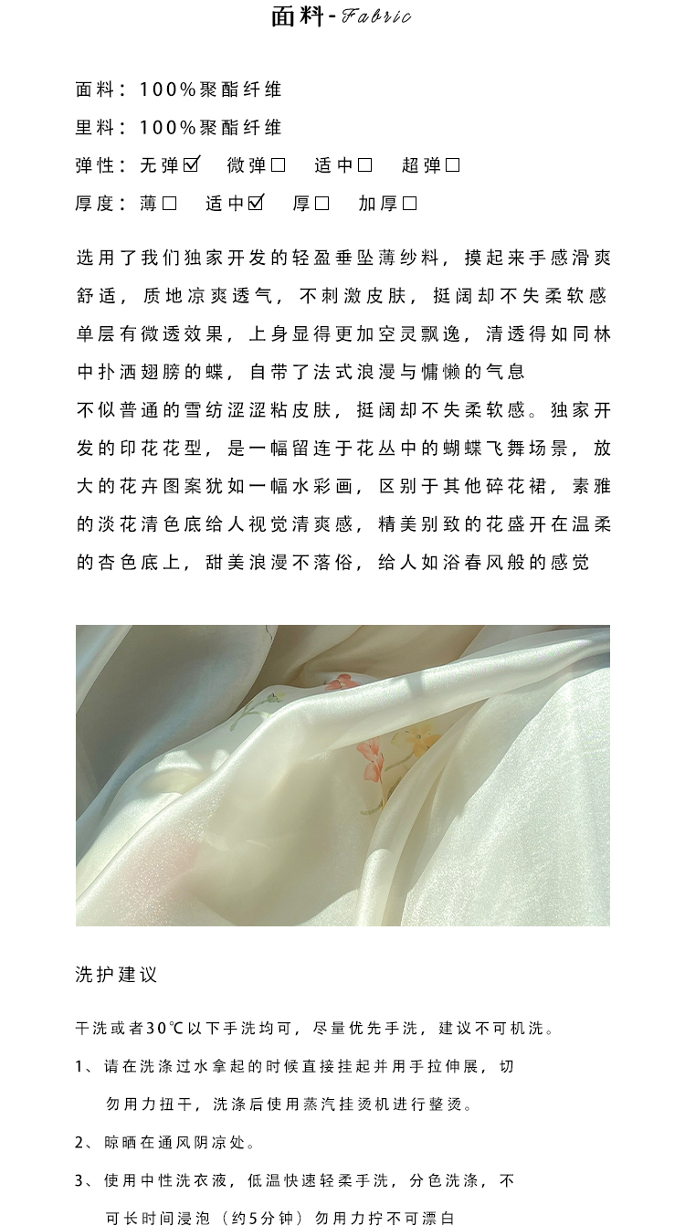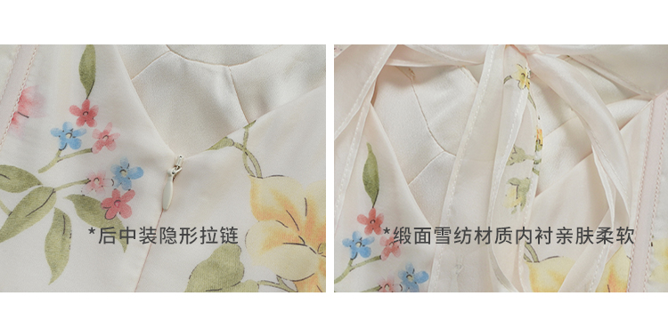 连衣裙上身的内衬材质是缎面雪纺的,亲肤柔软