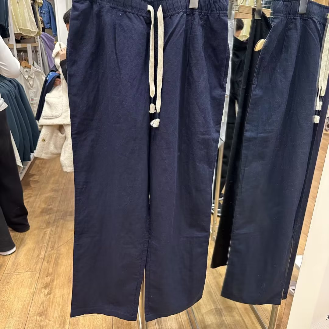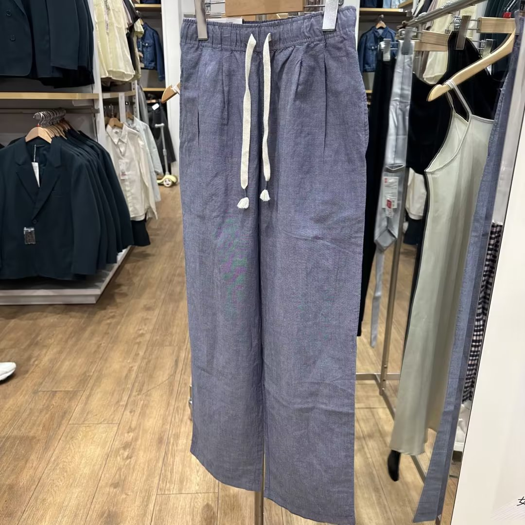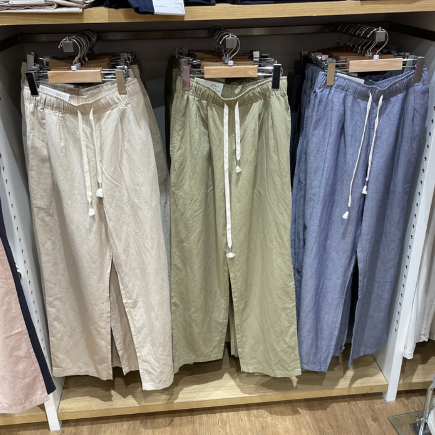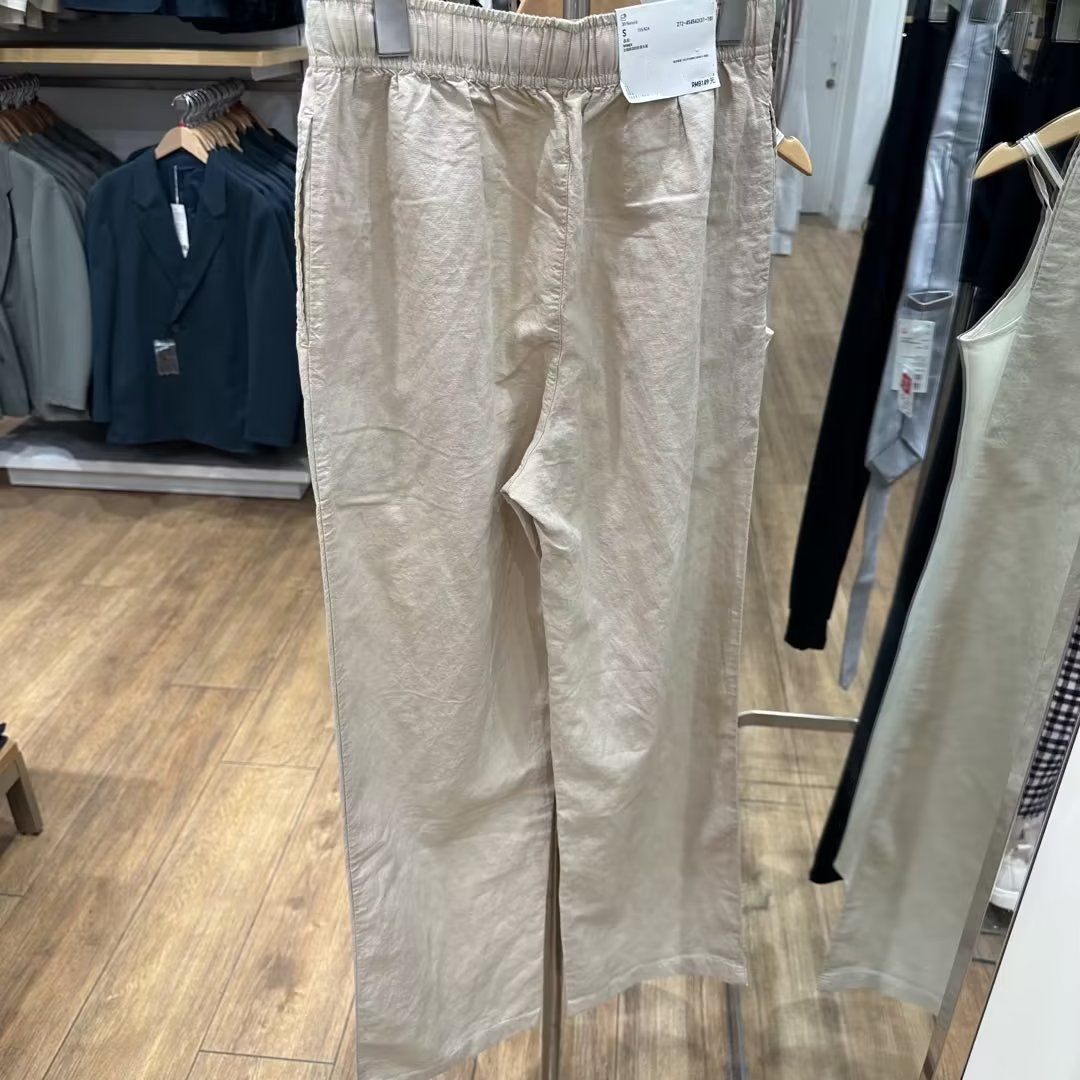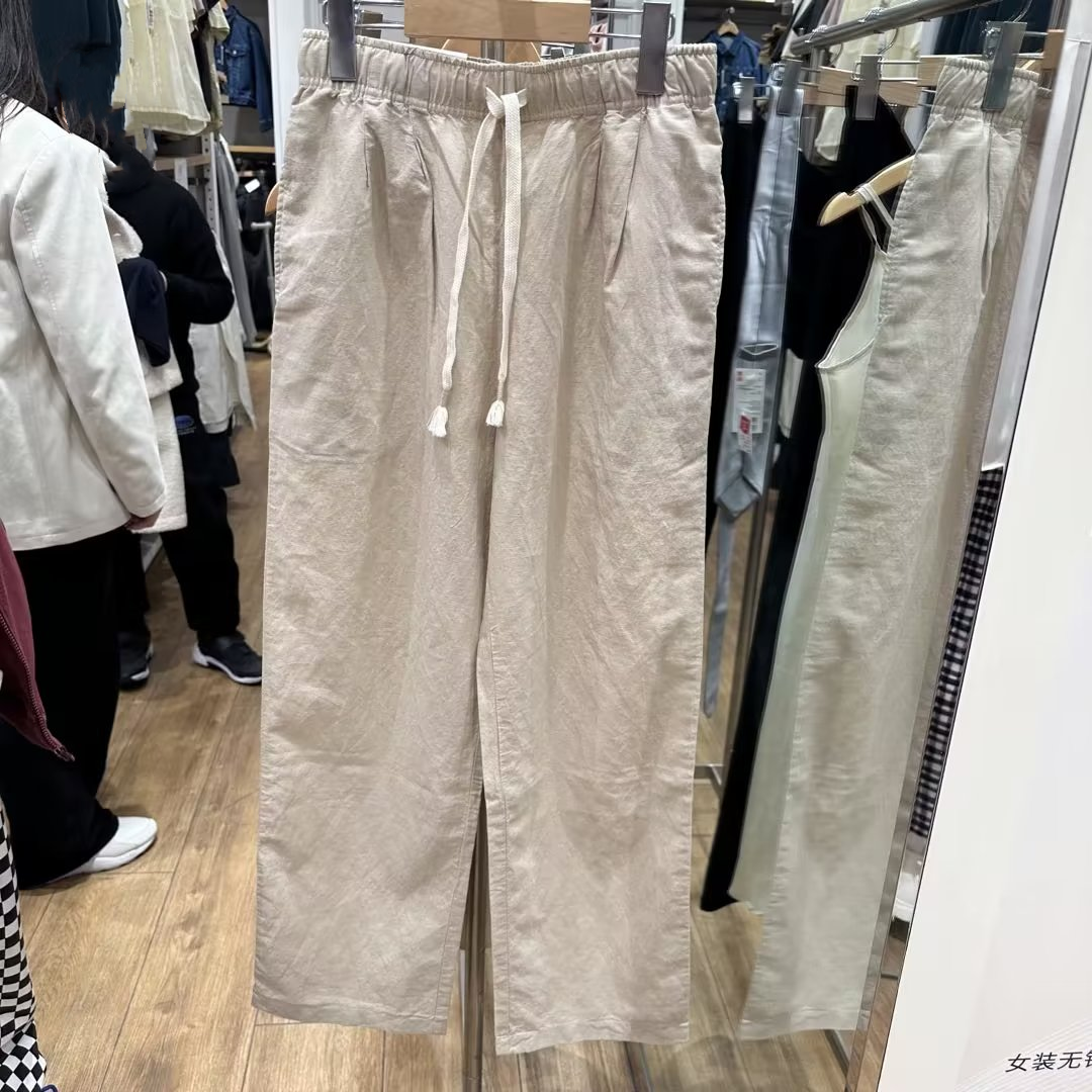 優家夏季新款女裝麻混紡鬆緊長褲休閒褲寬鬆直筒寬褲454542