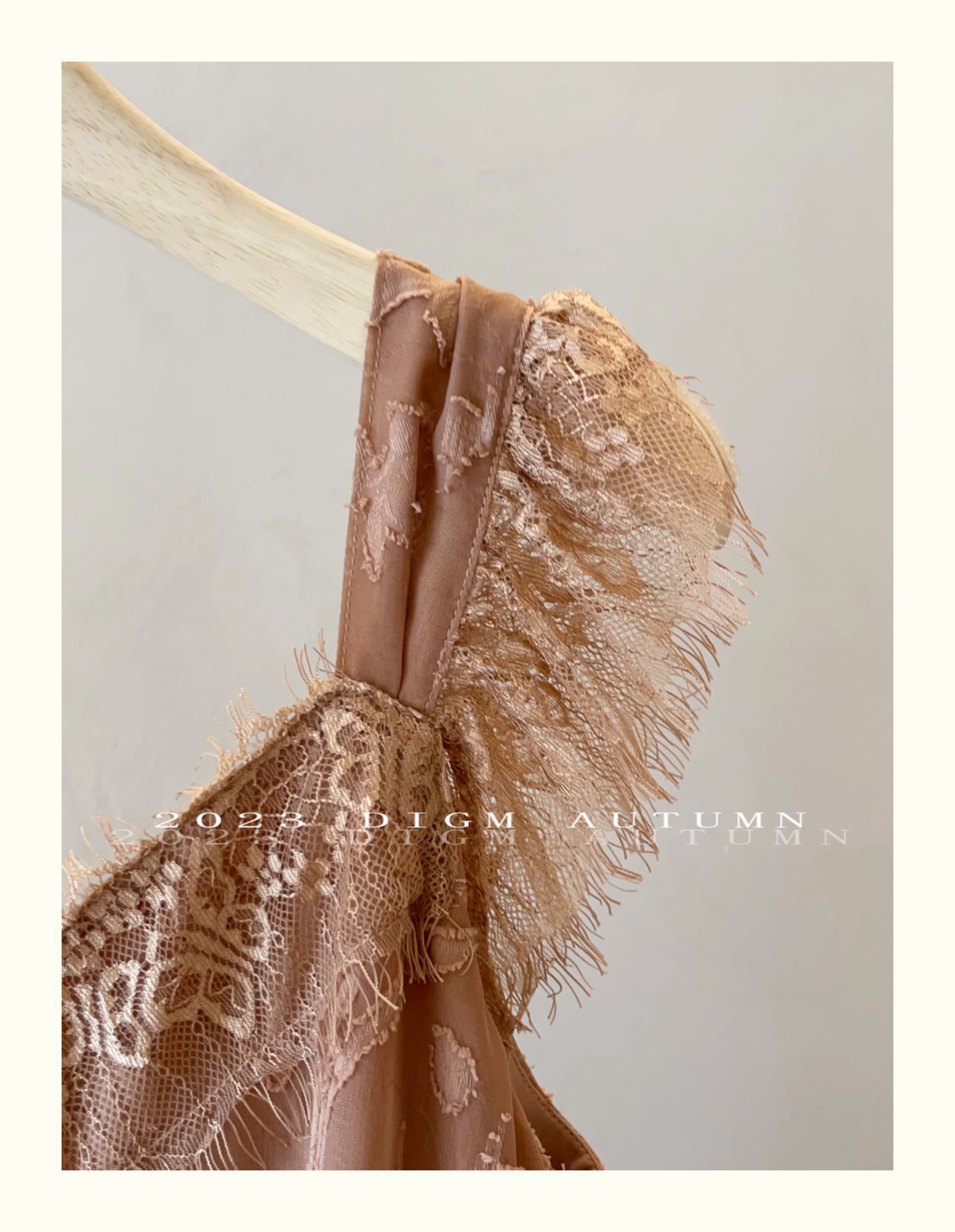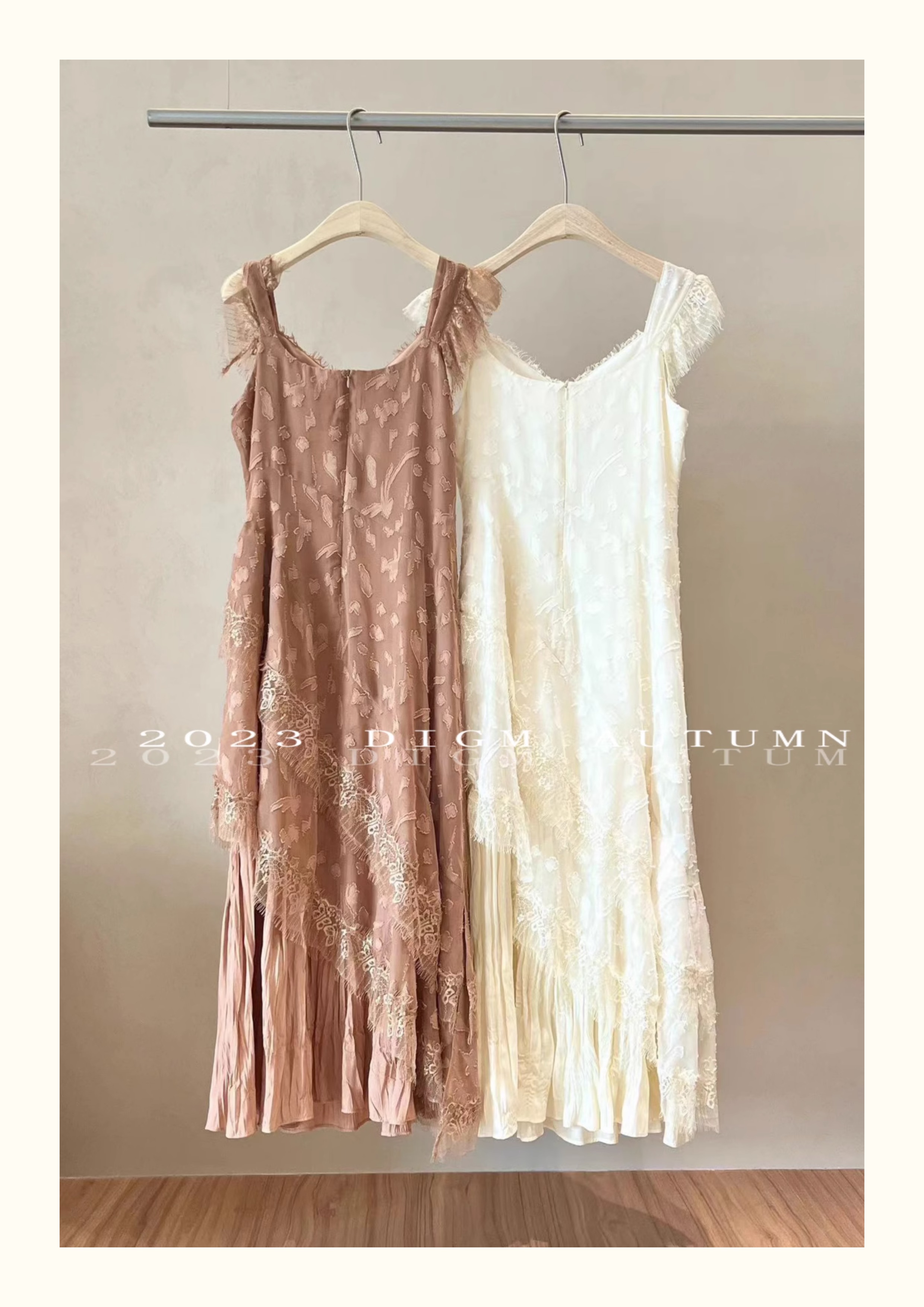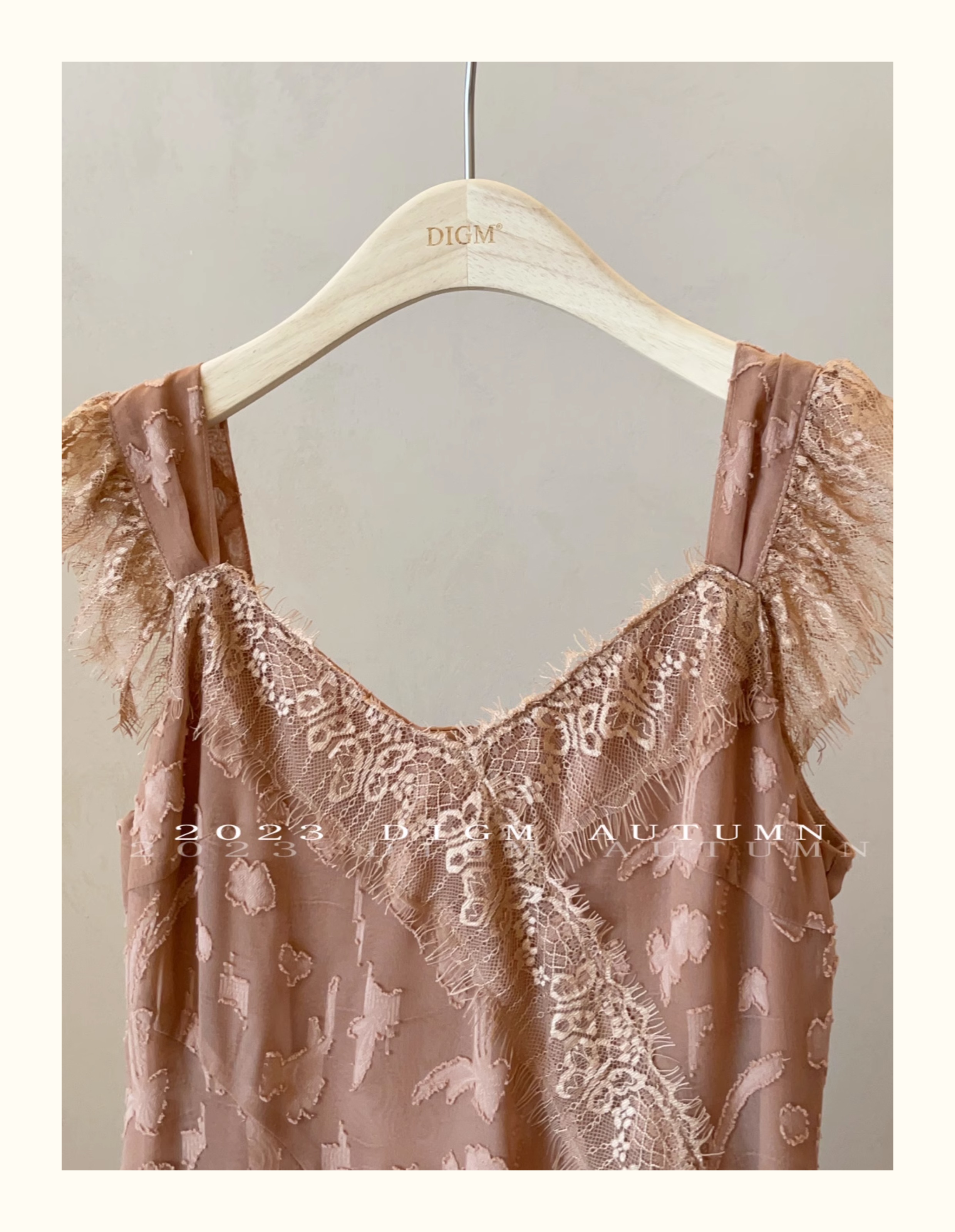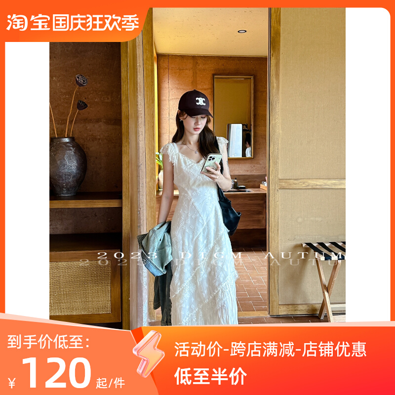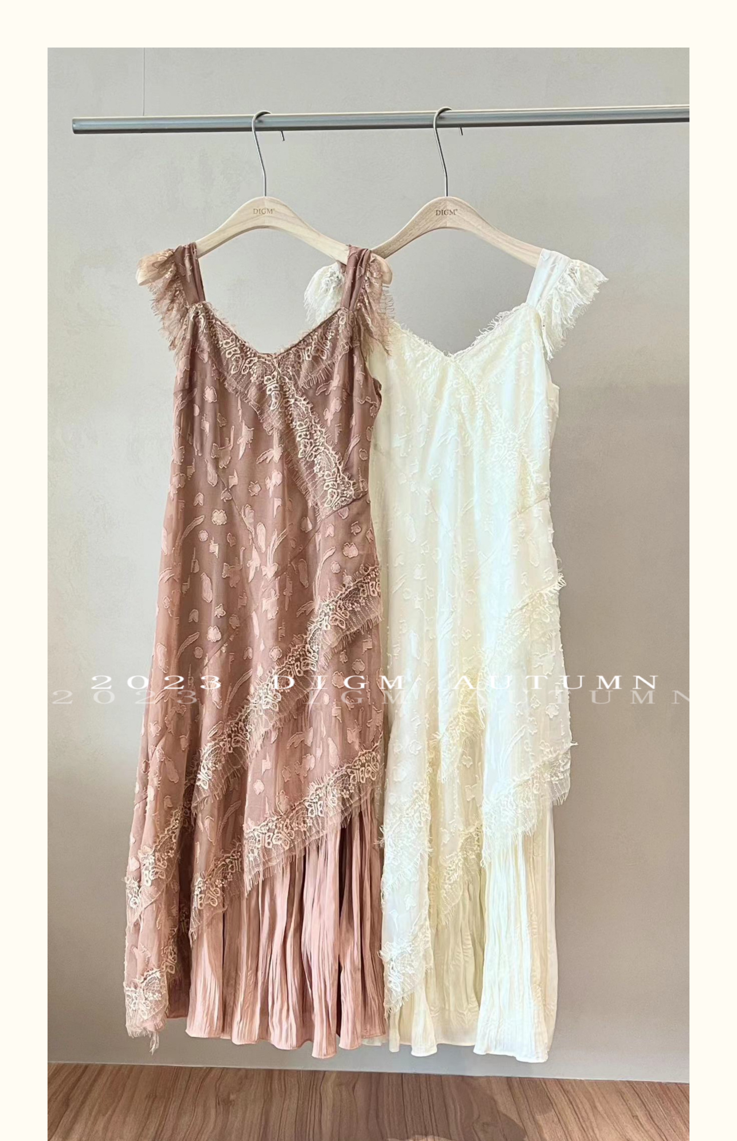 DIGM 法式優雅蕾絲花邊收腰V領洋裝2023秋季氣質荷葉袖中長裙潮