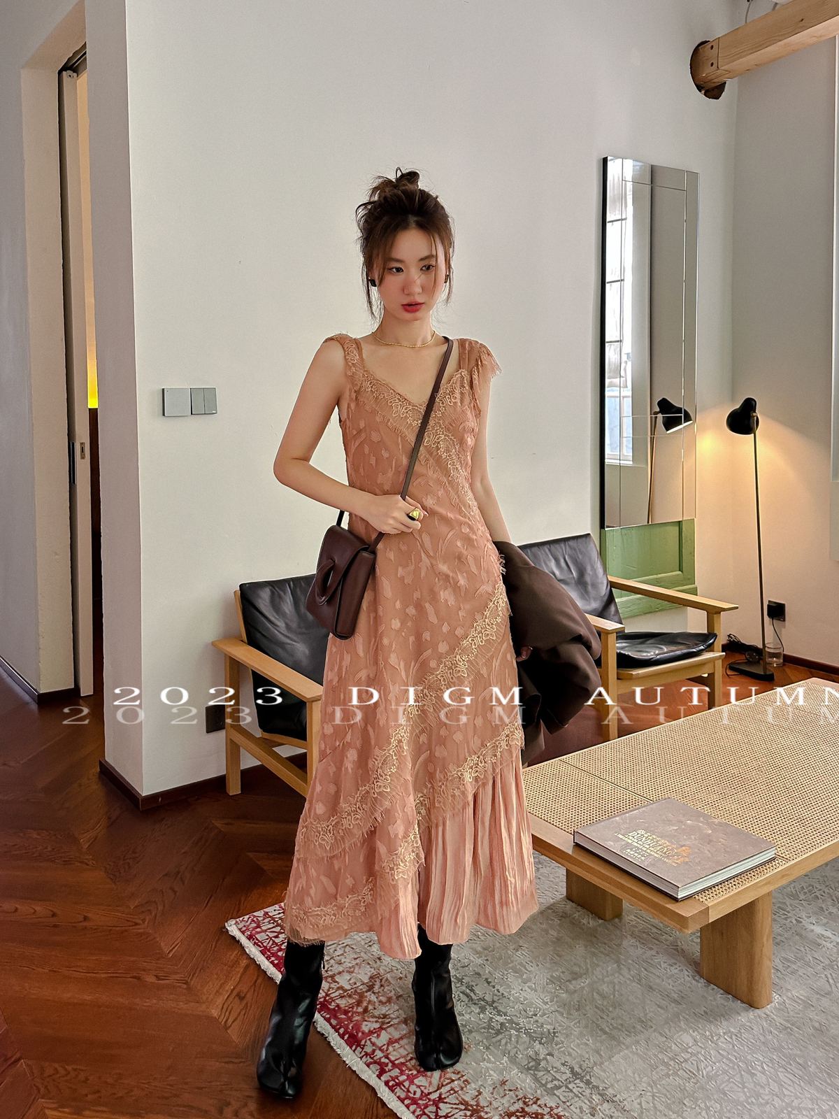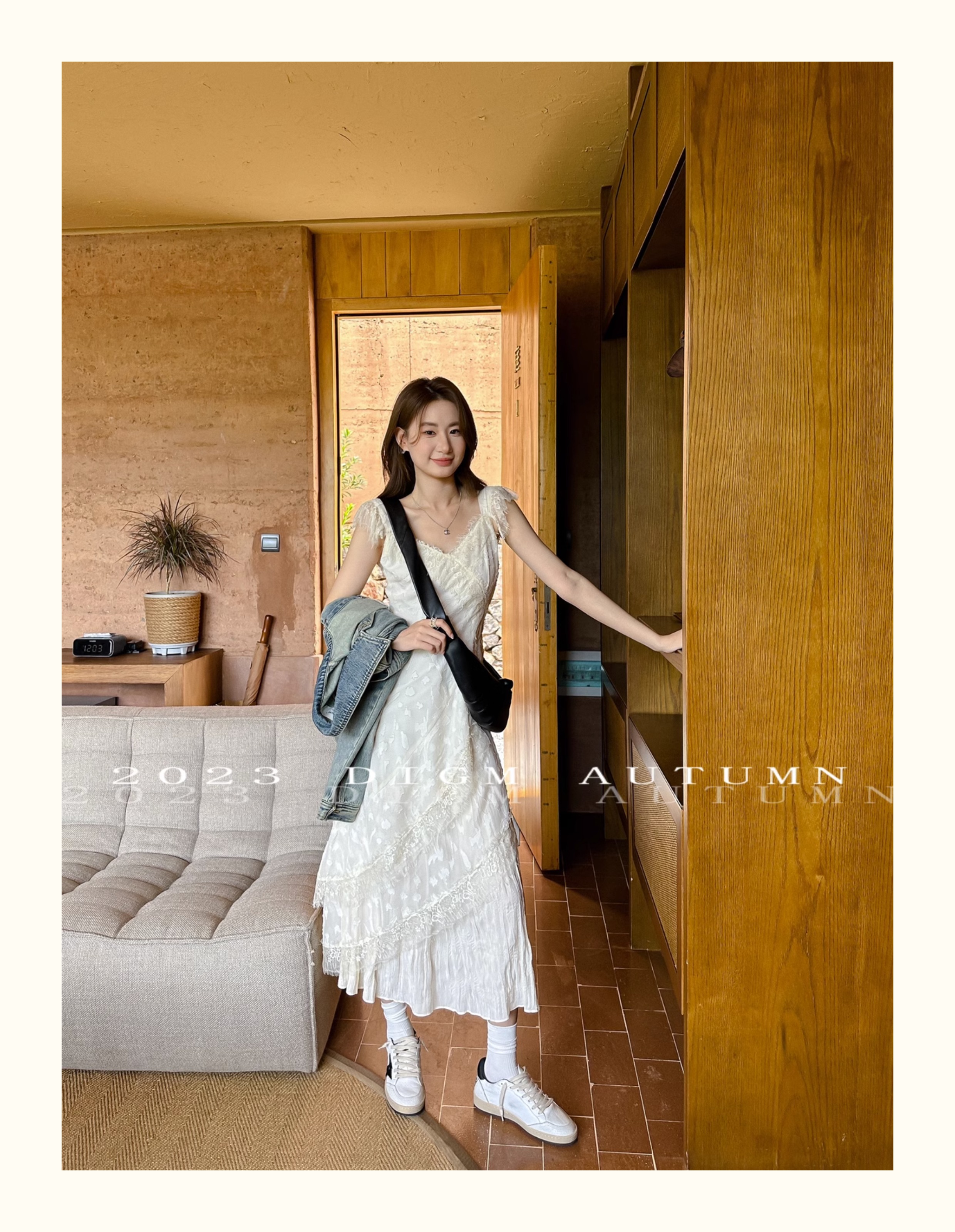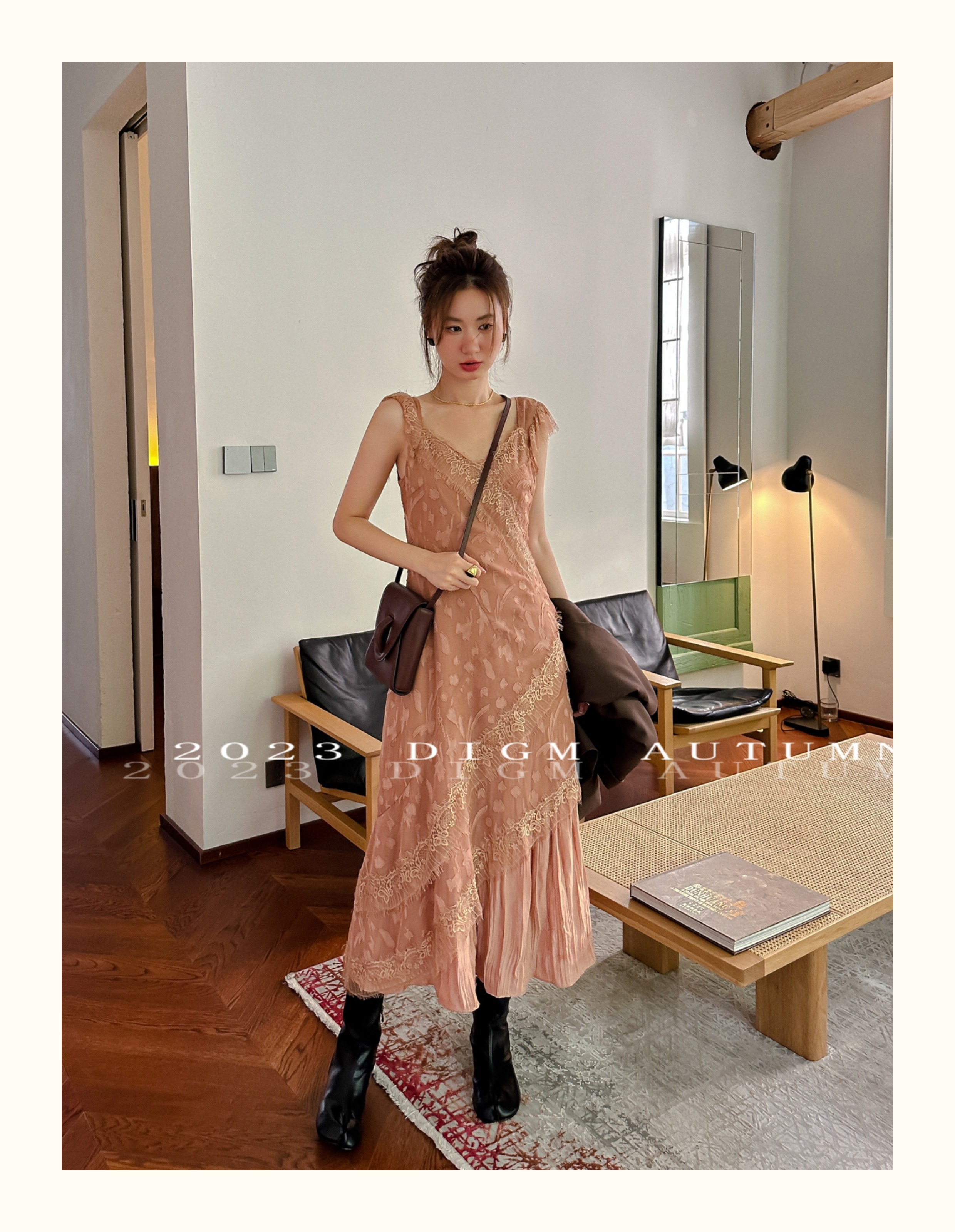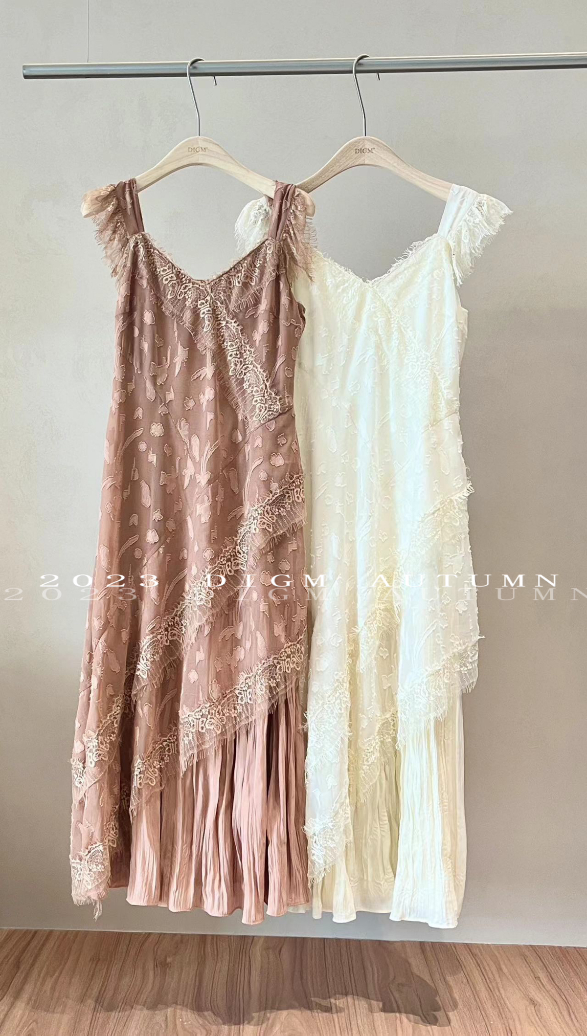 DIGM 法式優雅蕾絲花邊收腰V領洋裝2023秋季氣質荷葉袖中長裙潮