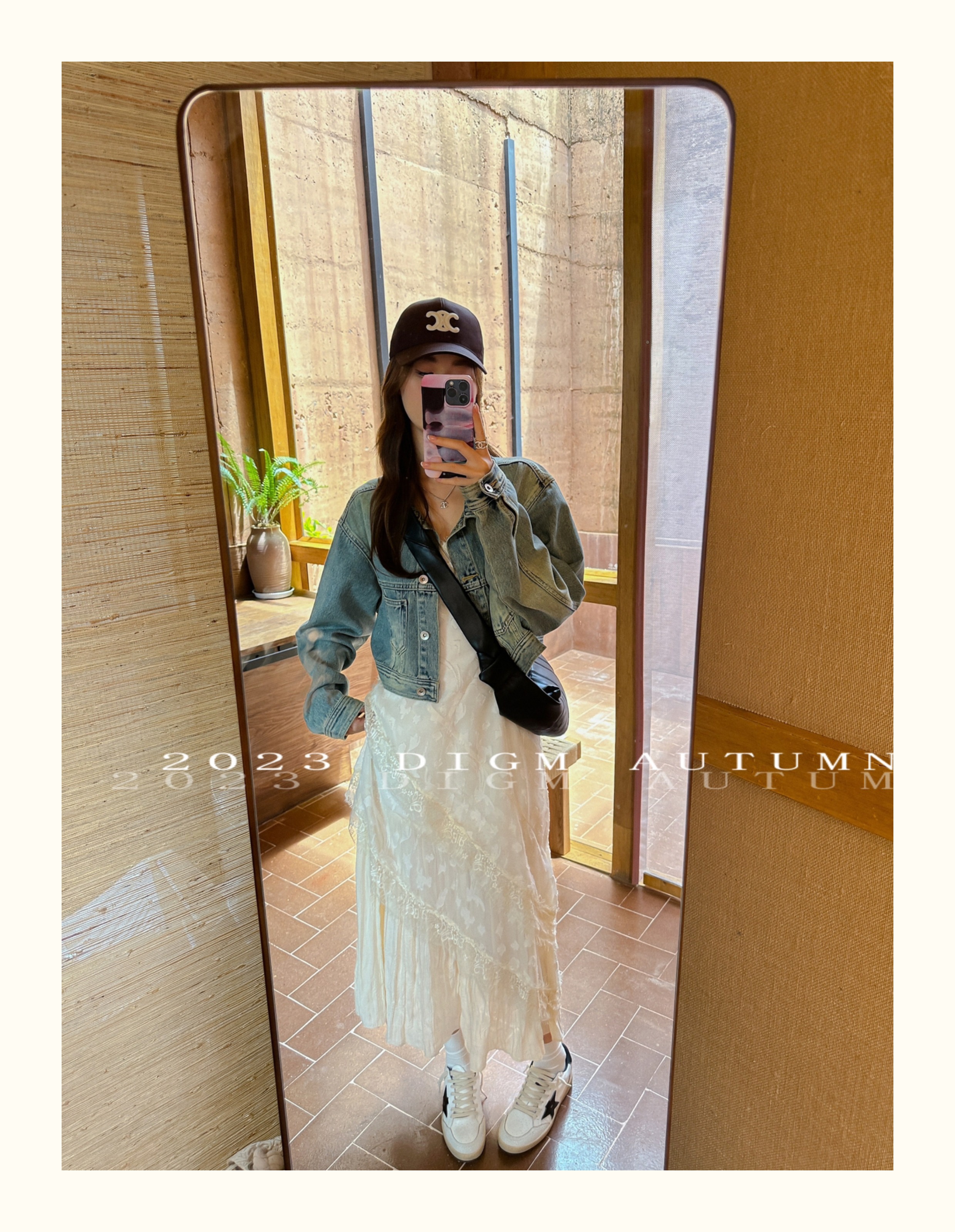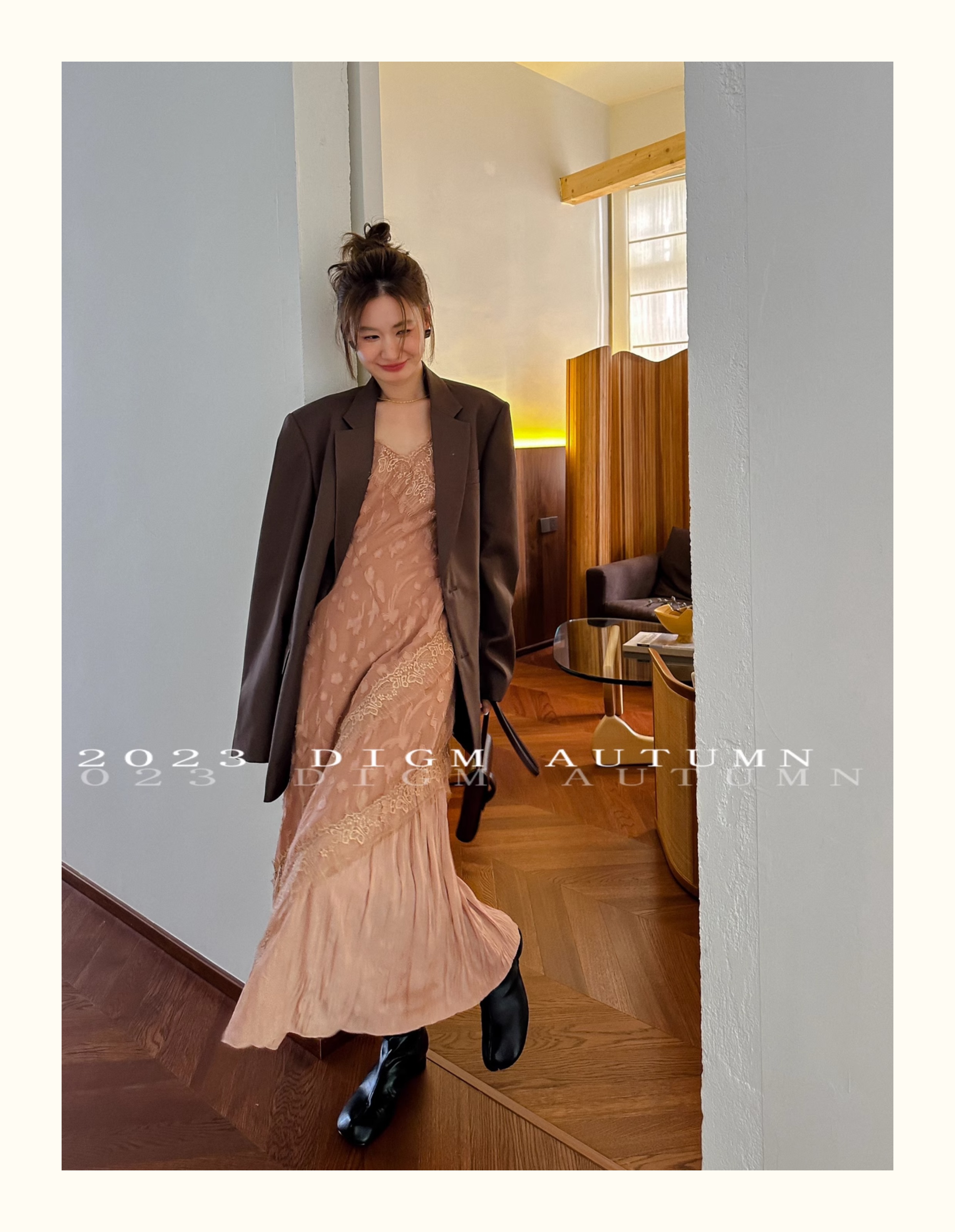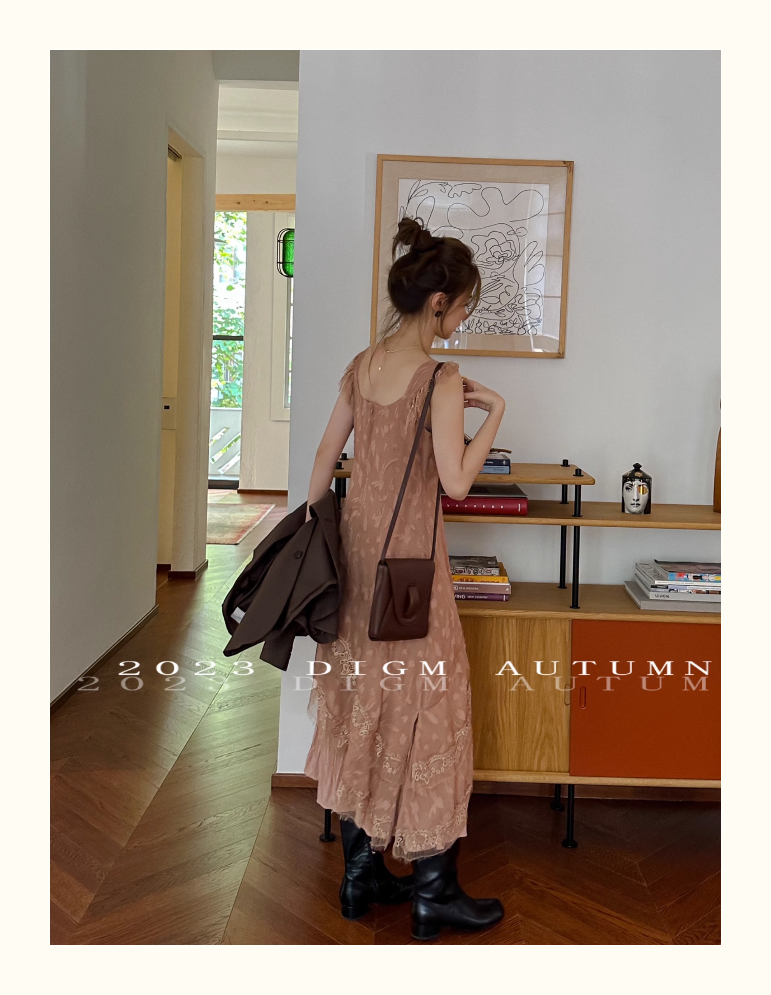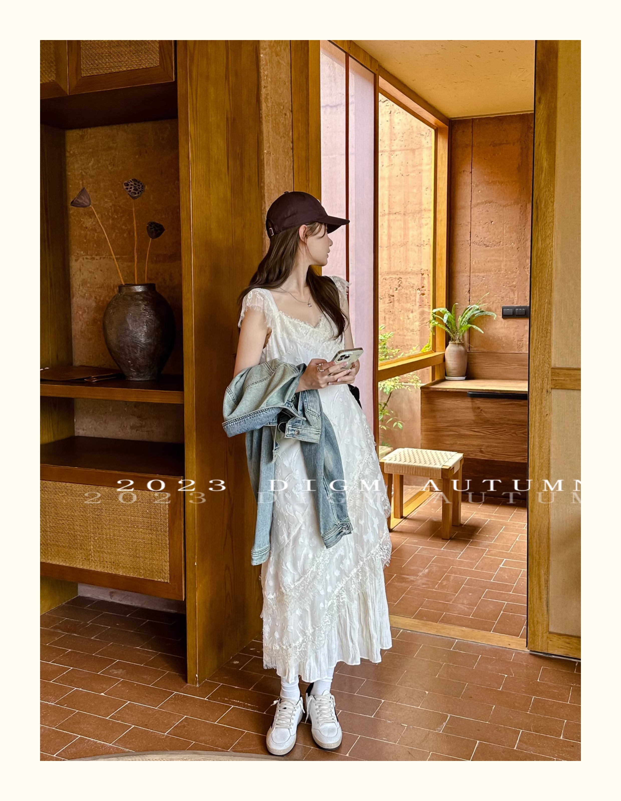 DIGM 法式優雅蕾絲花邊收腰V領洋裝2023秋季氣質荷葉袖中長裙潮