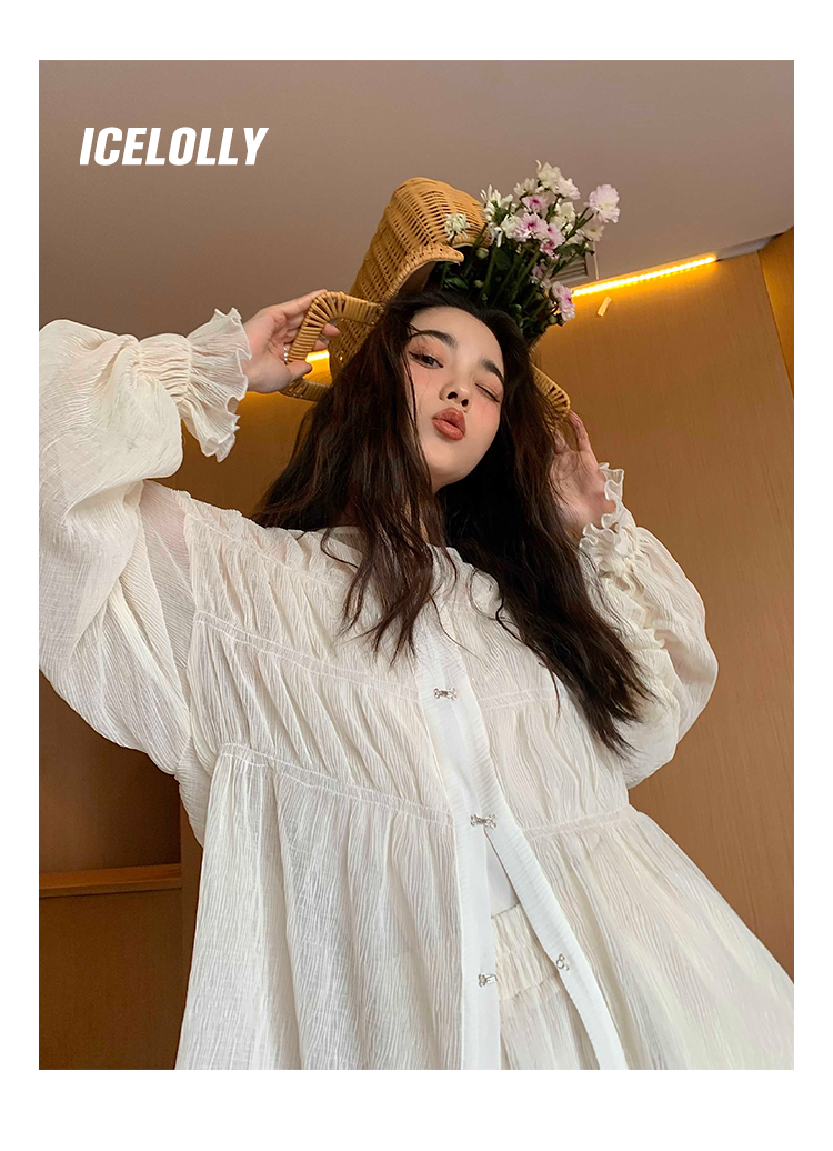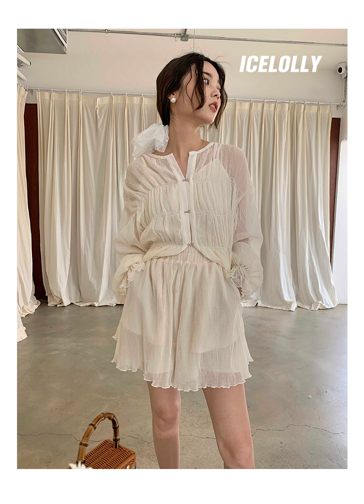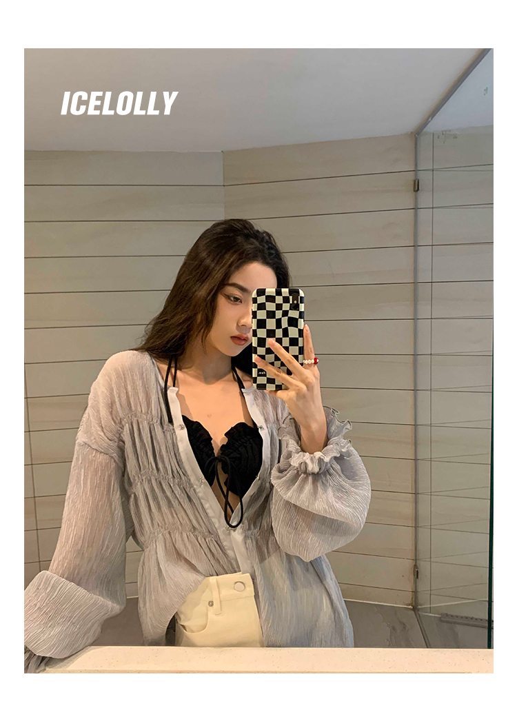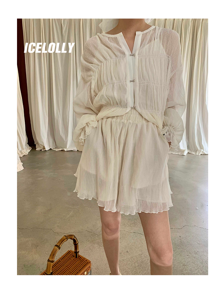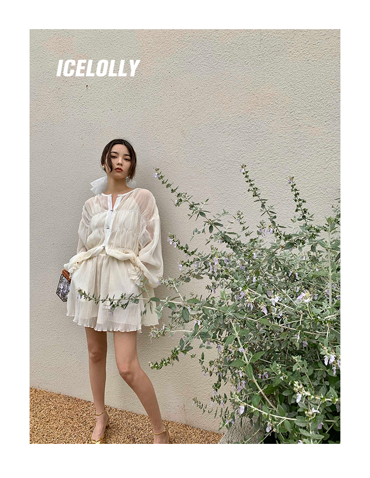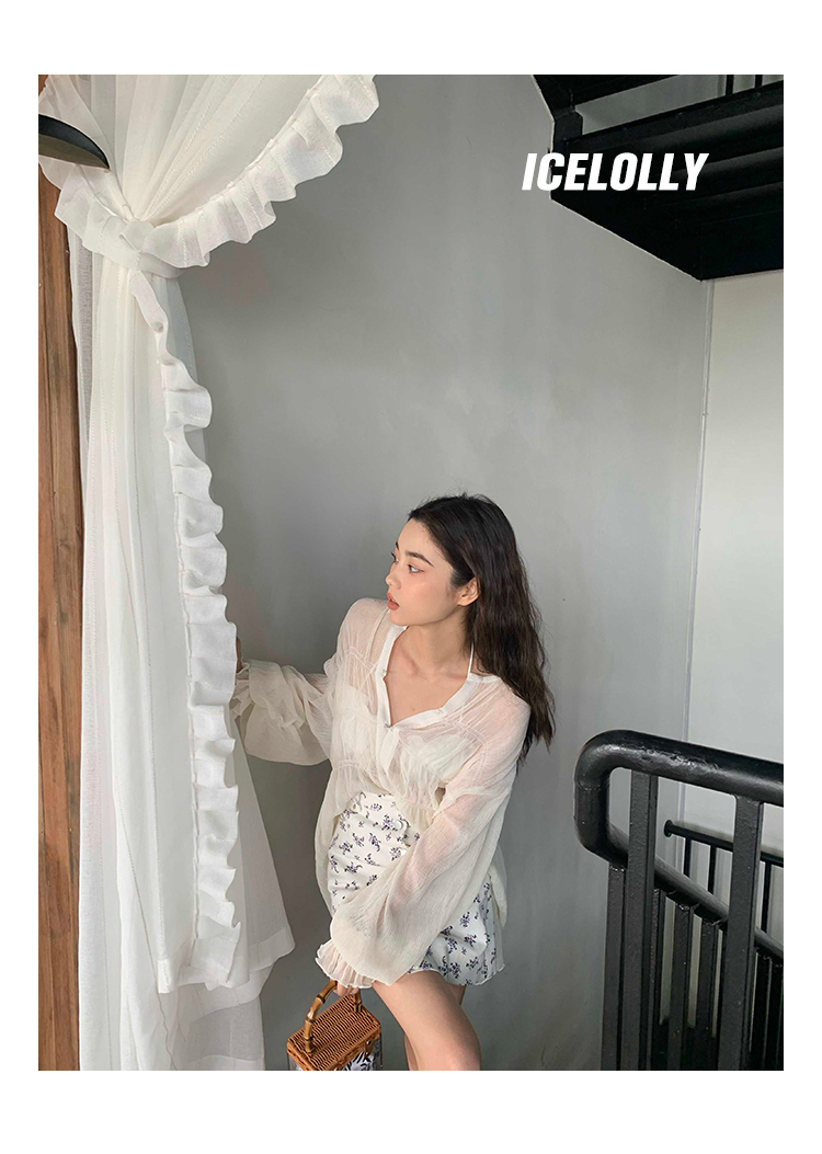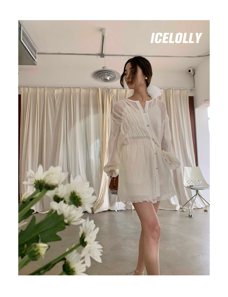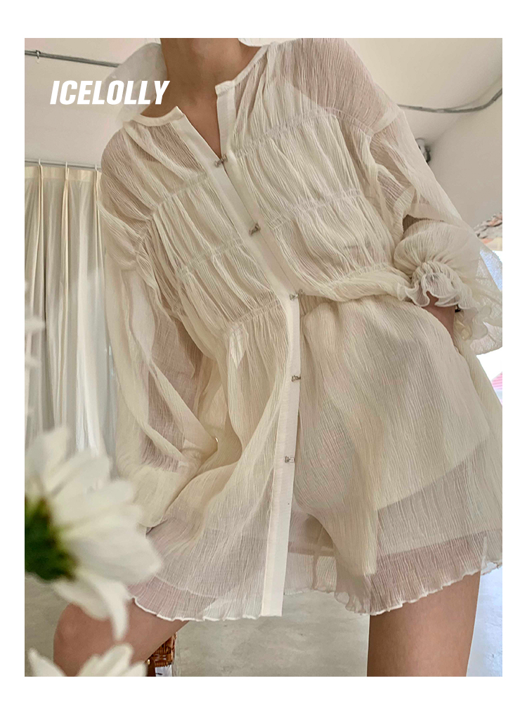 【69元福利款】ICELOLLY法式泡泡袖t襯衫女夏季防曬衫長袖上衣套裝