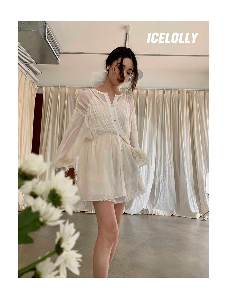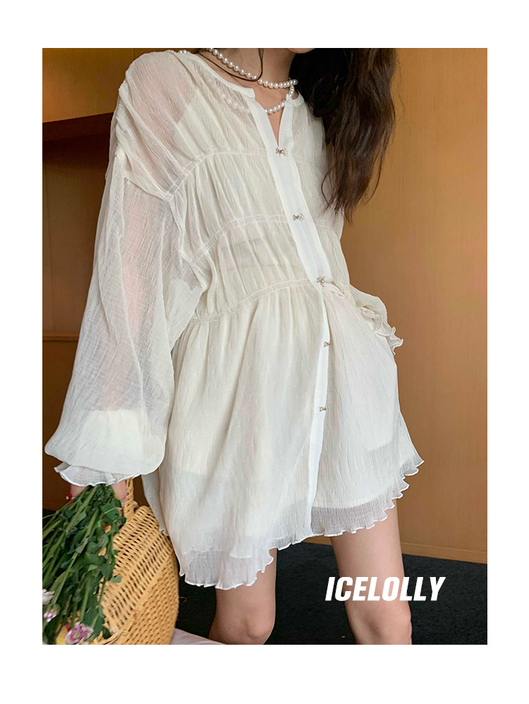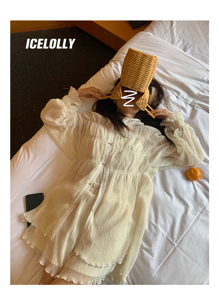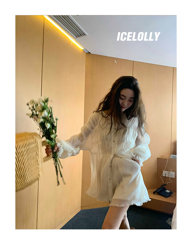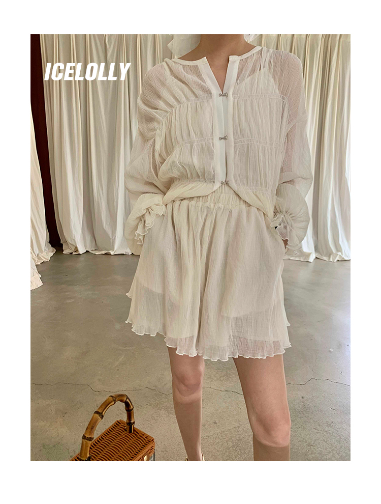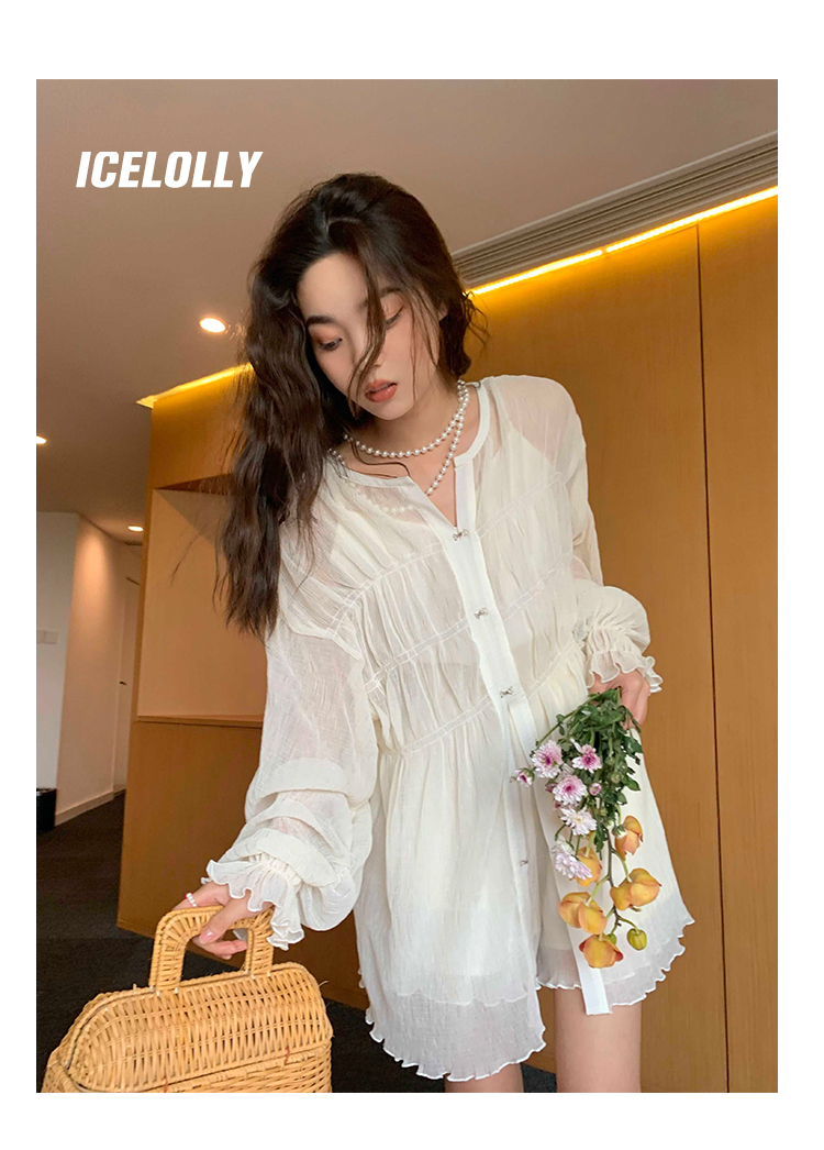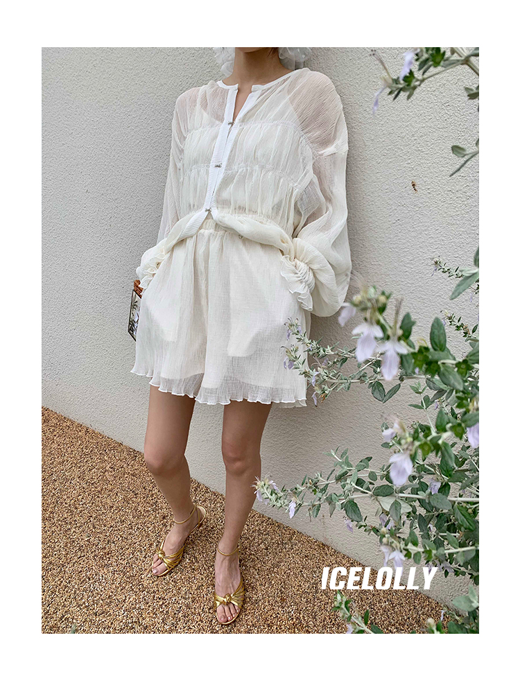 【69元福利款】ICELOLLY法式泡泡袖t襯衫女夏季防曬衫長袖上衣套裝