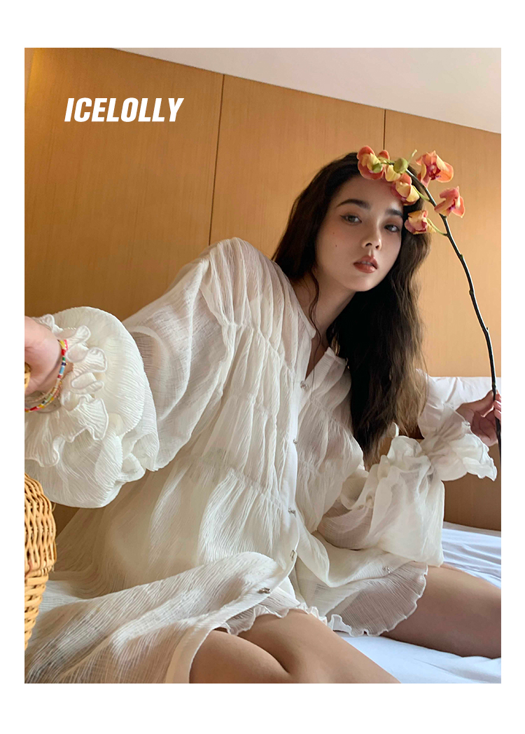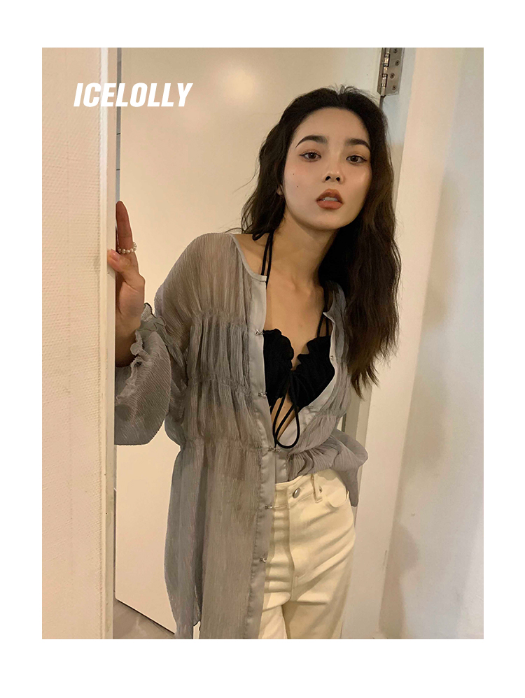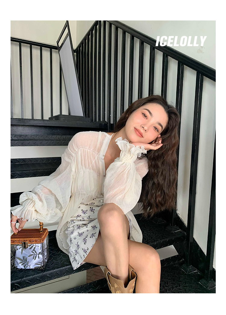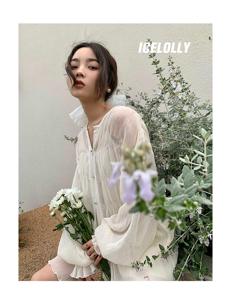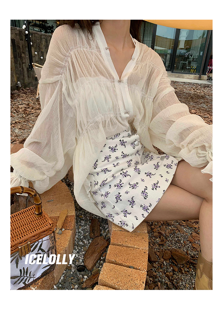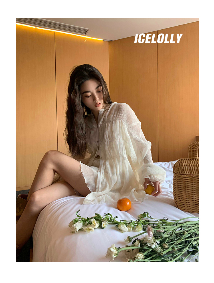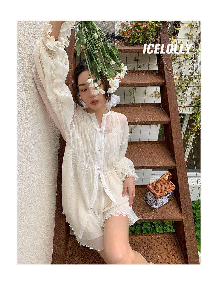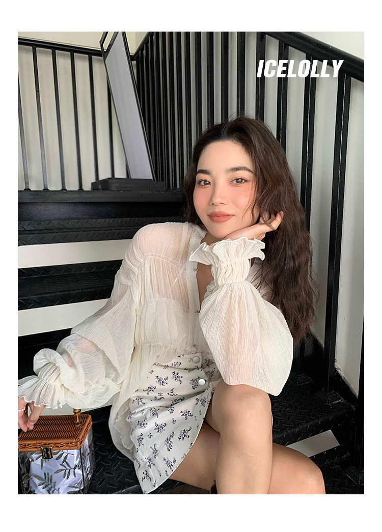 【69元福利款】ICELOLLY法式泡泡袖t襯衫女夏季防曬衫長袖上衣套裝