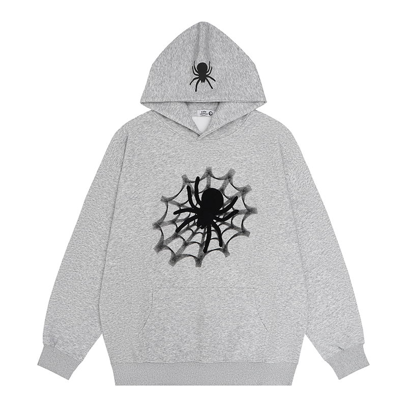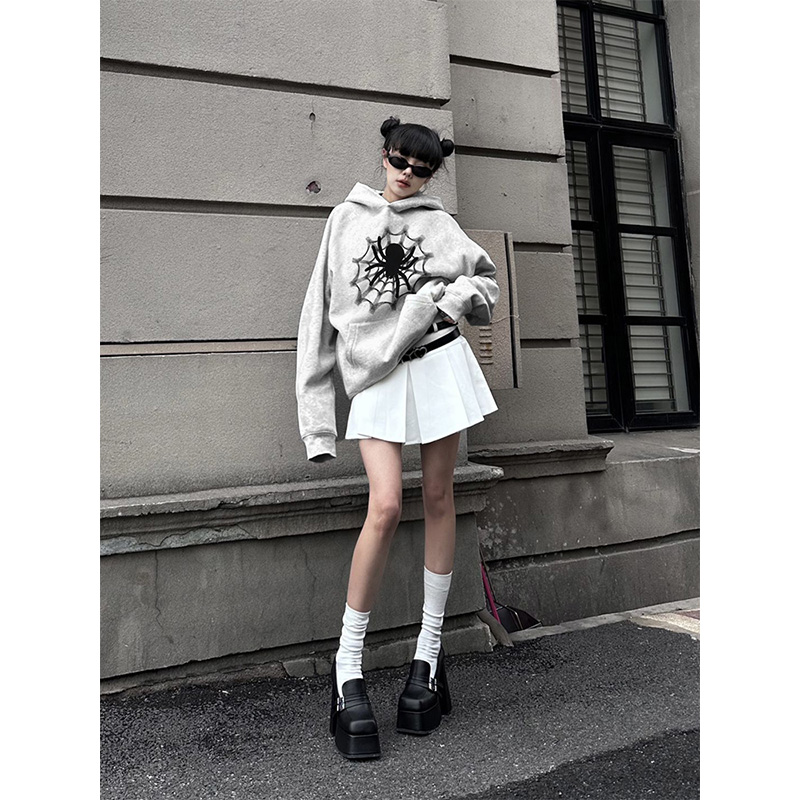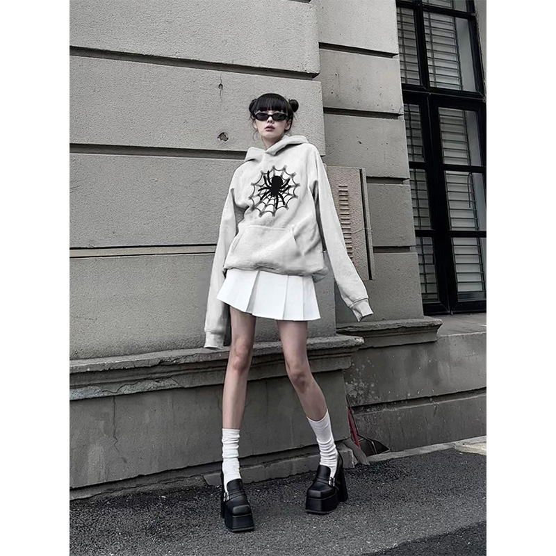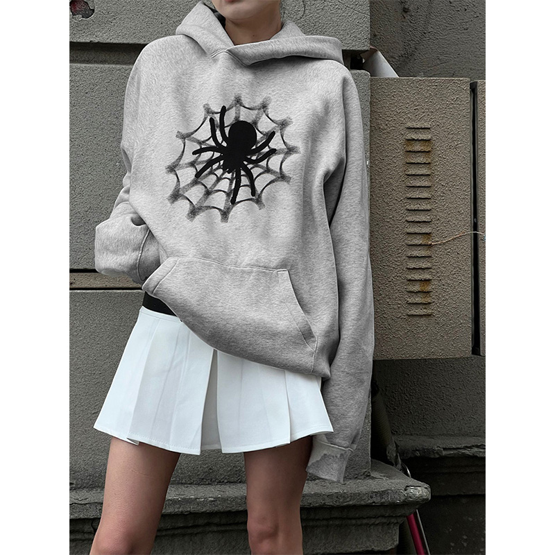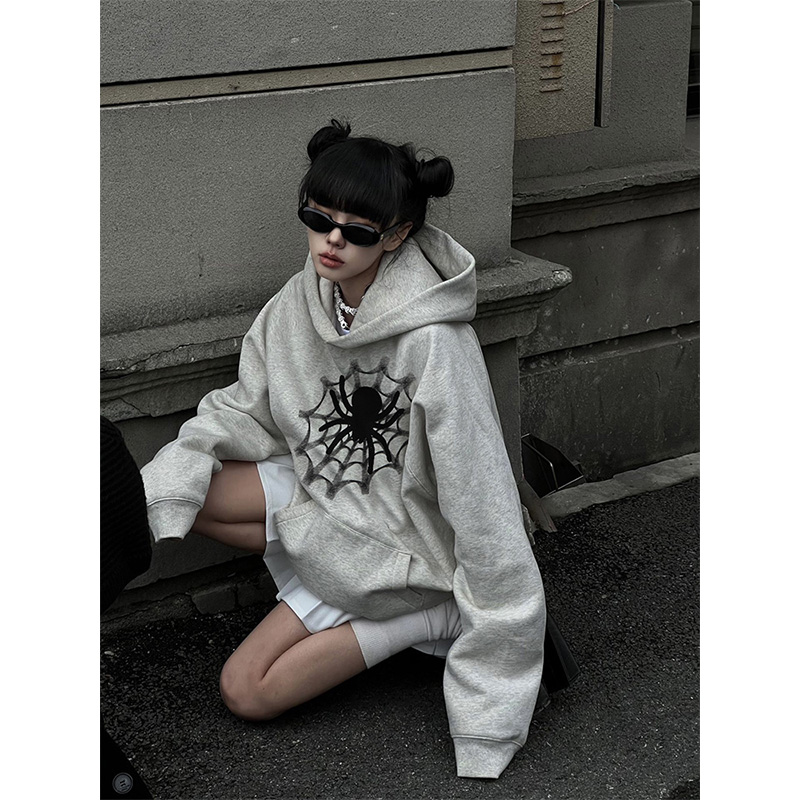 oversize灰色連帽運動衫女春秋薄款蜘蛛印花美式復古寬鬆hiphop潮牌