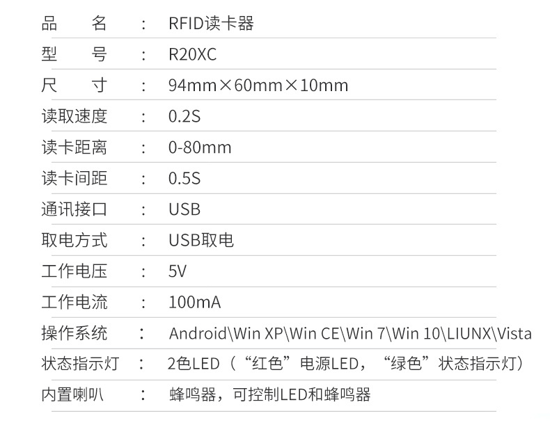 R20XC是一款13.56Hz免驱动只读IC标签序列号的迷你小尺寸读卡设备。在使用过程中,可以随意拨插(即插即用),不用外加电源,用户不用加载任何驱动程序通过数据接口输出至电脑,相当于自动键盘输号