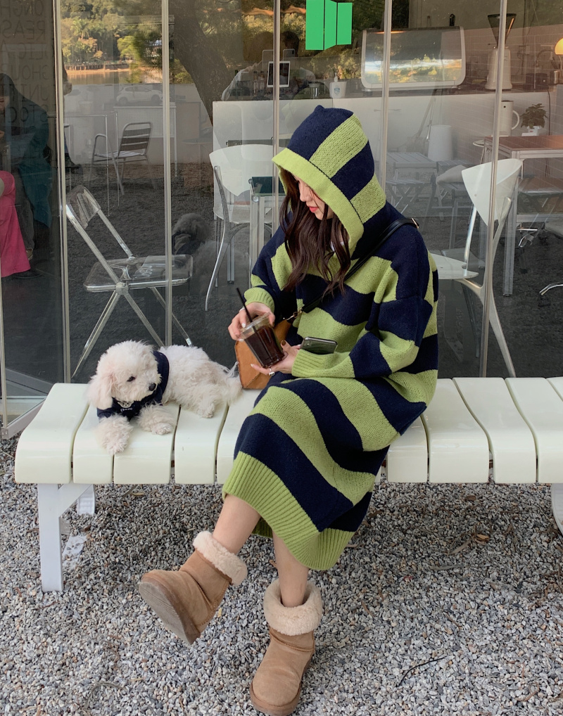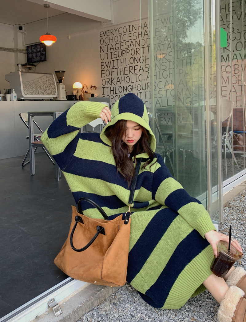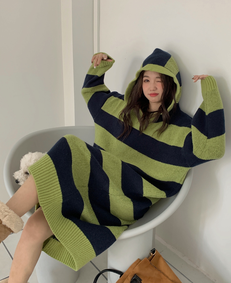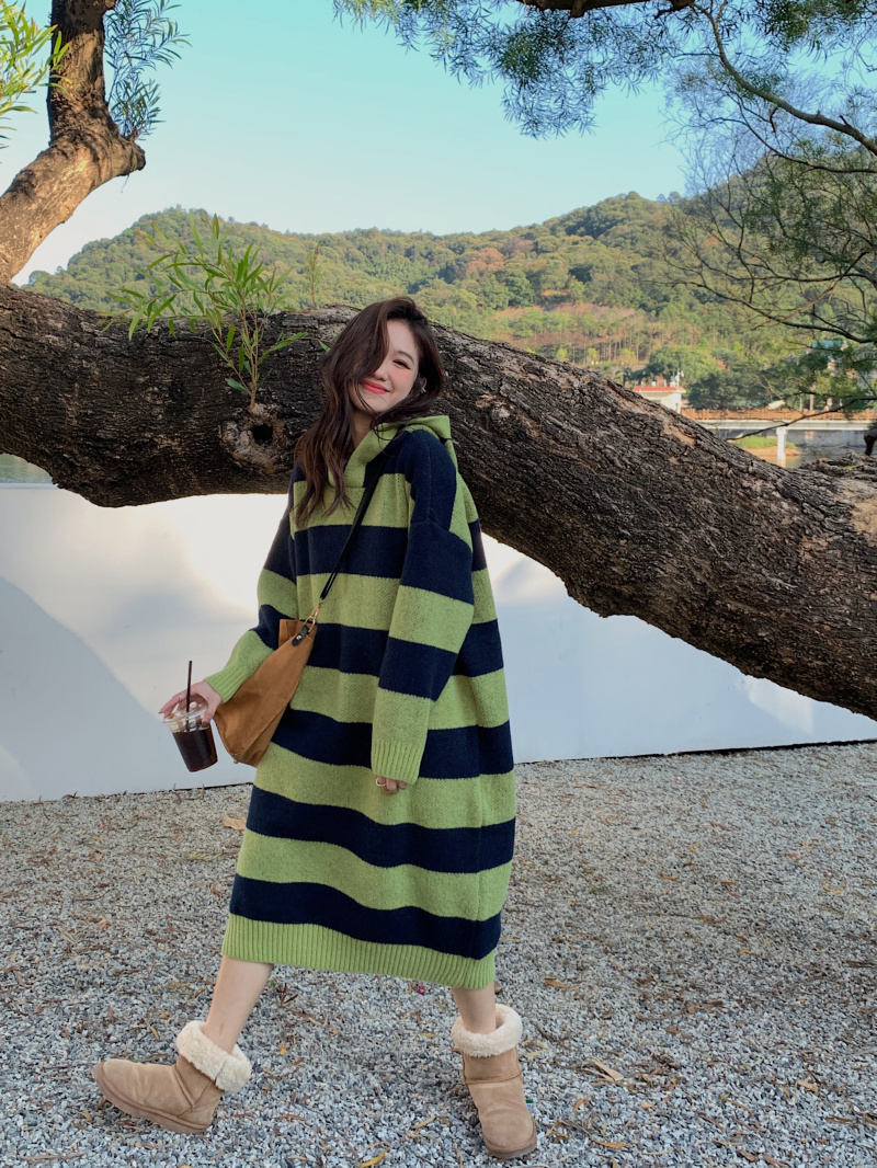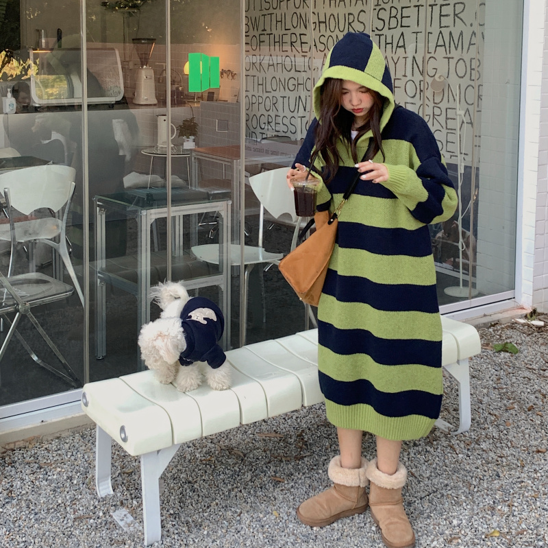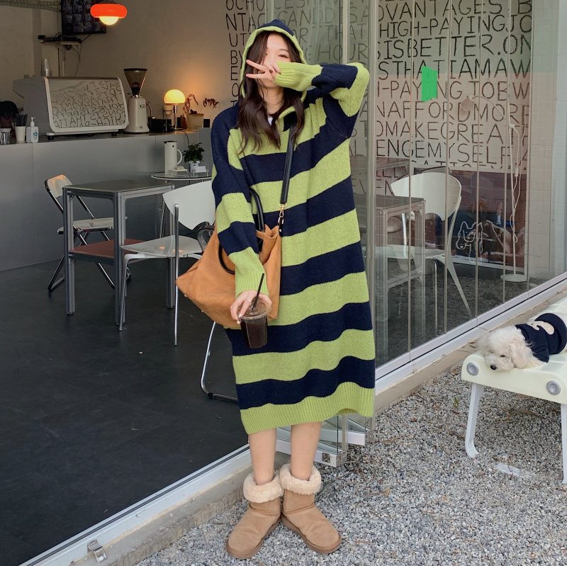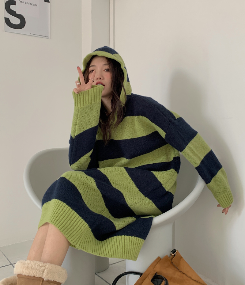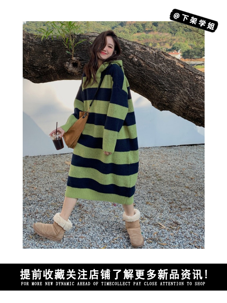 復古條紋套頭連帽毛衣洋裝女秋冬2023新款慵懶風寬鬆中長版裙子