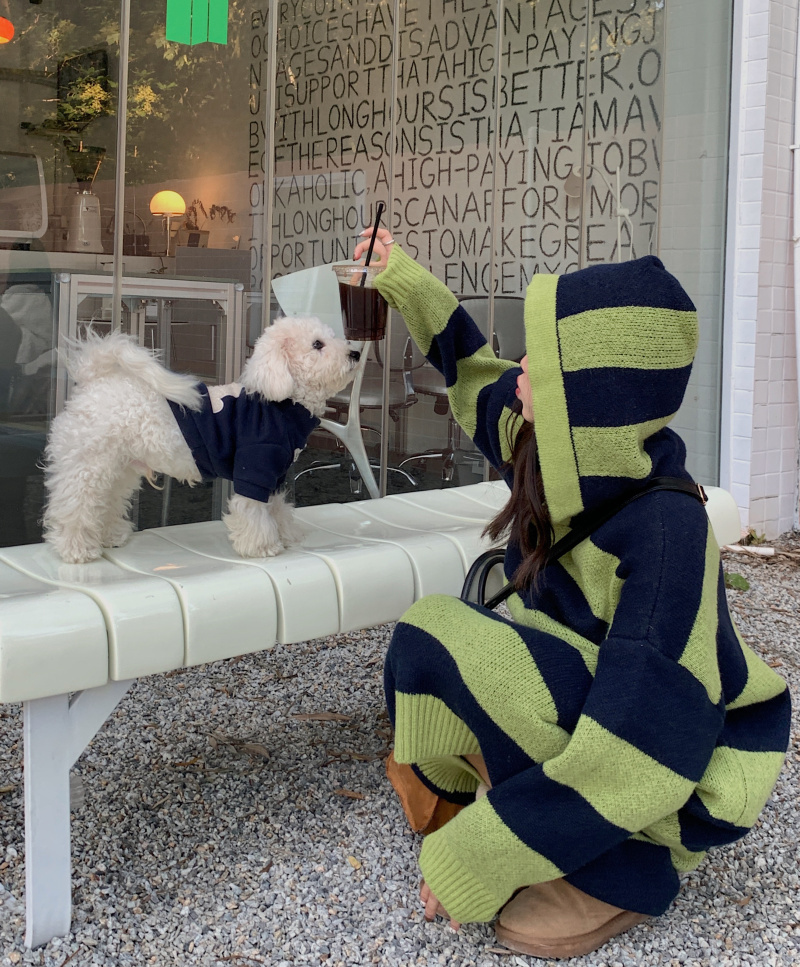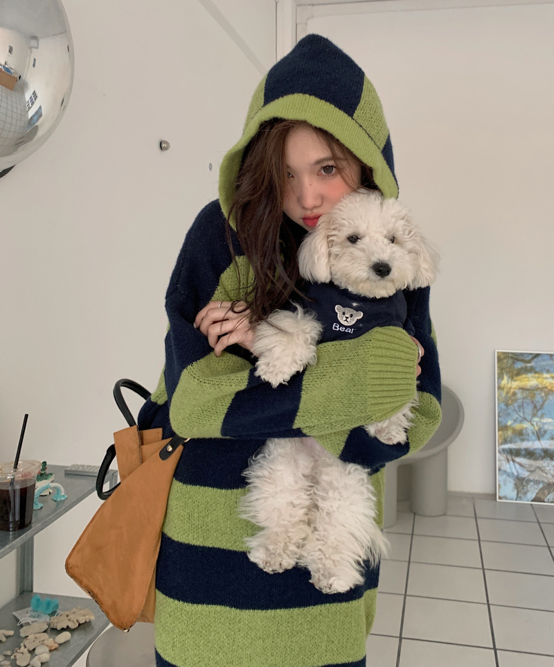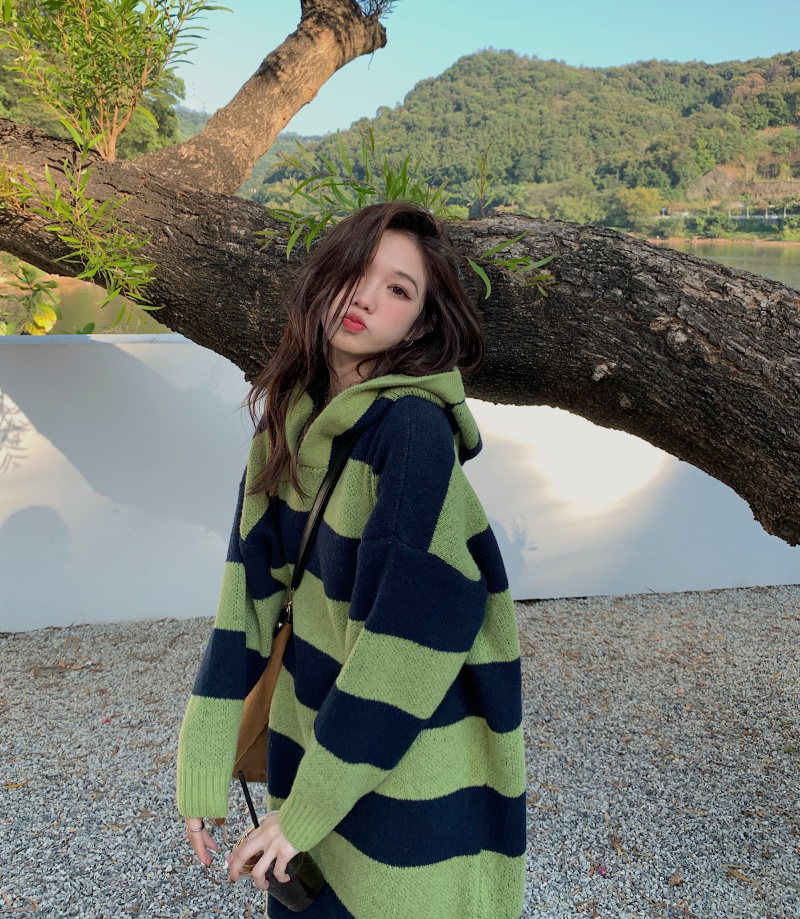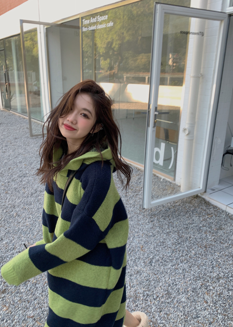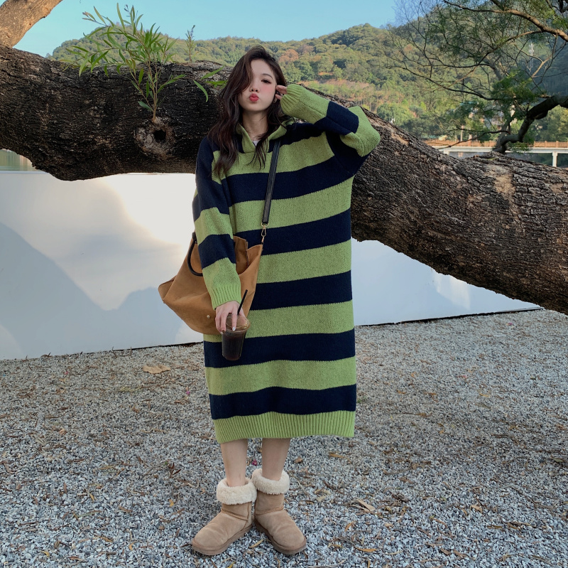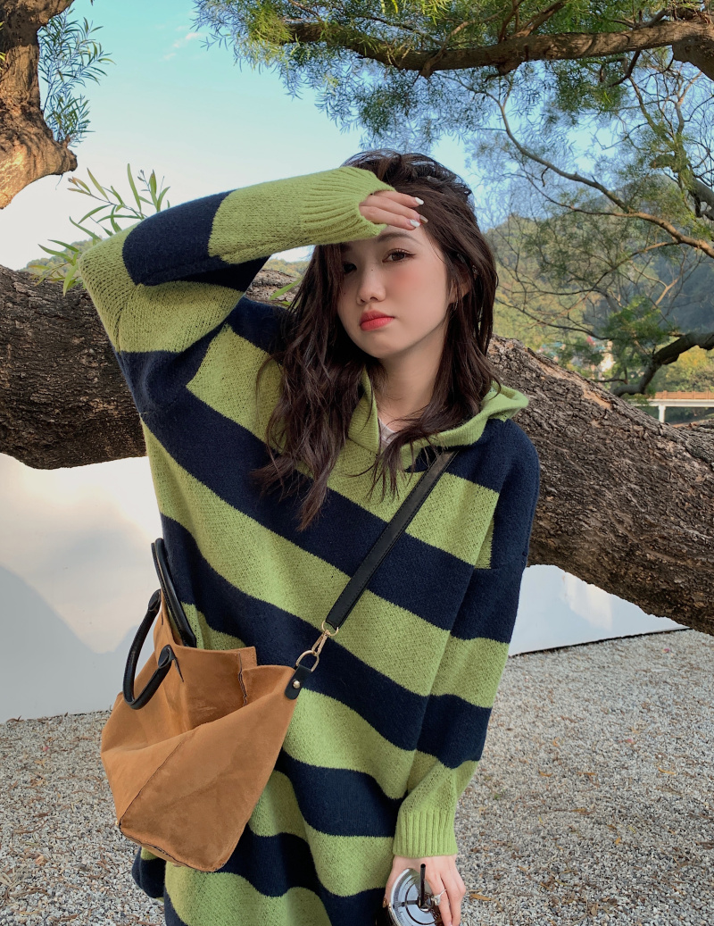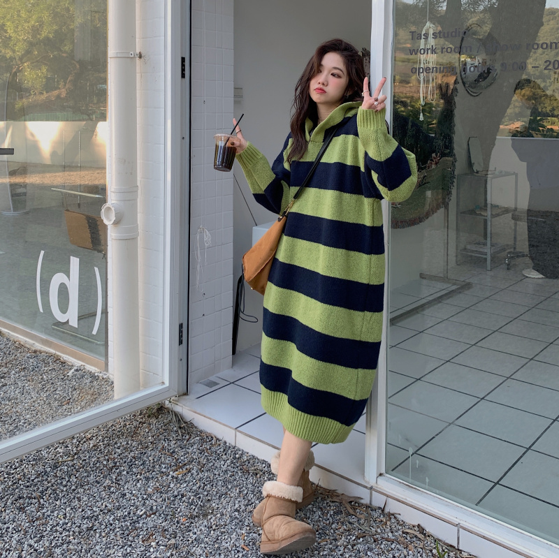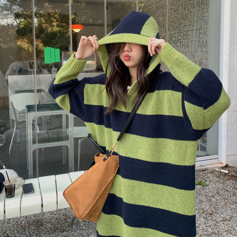 復古條紋套頭連帽毛衣洋裝女秋冬2023新款慵懶風寬鬆中長版裙子