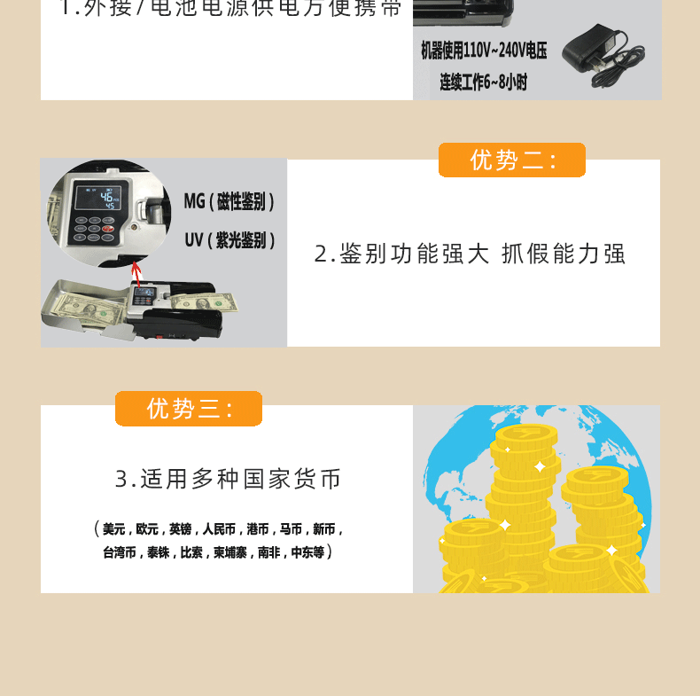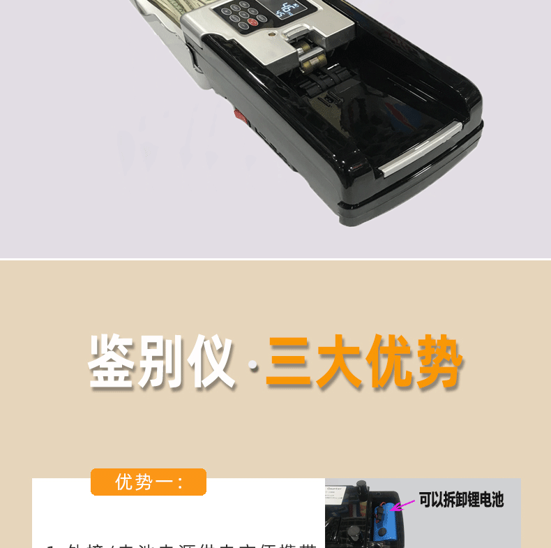 这是一款新颖的点钞机,它具有计数精确,体积小,重量轻,外形美观,个人携带方便、可充电、断电可持续工作等特点。是商家、超市,出租车及个人等理财的理想选择。