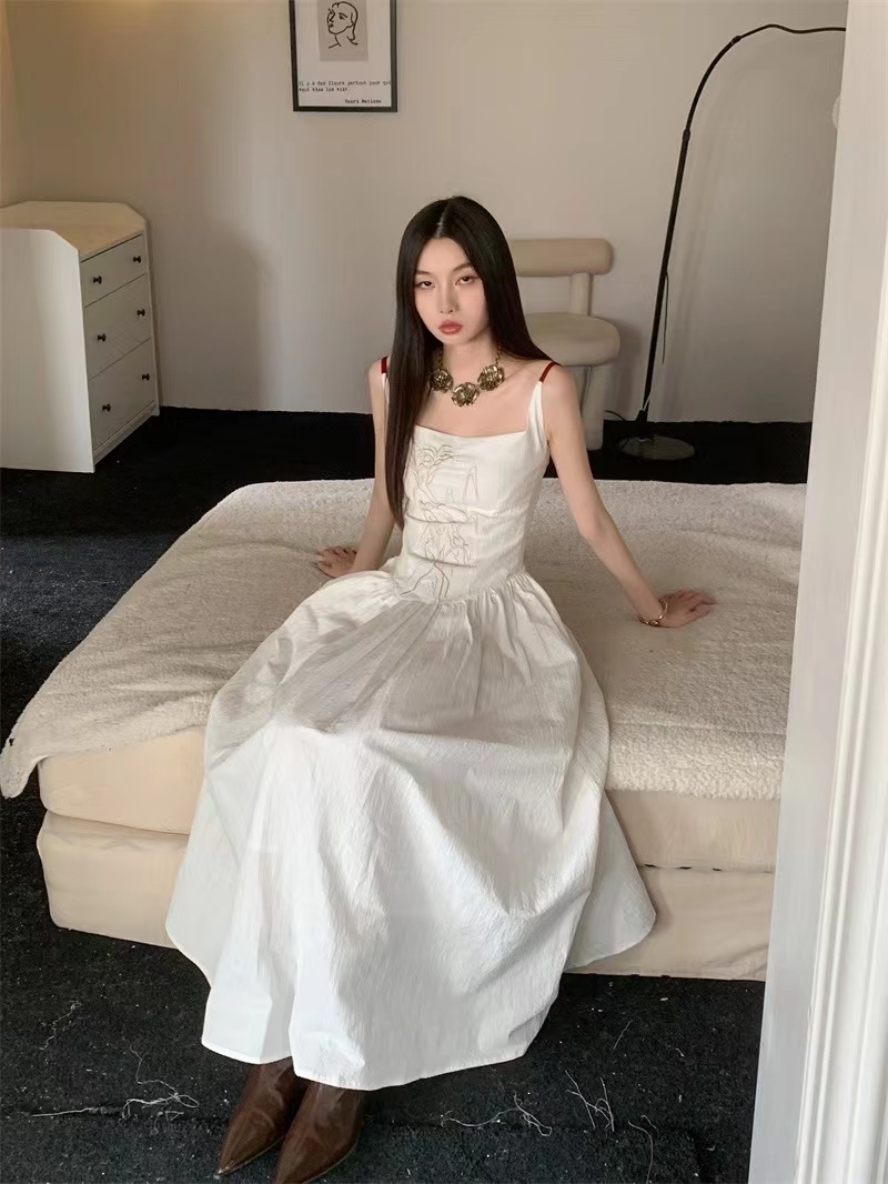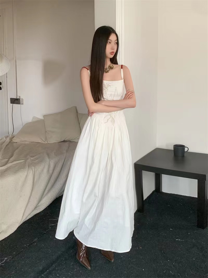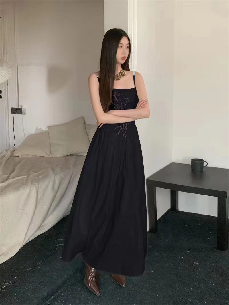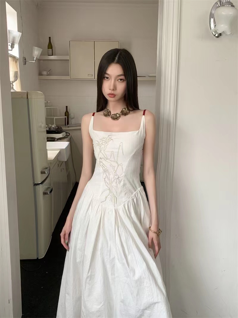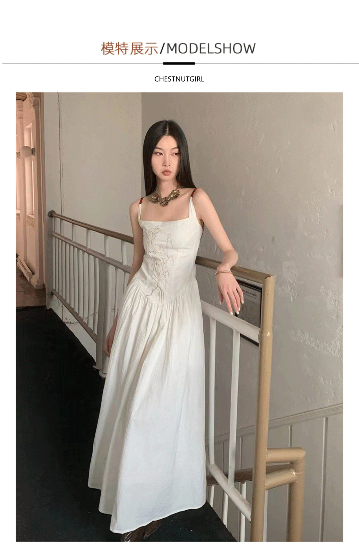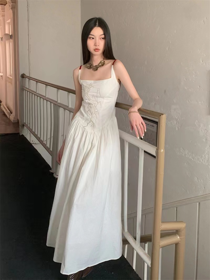新中式國風刺繡棉質長版露背顯瘦吊帶度假洋裝