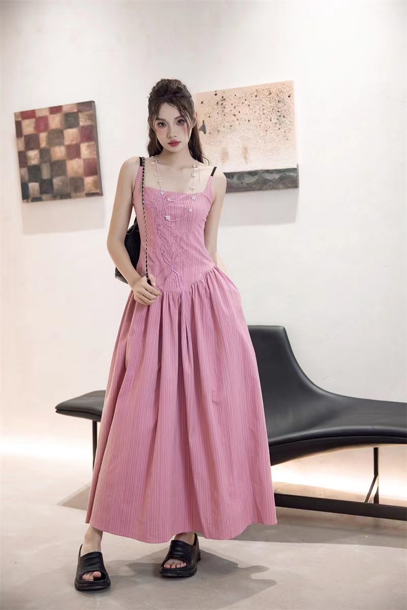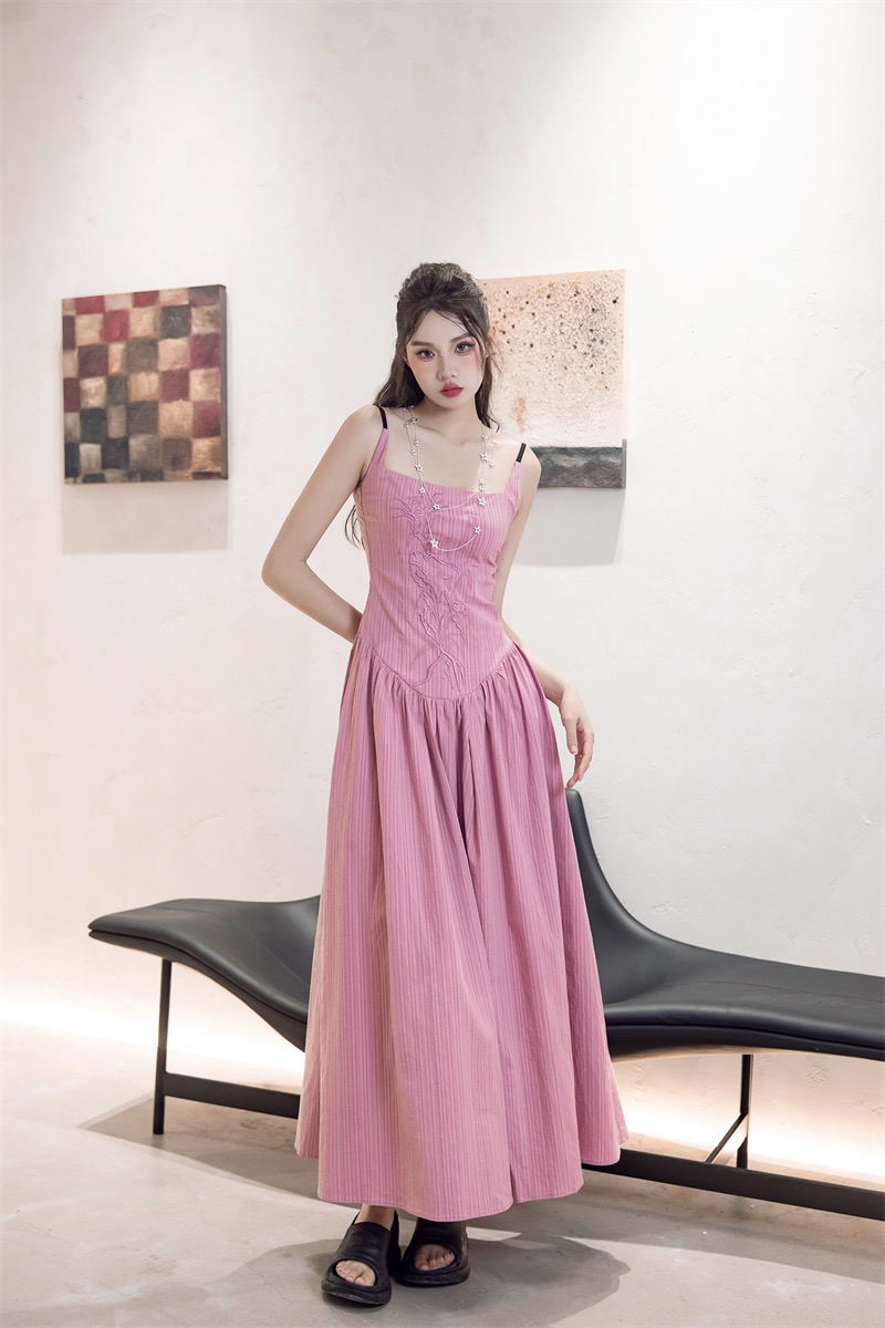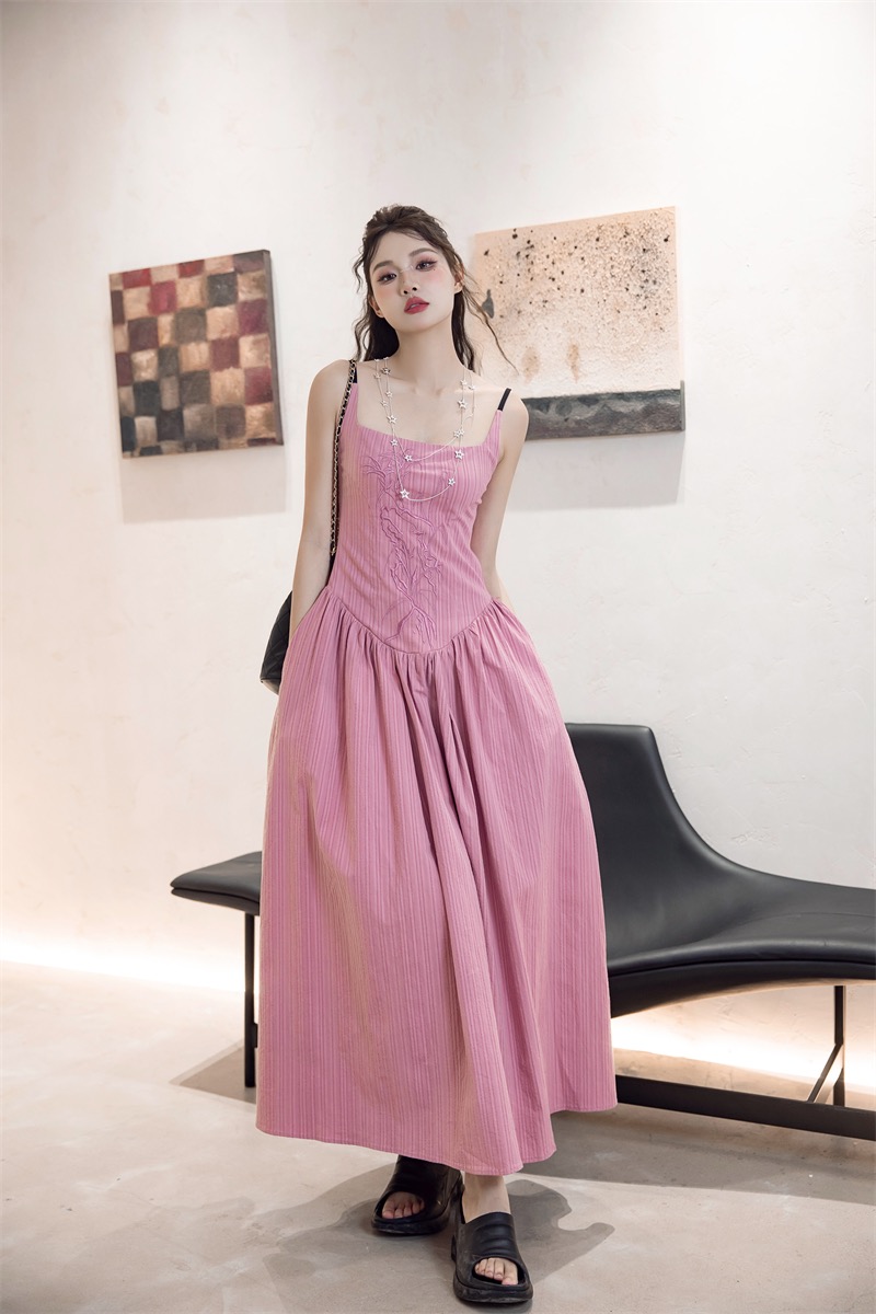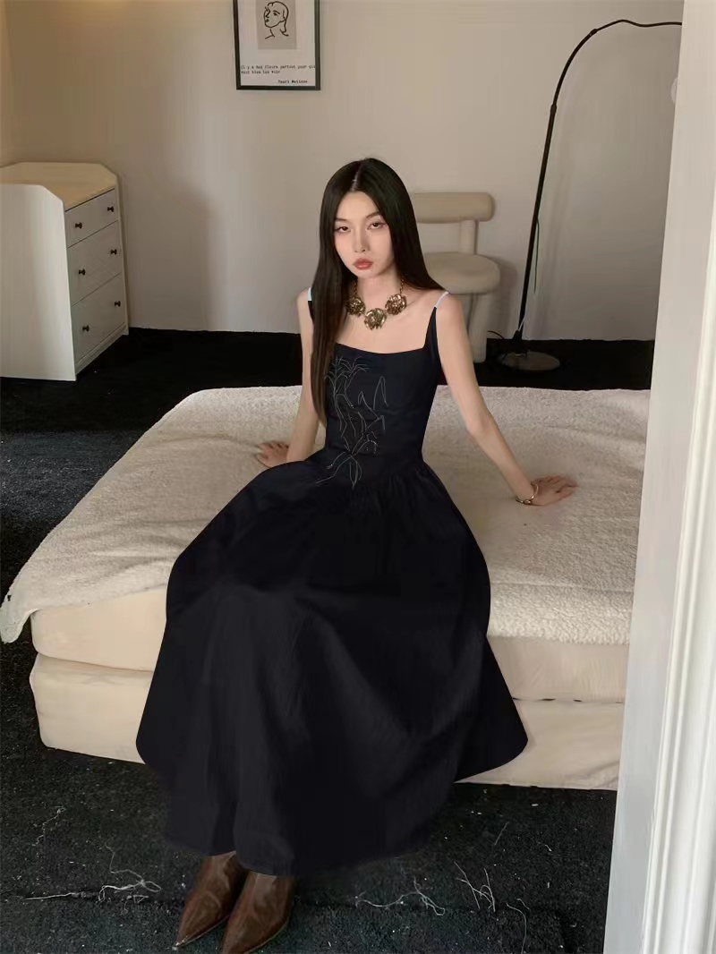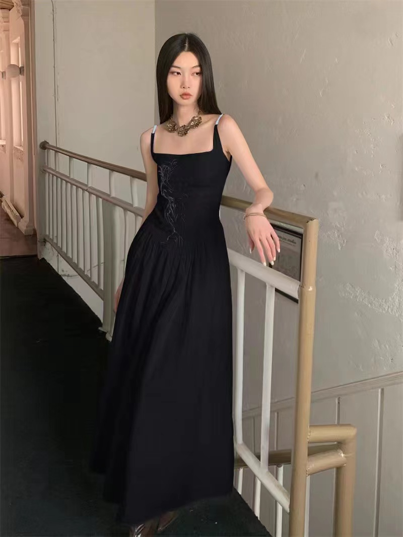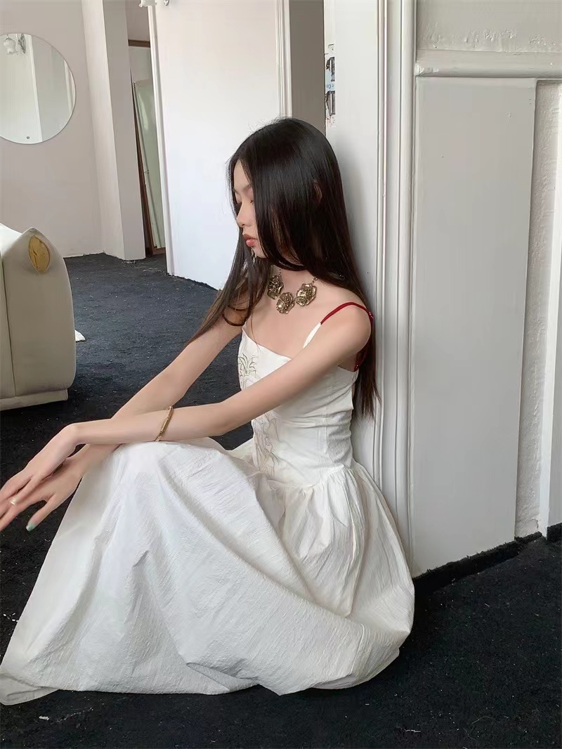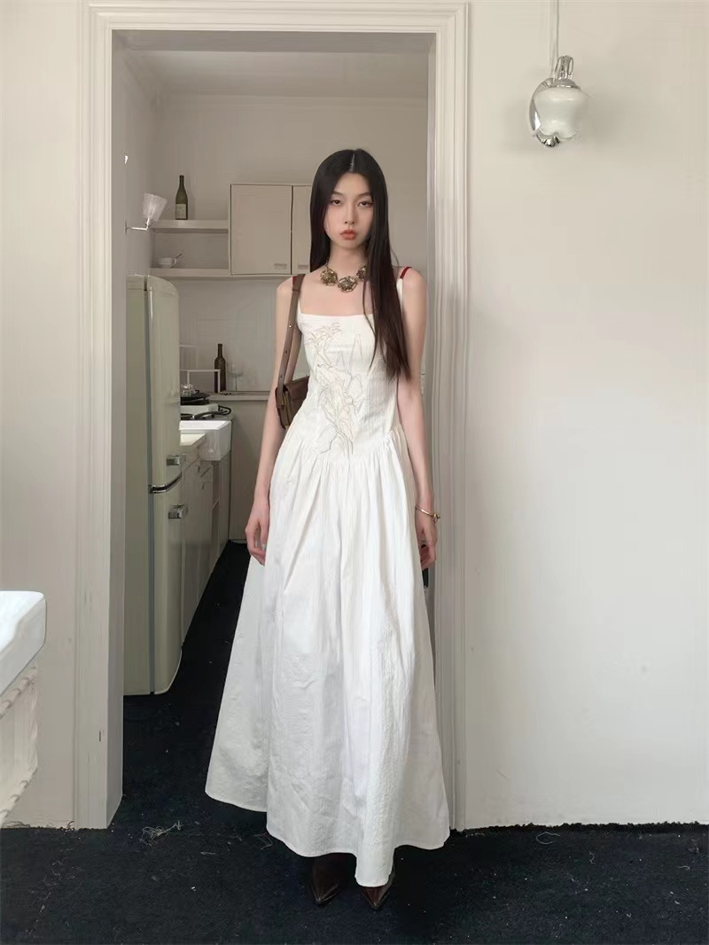 新中式國風刺繡棉質長版露背顯瘦吊帶度假洋裝