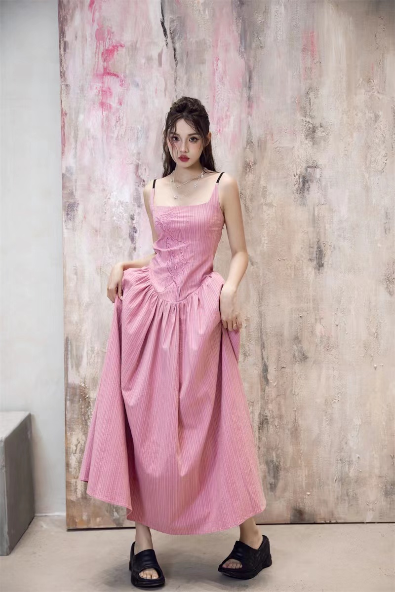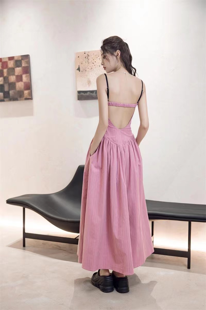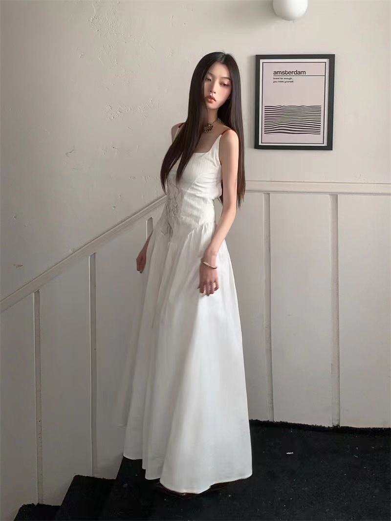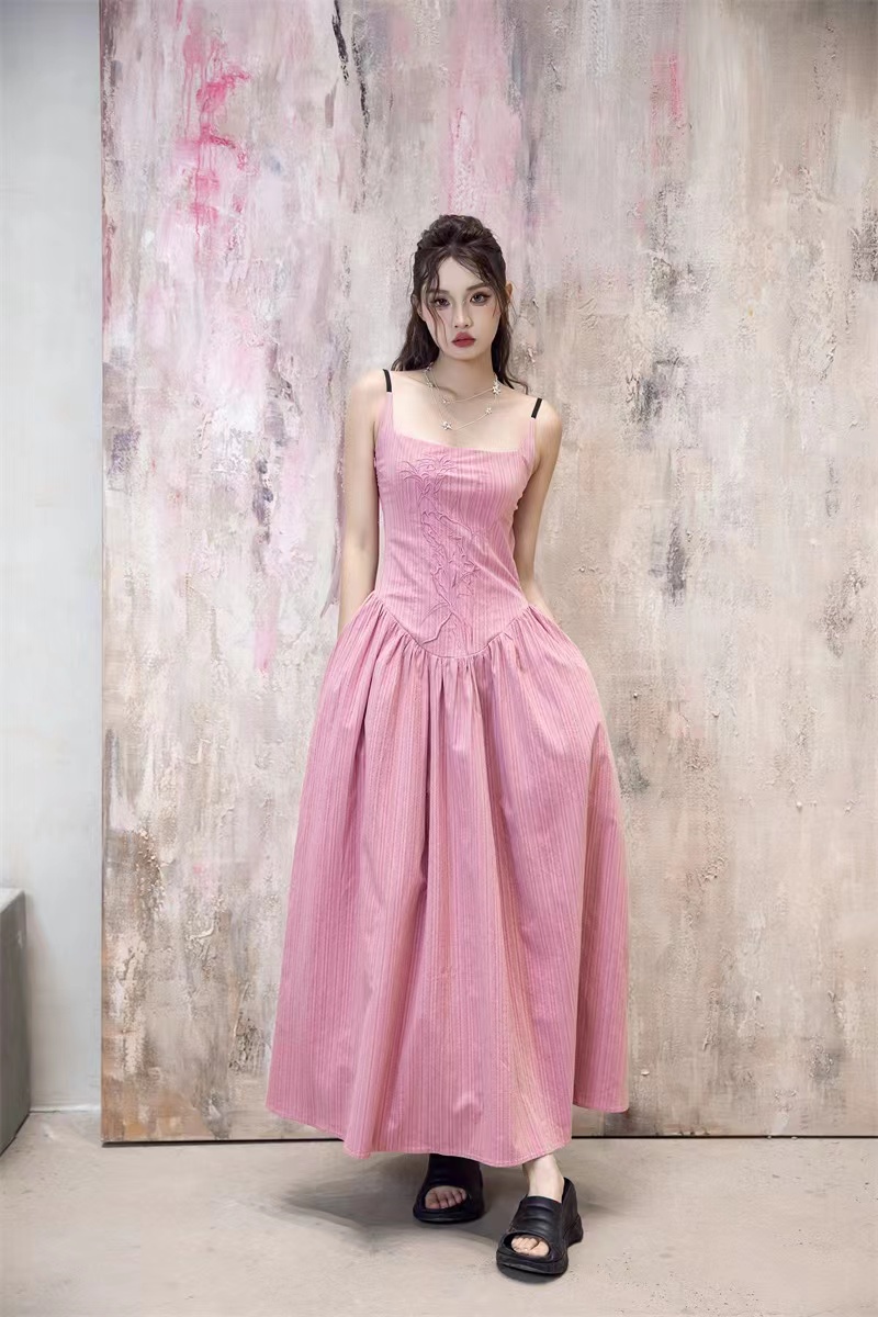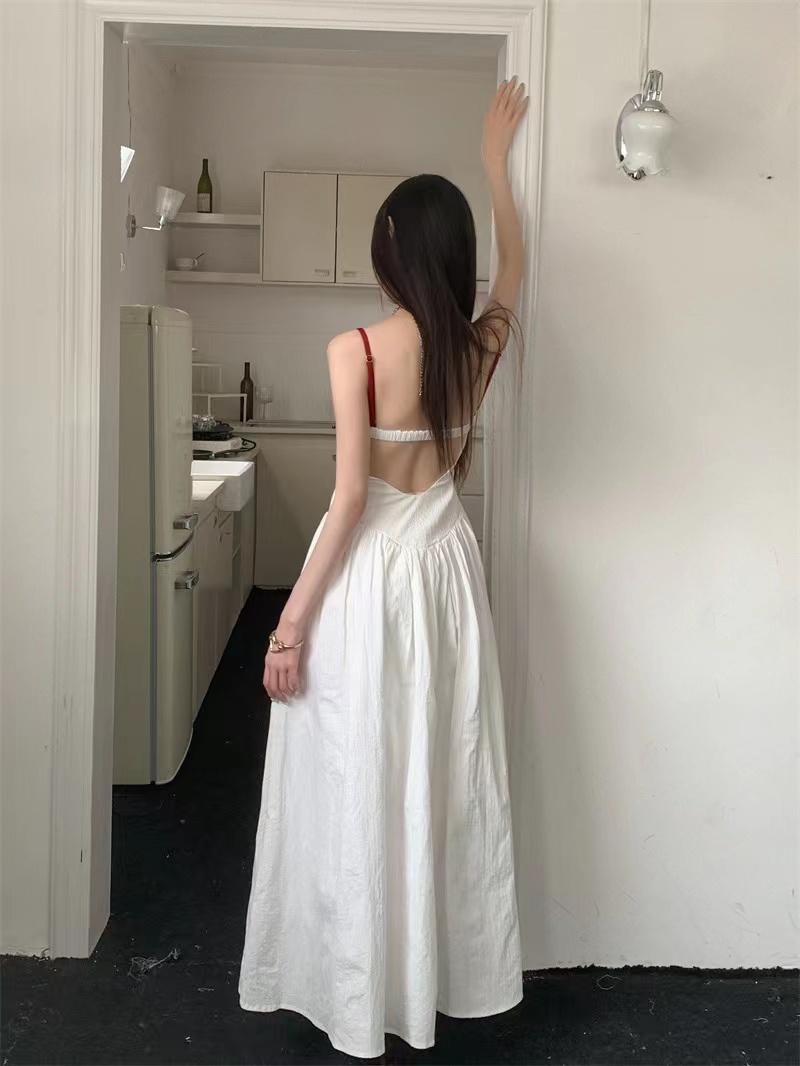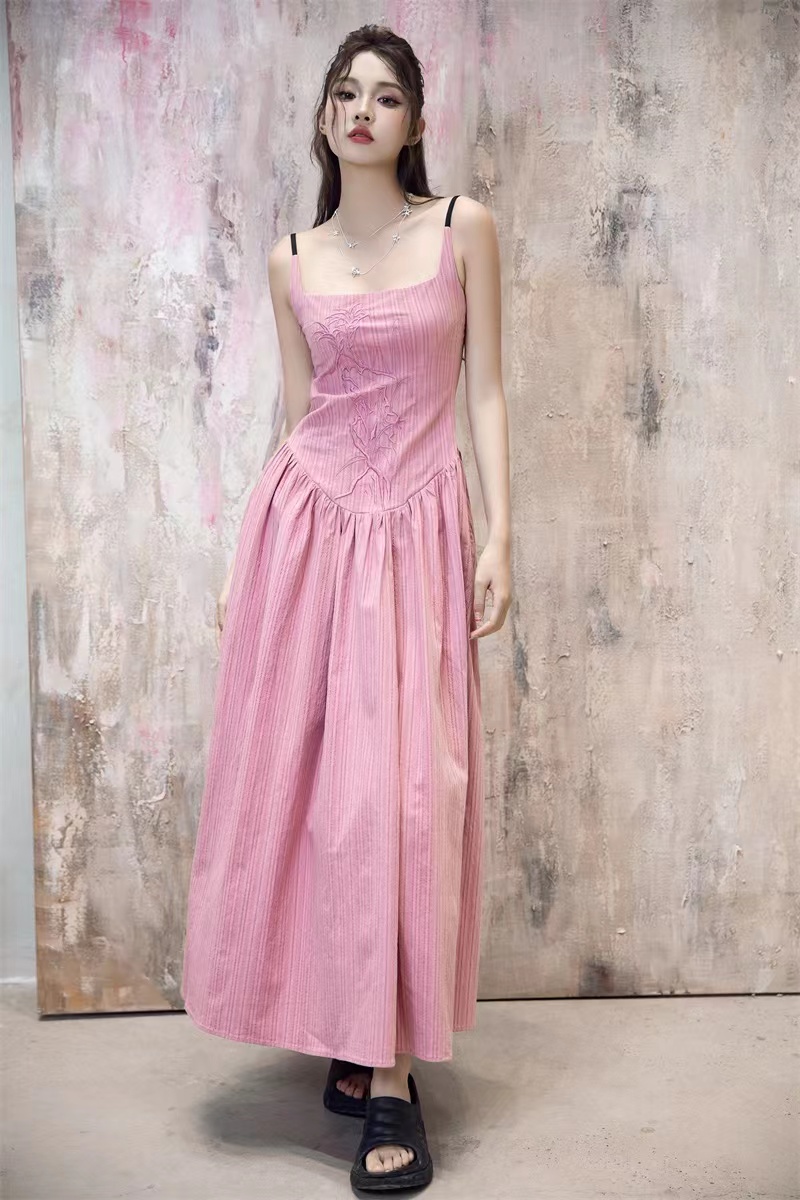 新中式國風刺繡棉質長版露背顯瘦吊帶度假洋裝