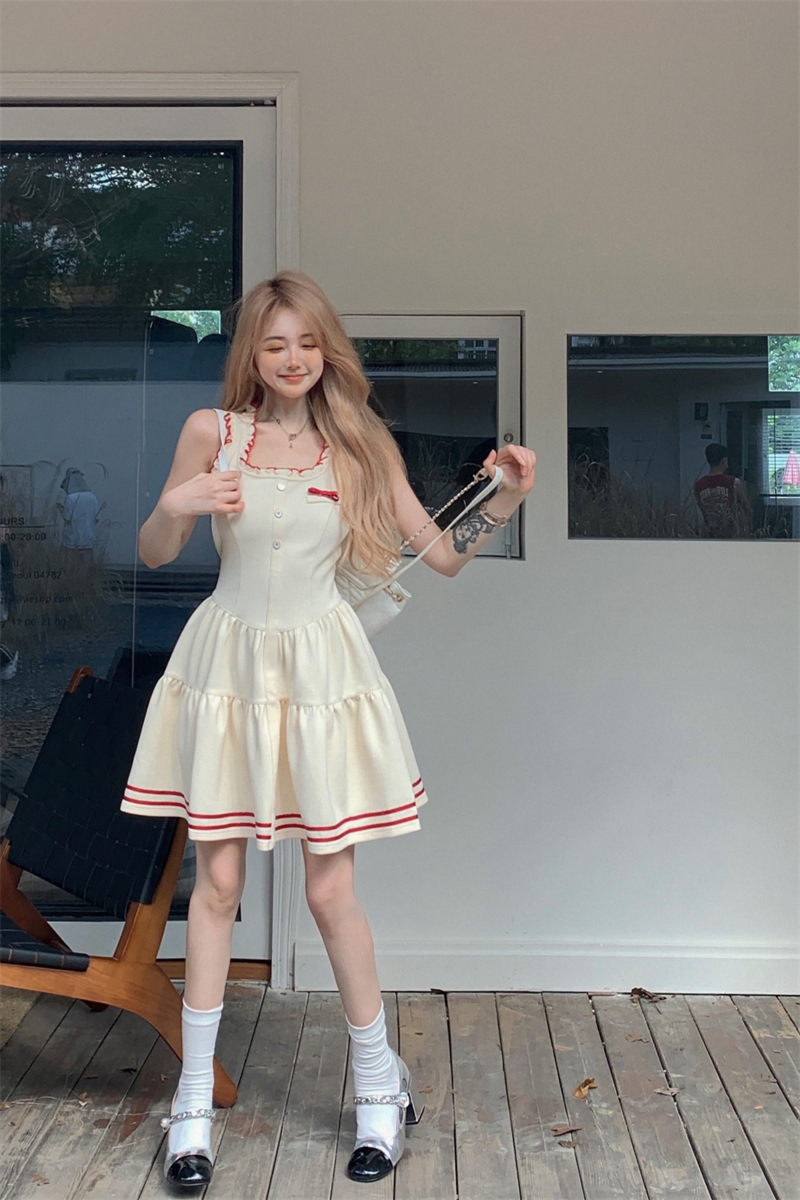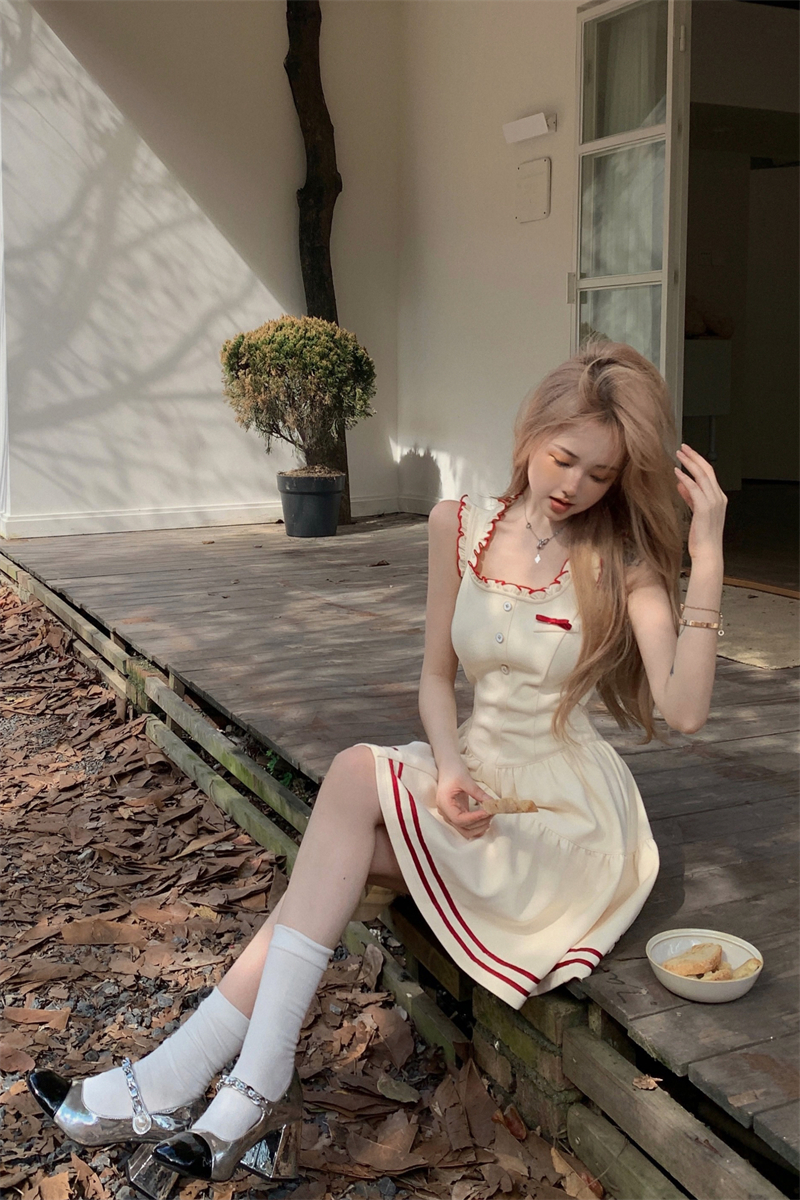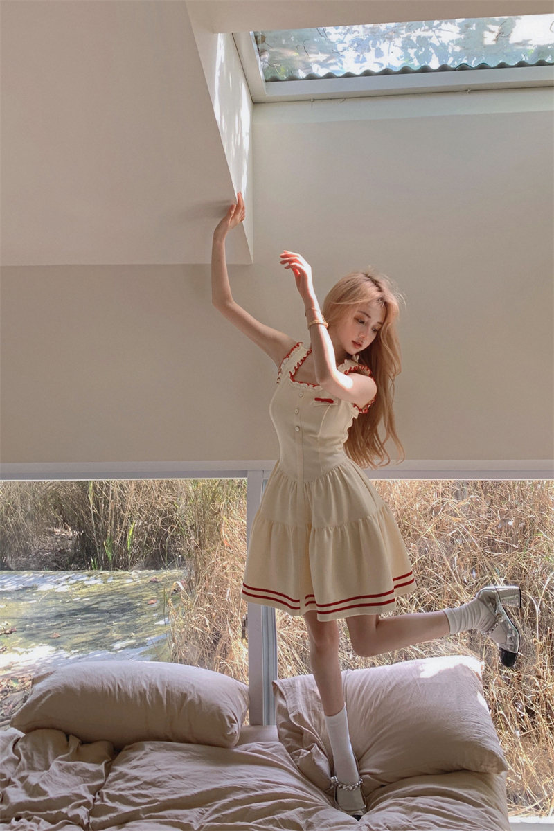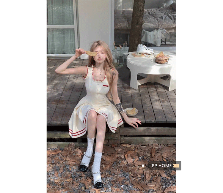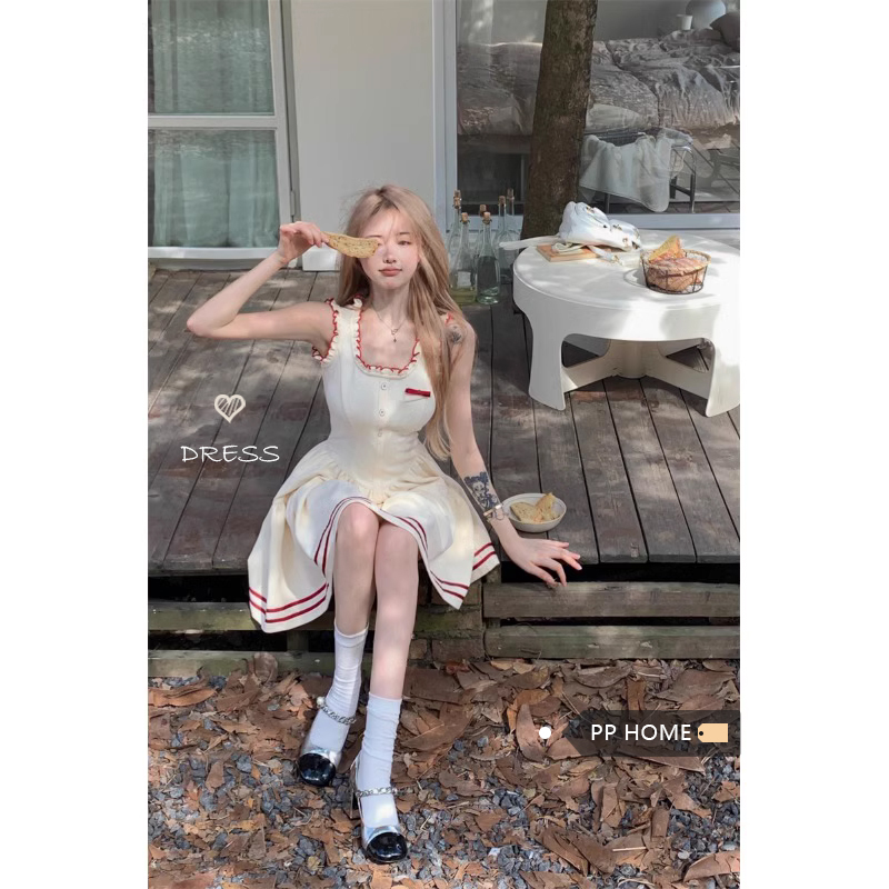 PPHOME柏林際遇~法式學院風吊帶洋裝女氣質收腰顯瘦a字短裙子