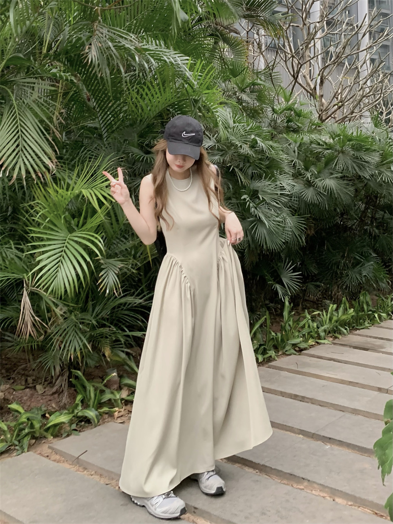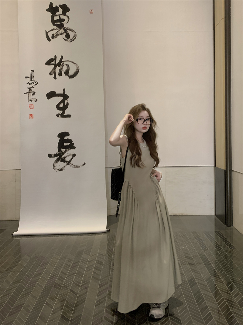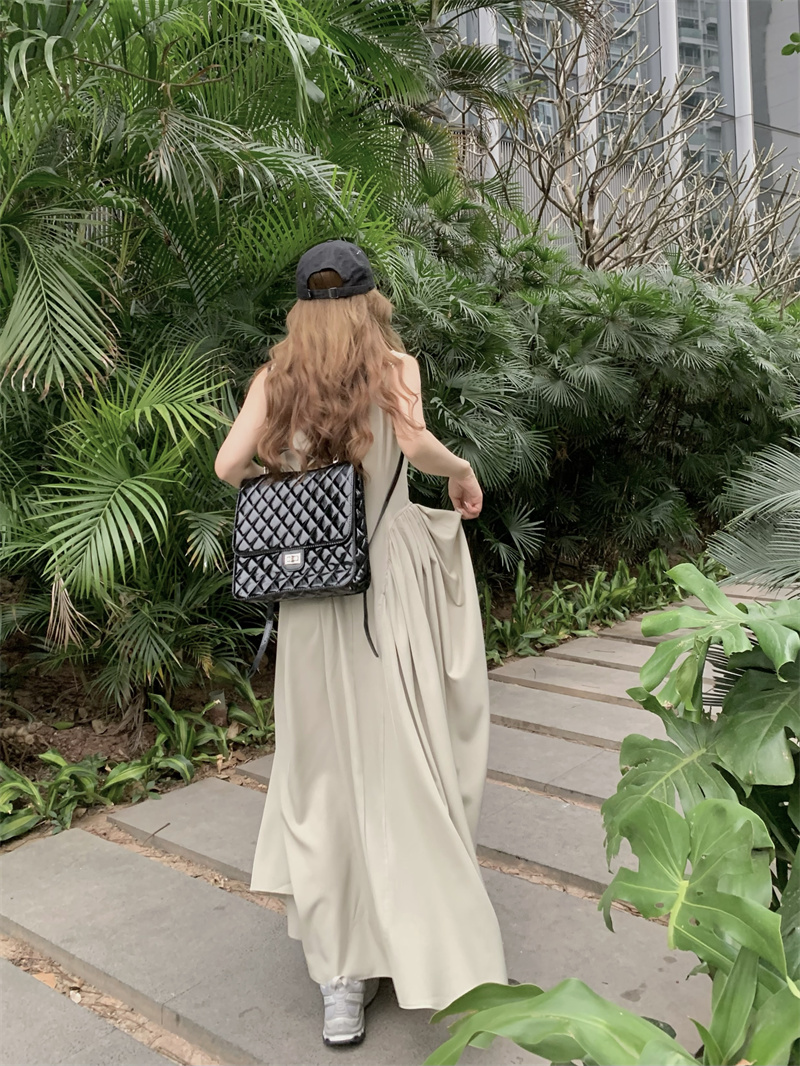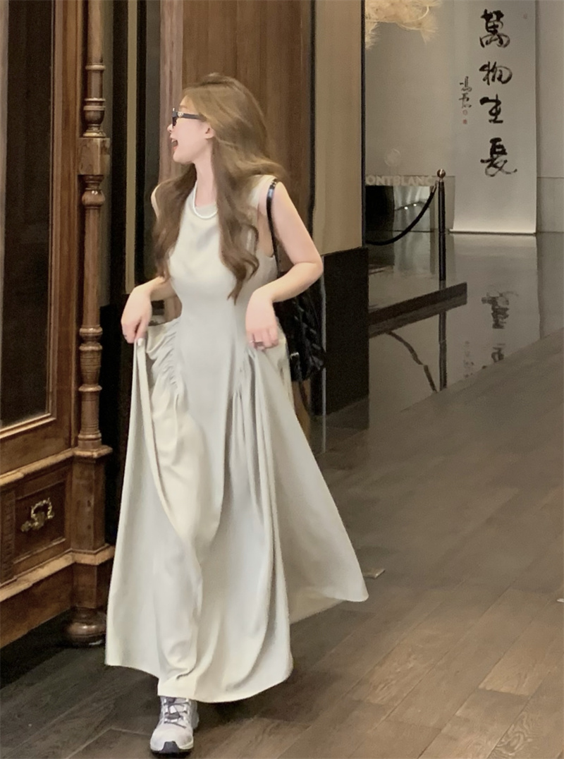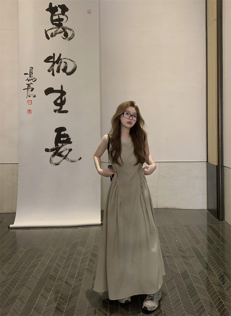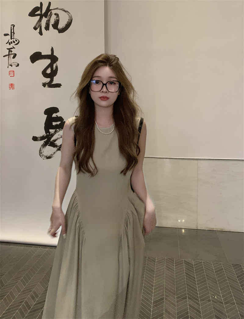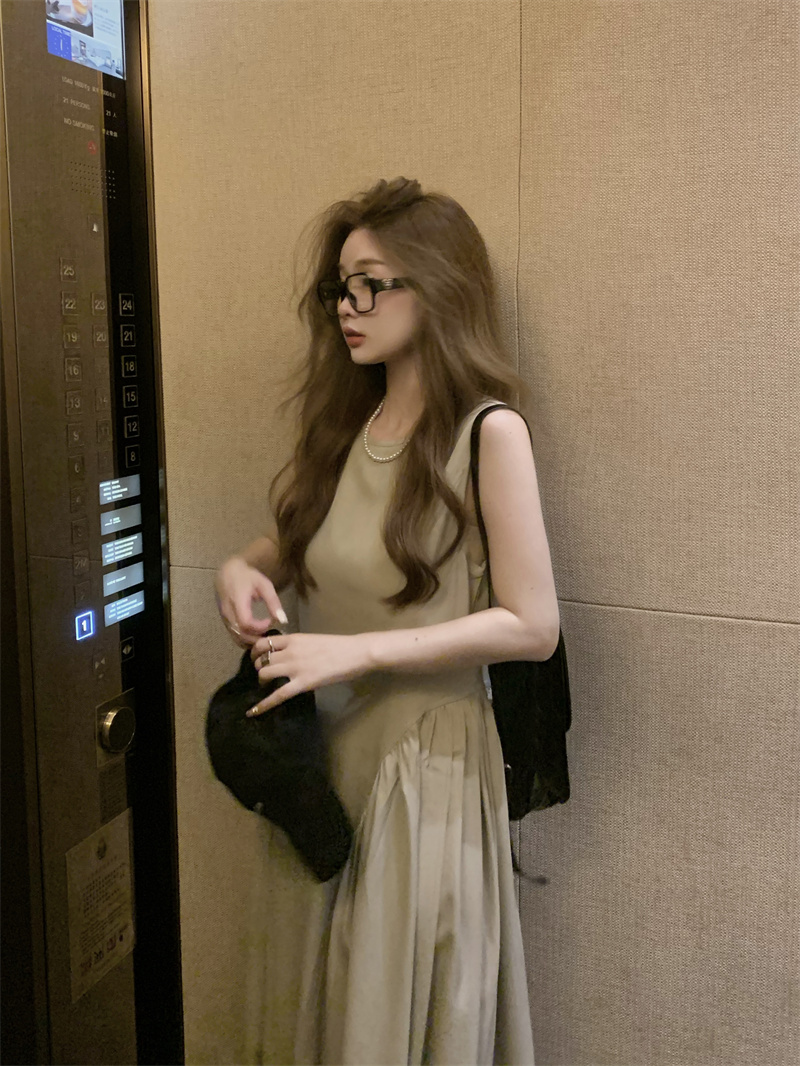 法式復古拼接褶皺無袖氣質裙子夏季2023年新款收腰顯瘦洋裝女裝