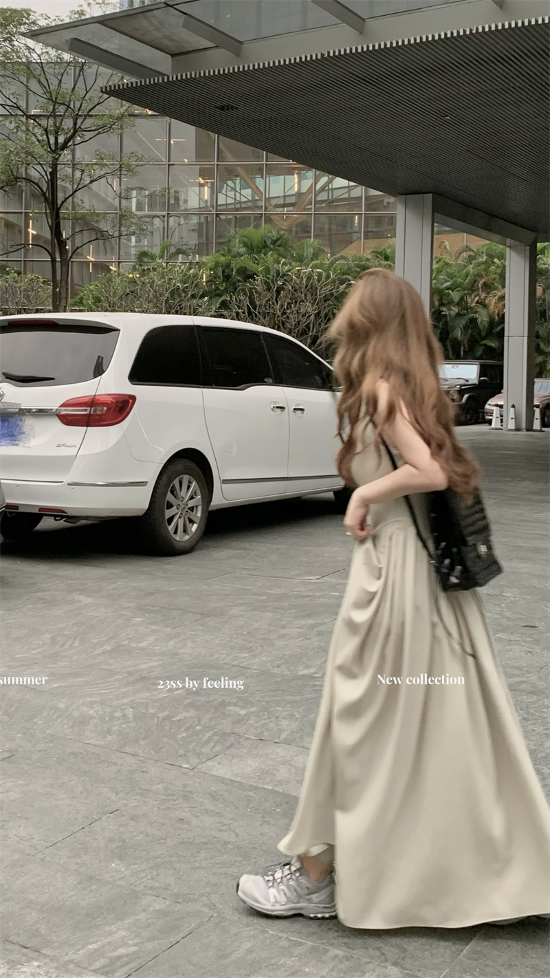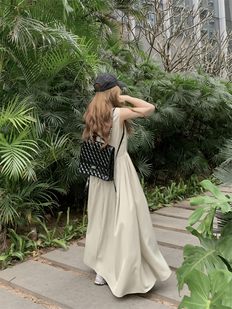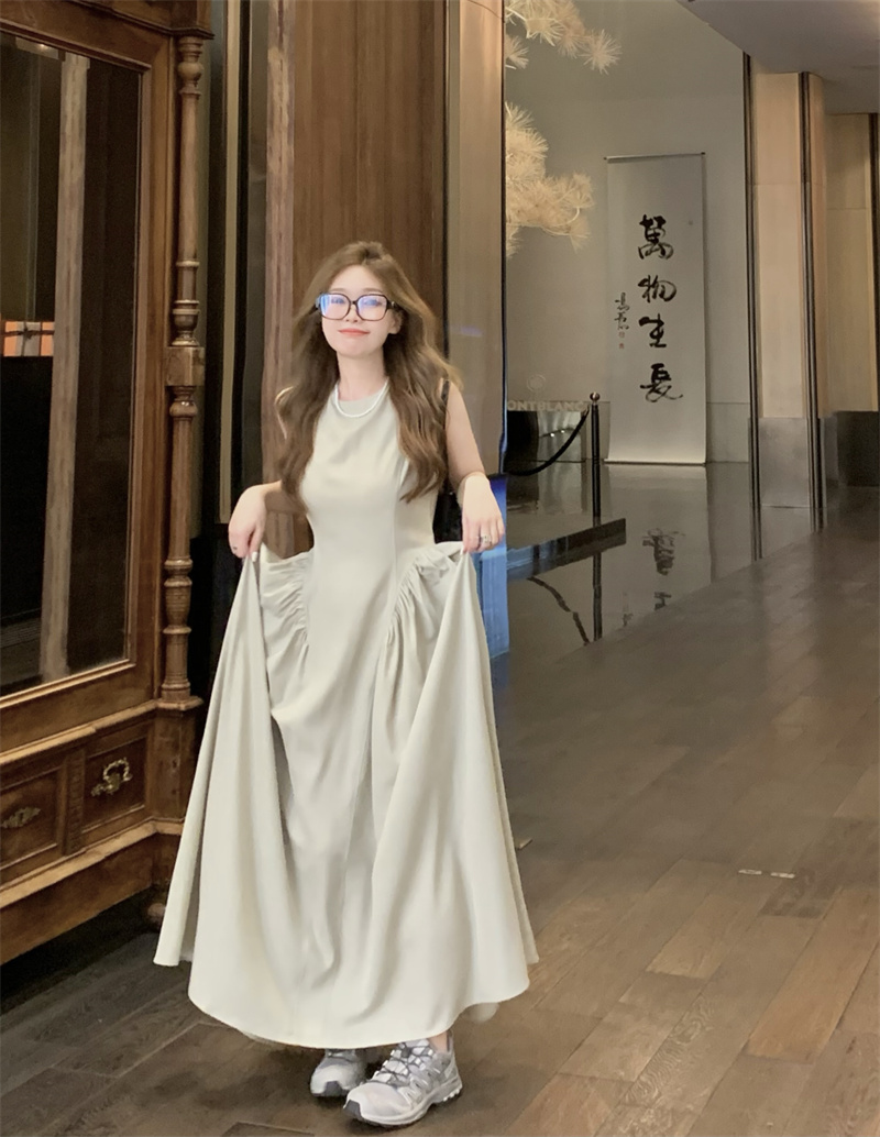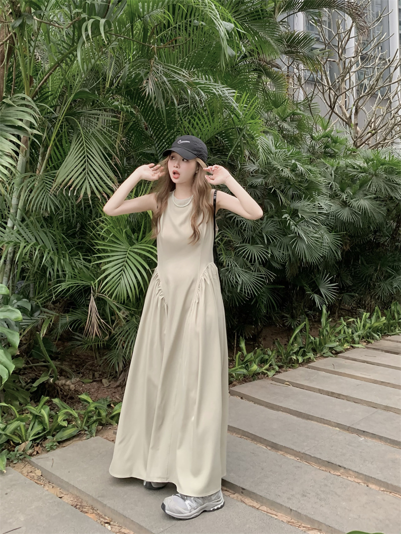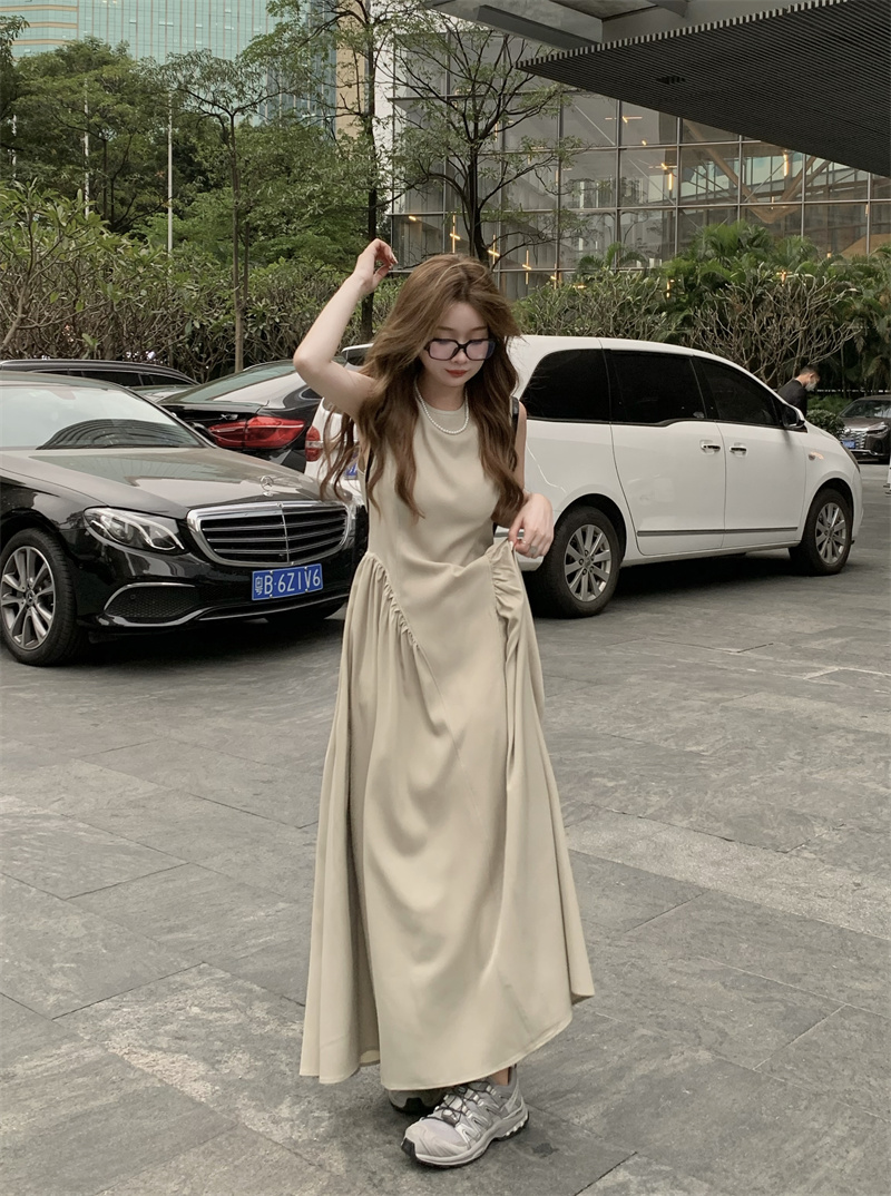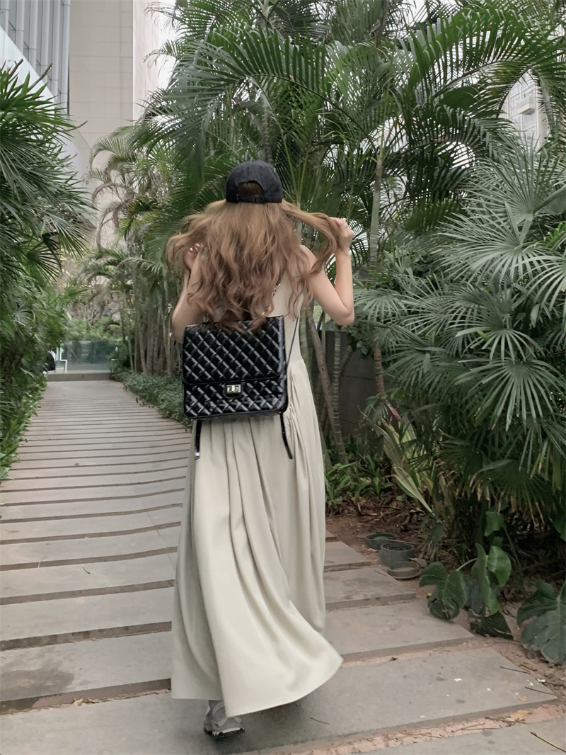 法式復古拼接褶皺無袖氣質裙子夏季2023年新款收腰顯瘦洋裝女裝