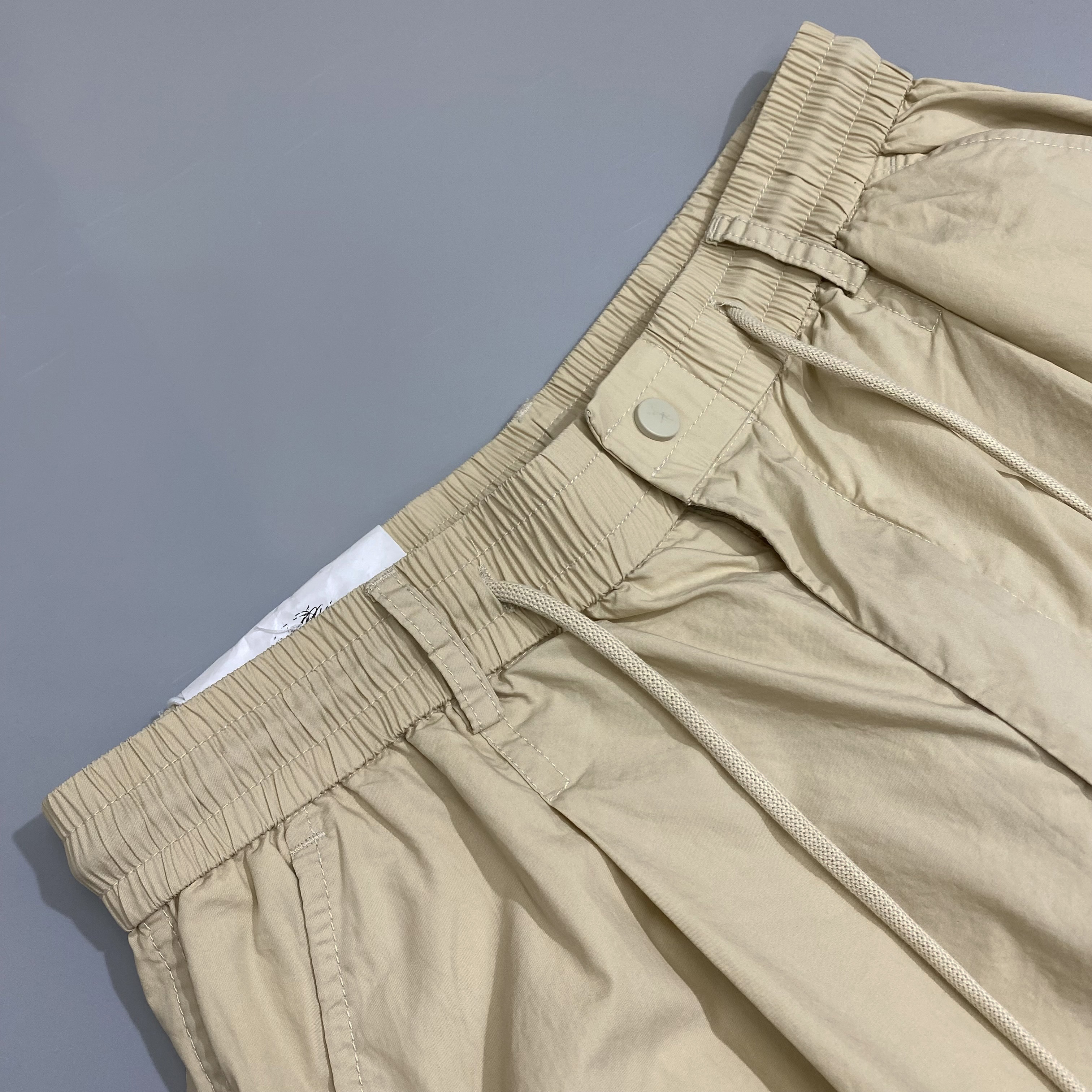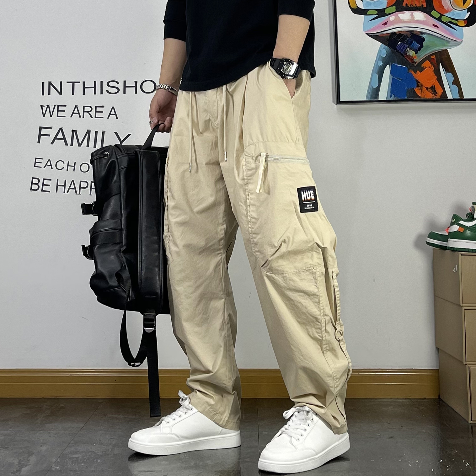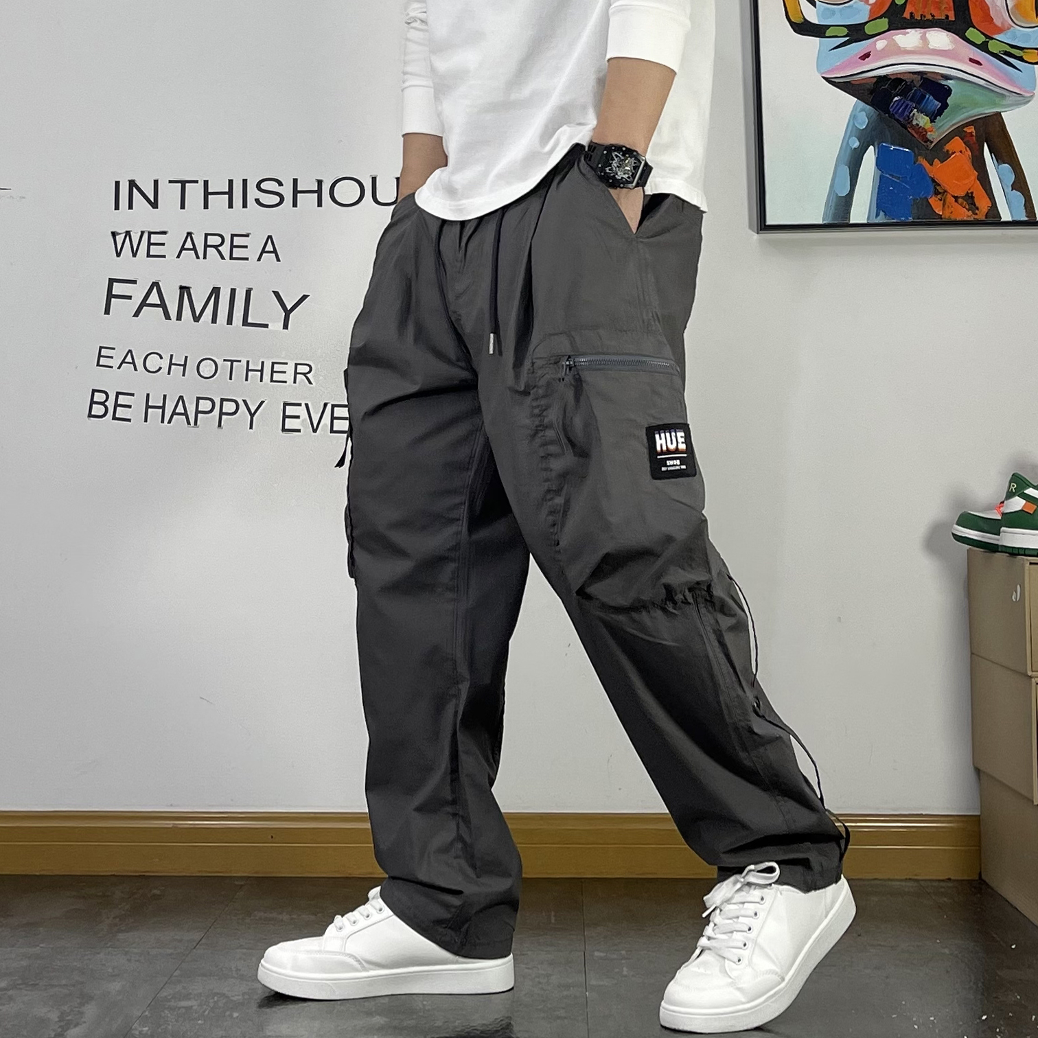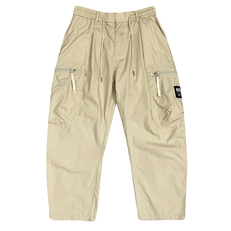 潮牌繡標多口袋薄款休閒褲男寬鬆直筒抽繩簡約夏季新款百搭工裝褲