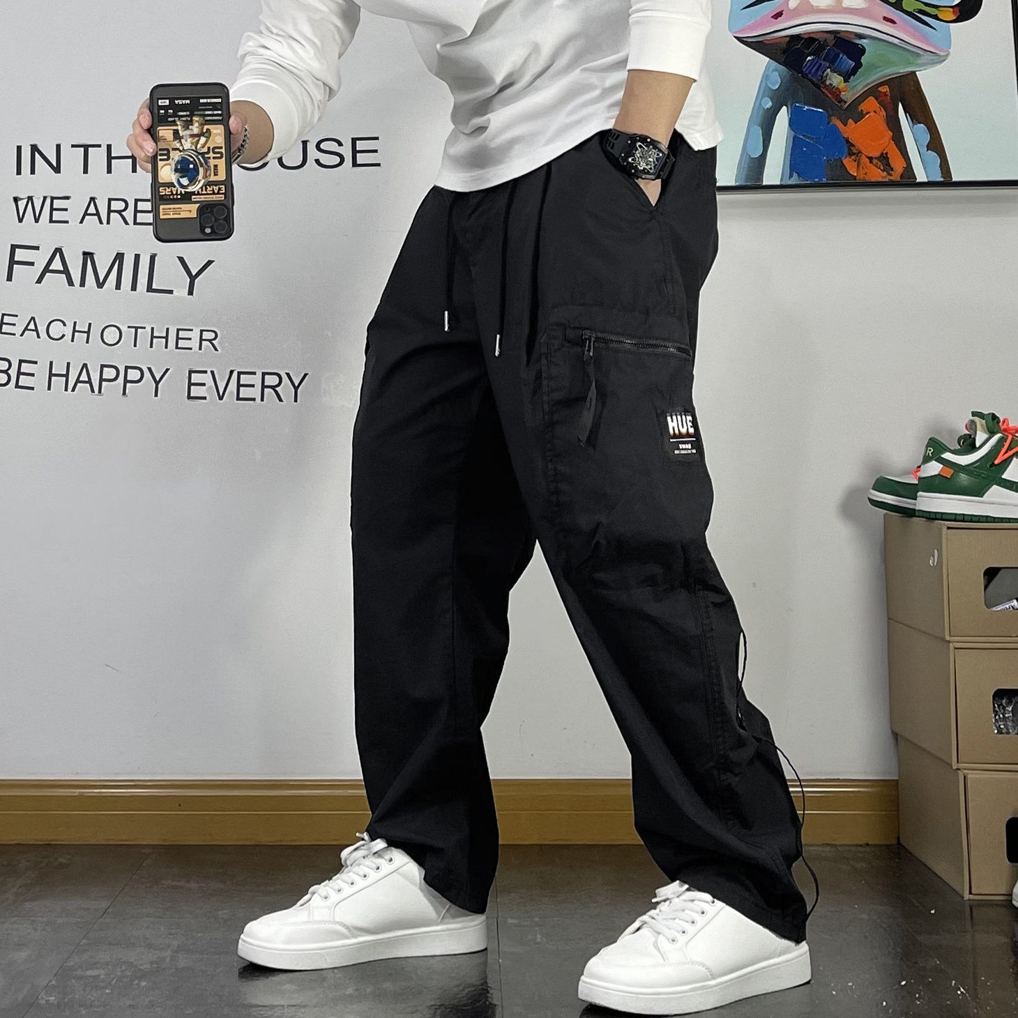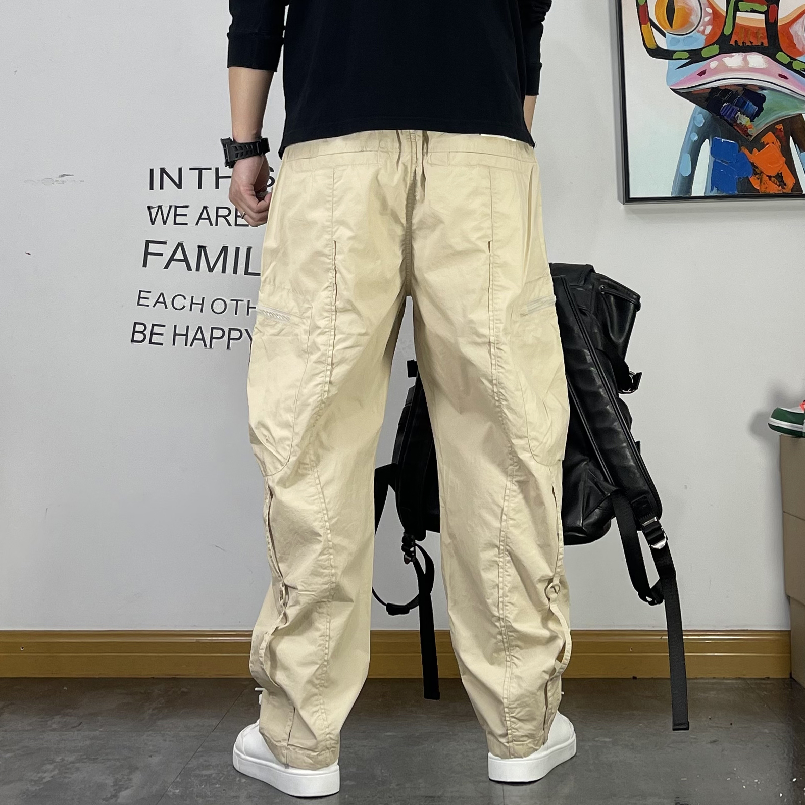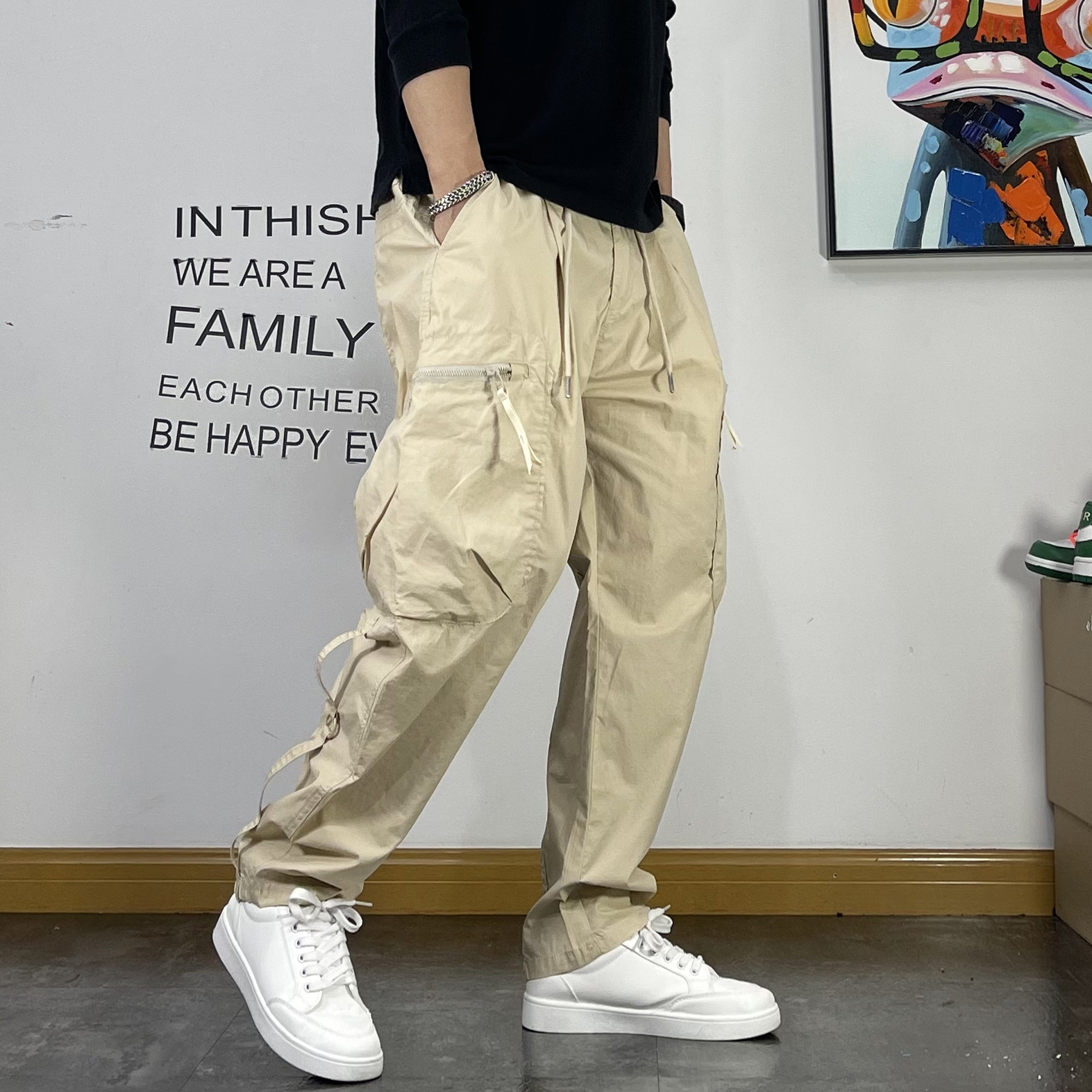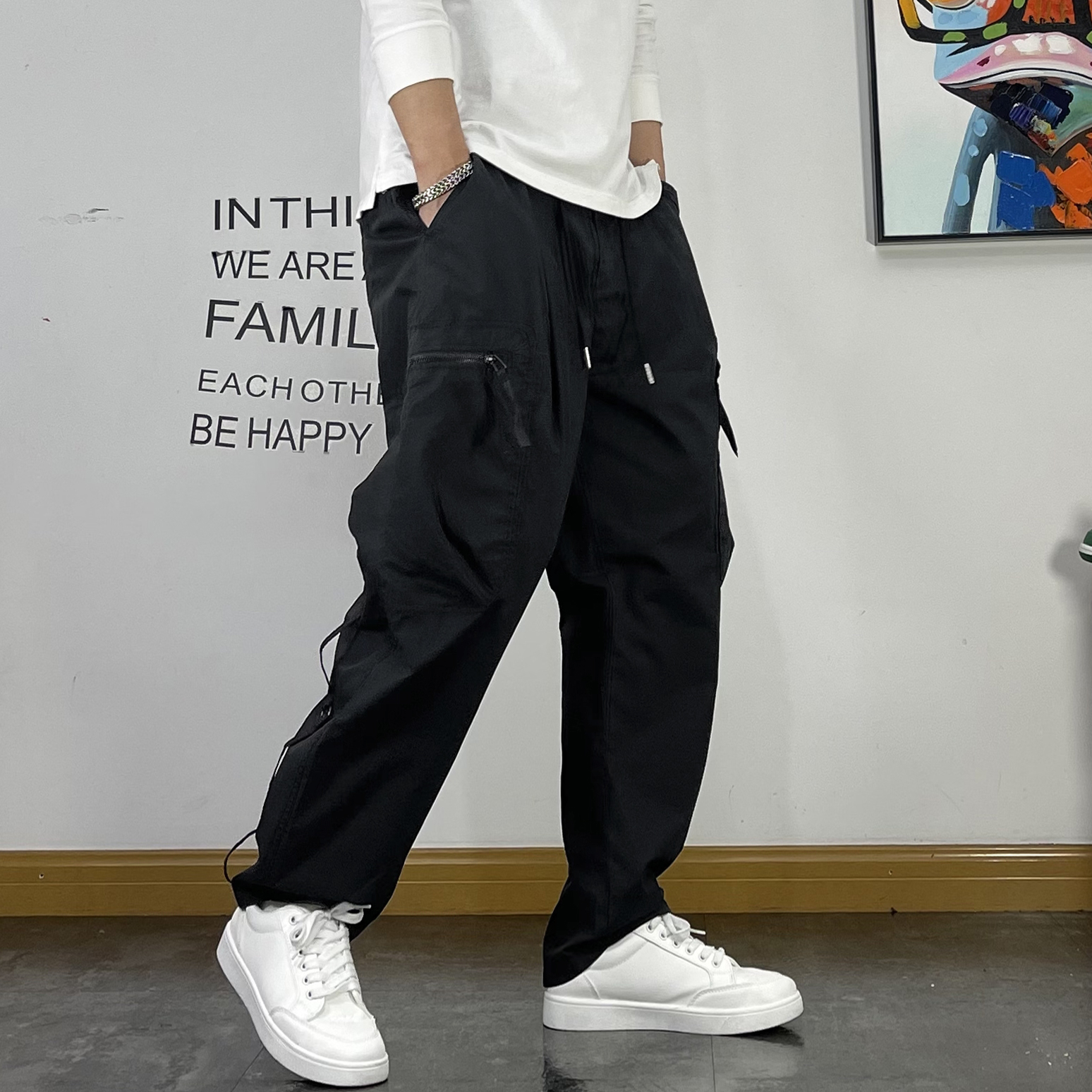 潮牌繡標多口袋薄款休閒褲男寬鬆直筒抽繩簡約夏季新款百搭工裝褲