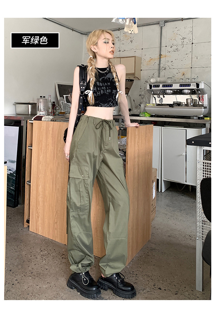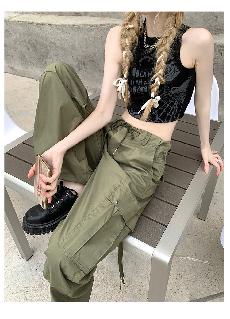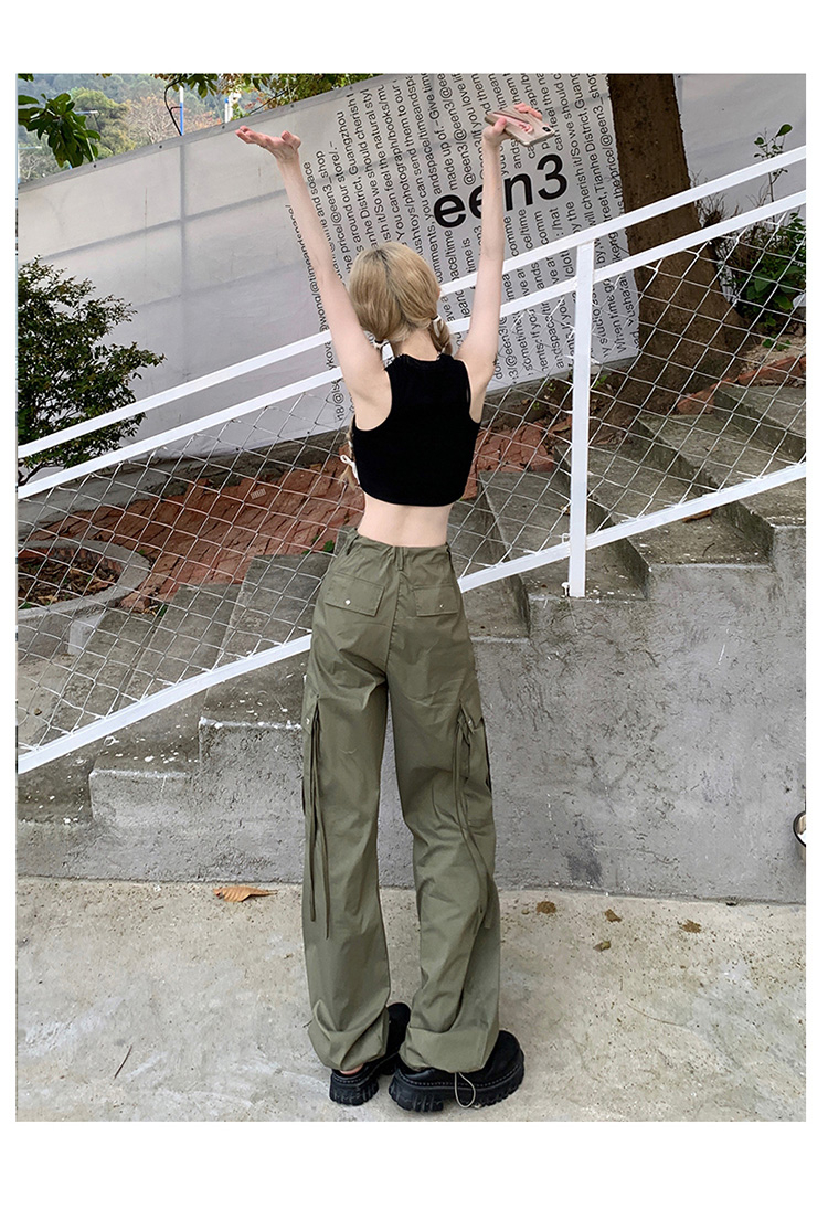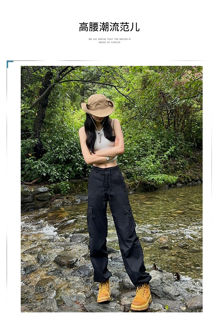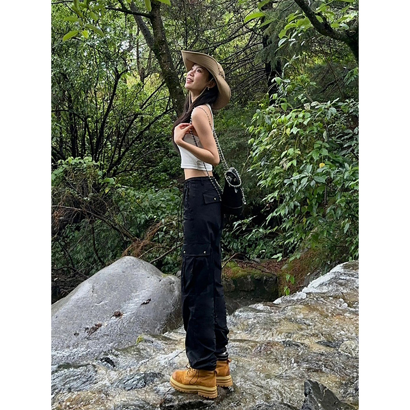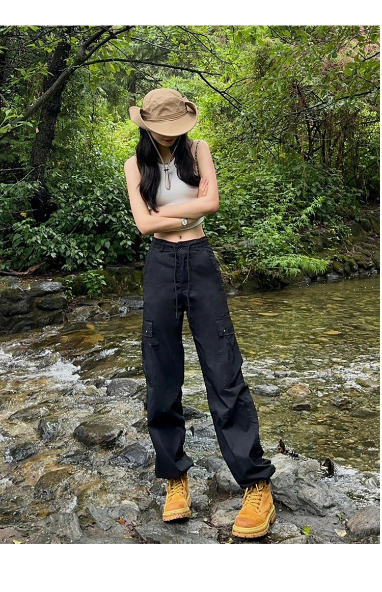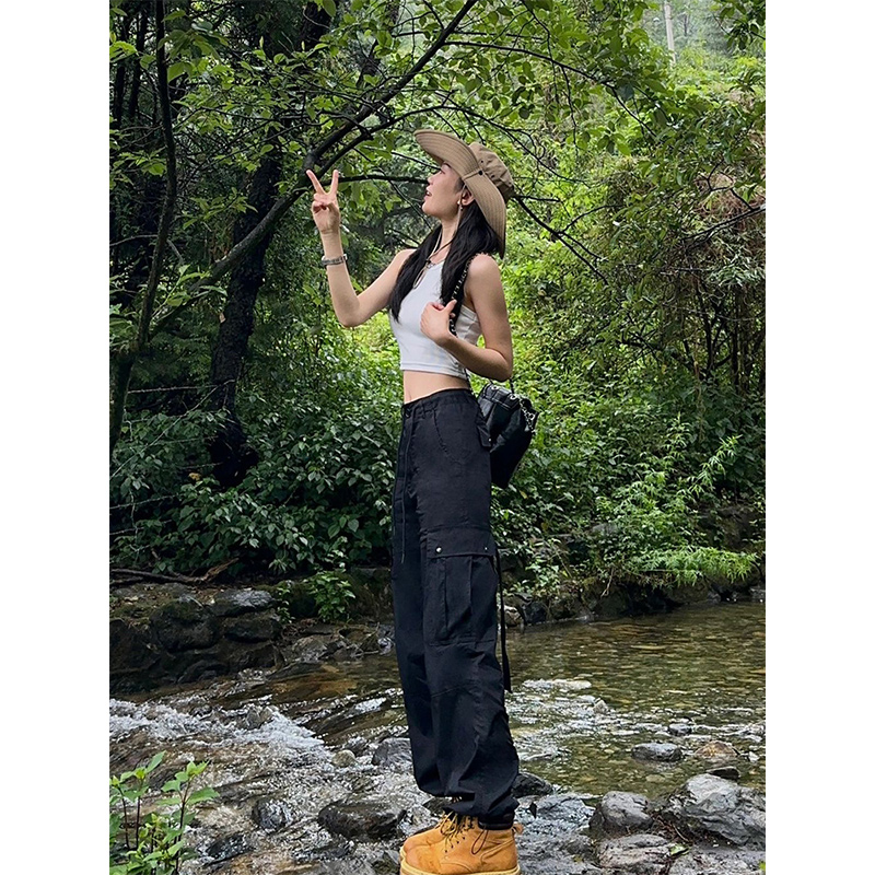 美式黑色工裝褲女夏季薄款高腰寬鬆直筒秋季登山速乾闊腿休閒褲子