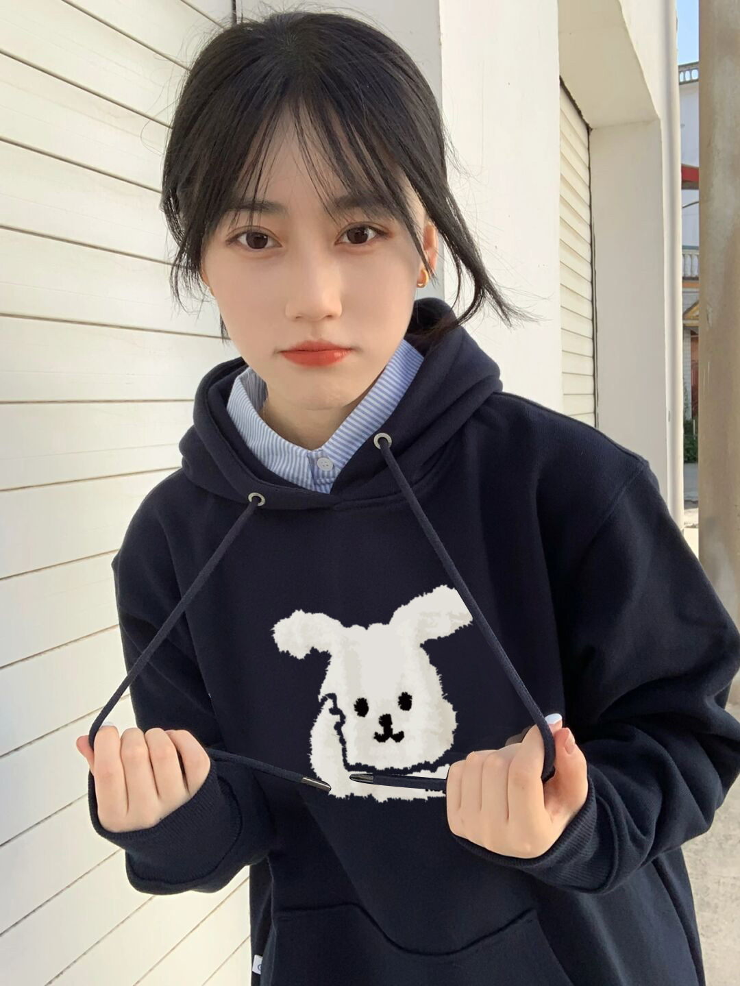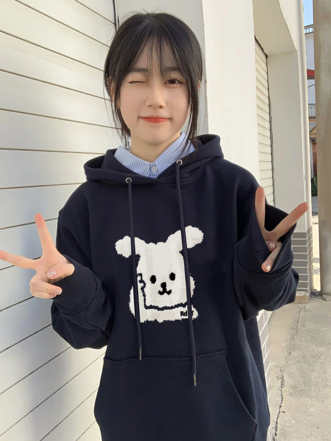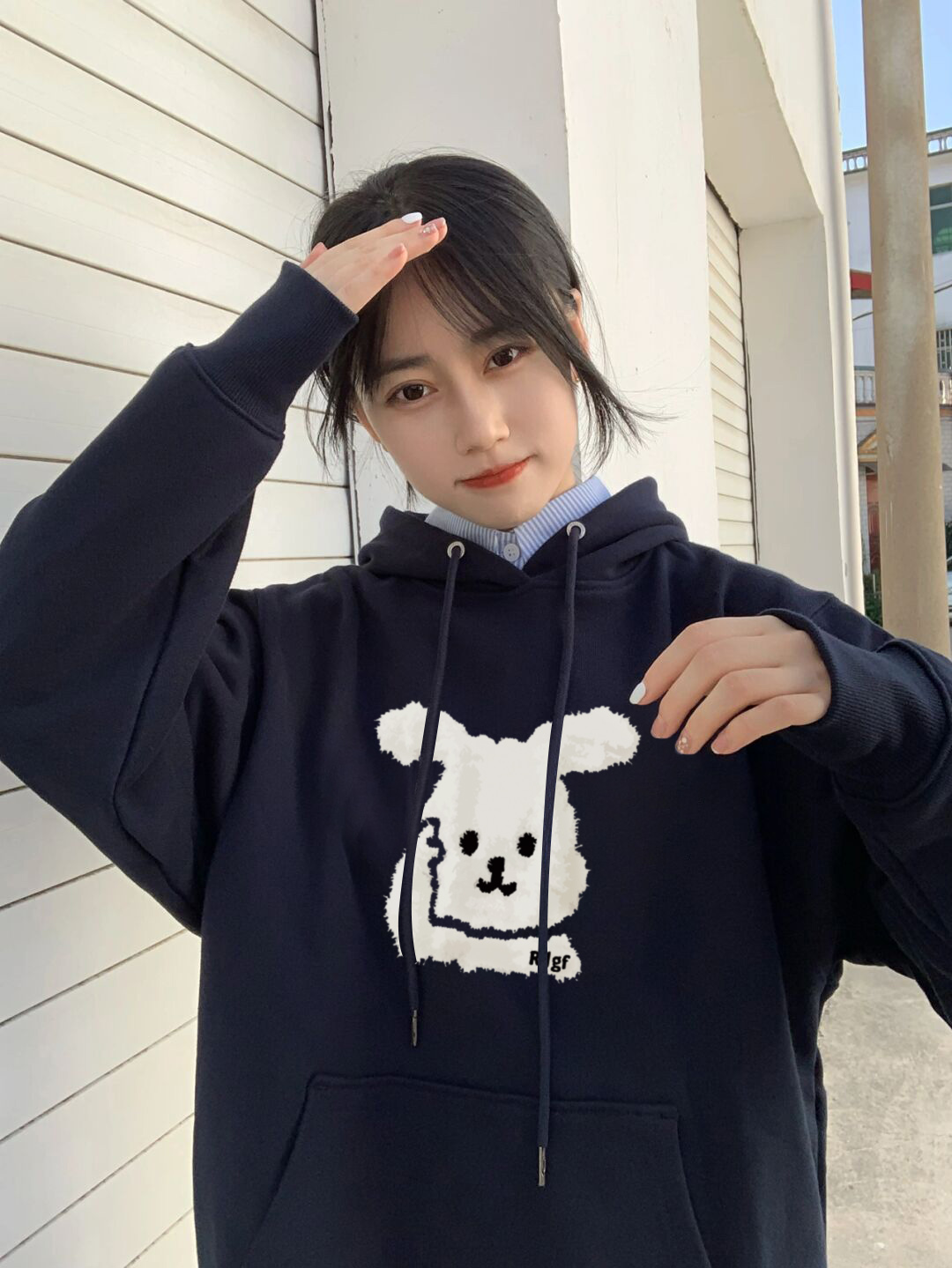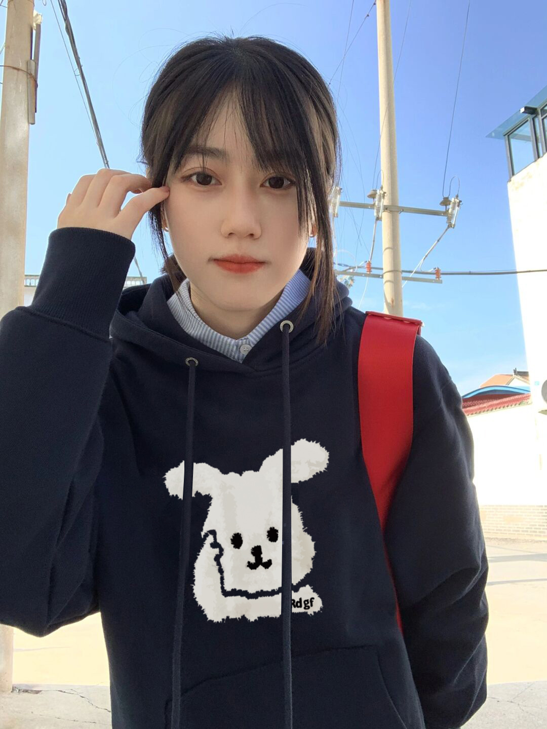 藏青色連帽情侶厚T恤女秋冬款2023新款美式oversize寬鬆藝術生外套