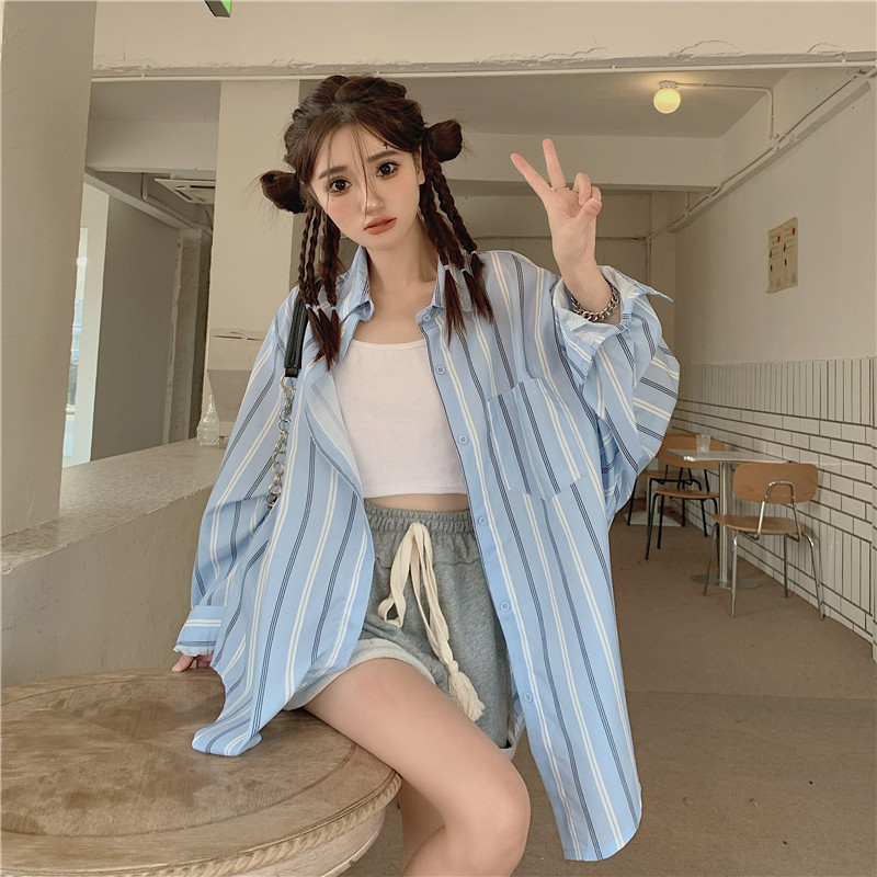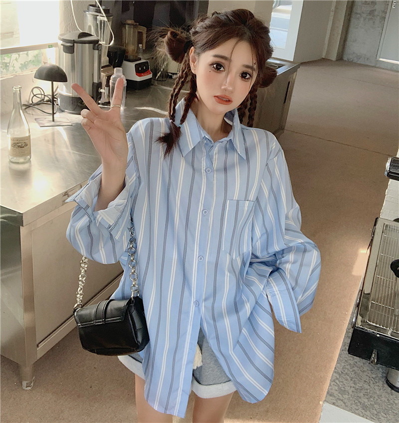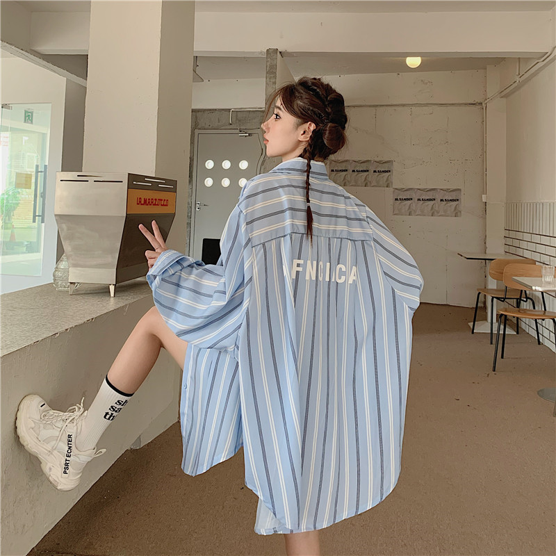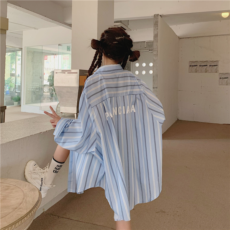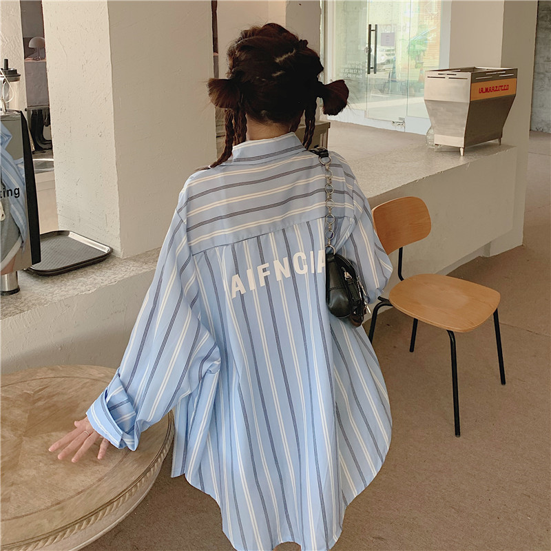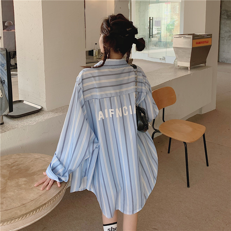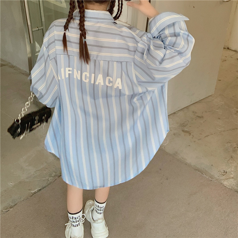 200斤胖妹妹女裝夏季ins條紋字母長袖襯衫加肥加大碼學生防曬襯衫