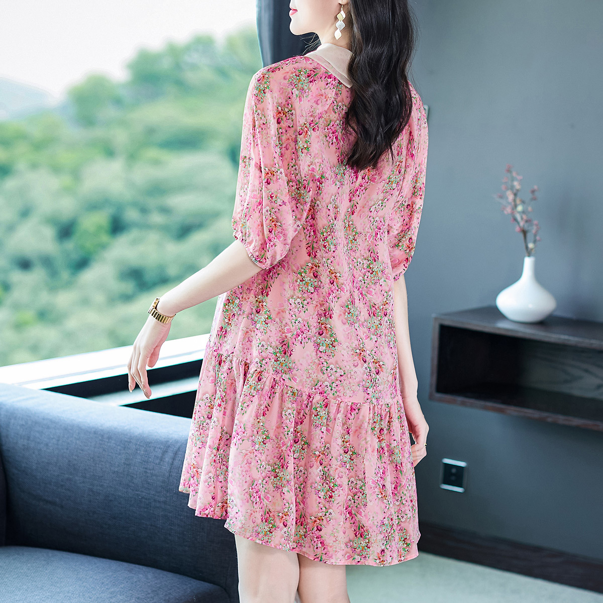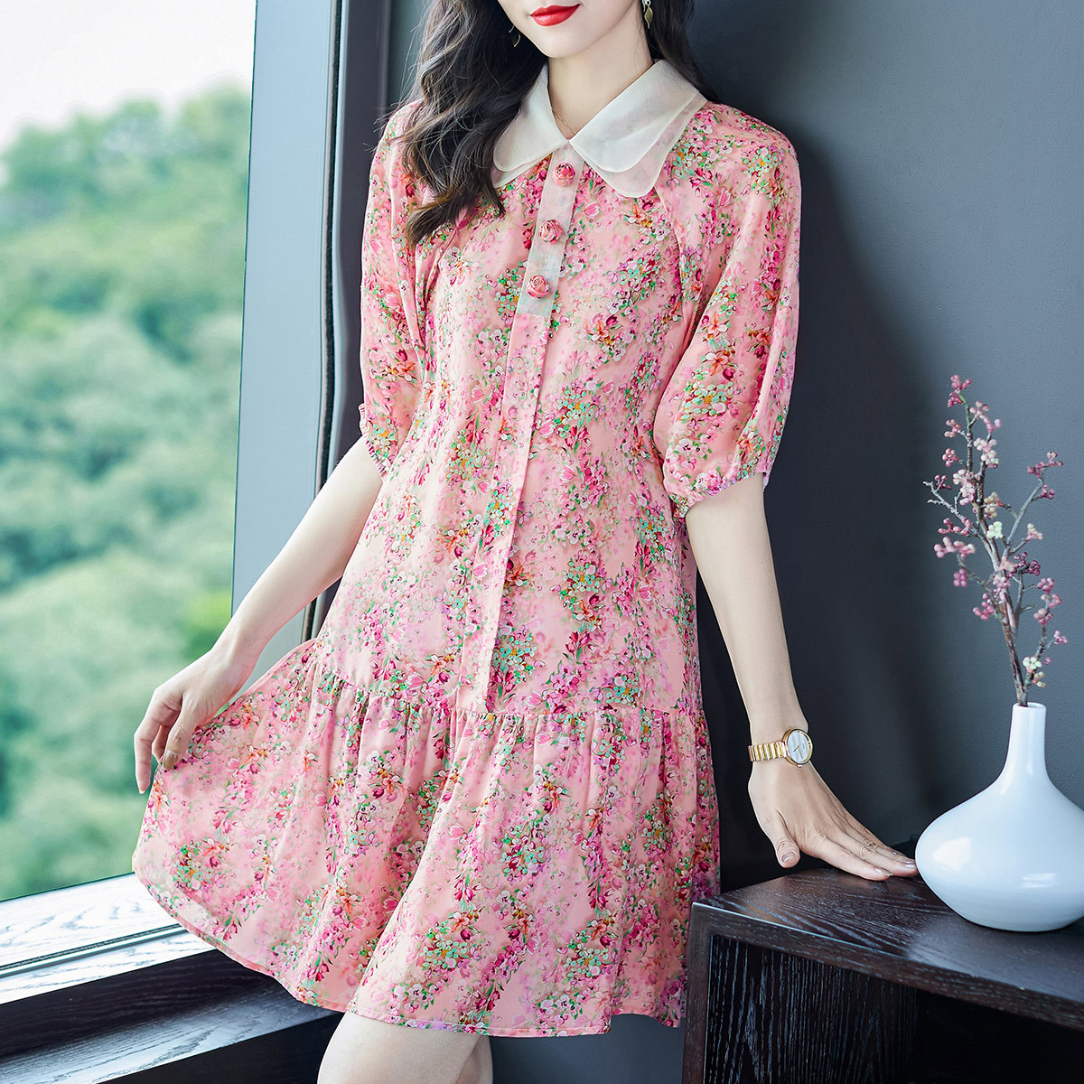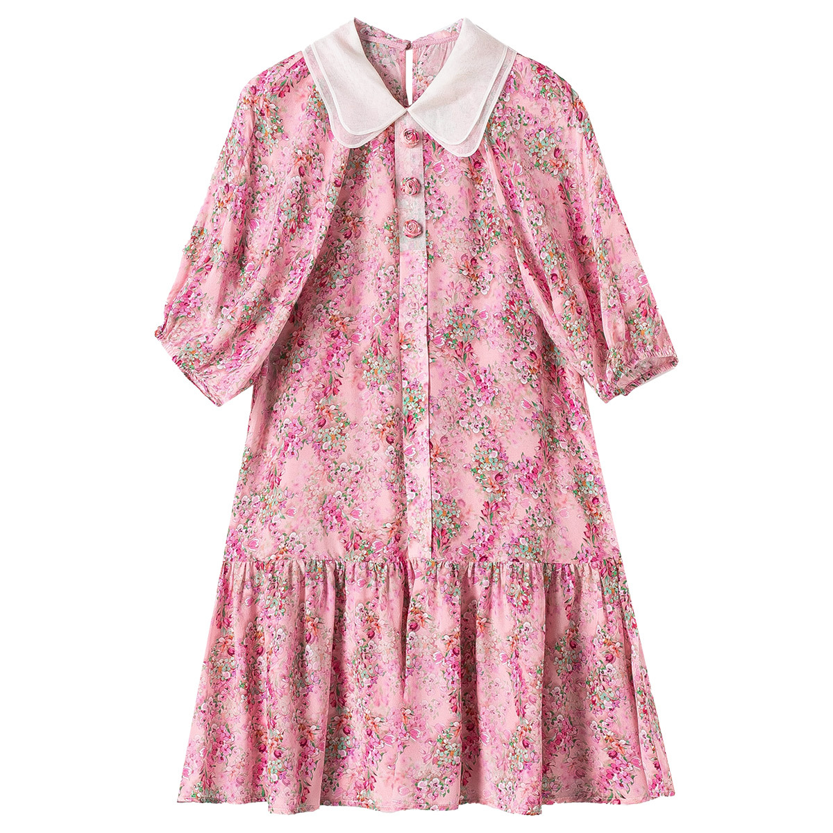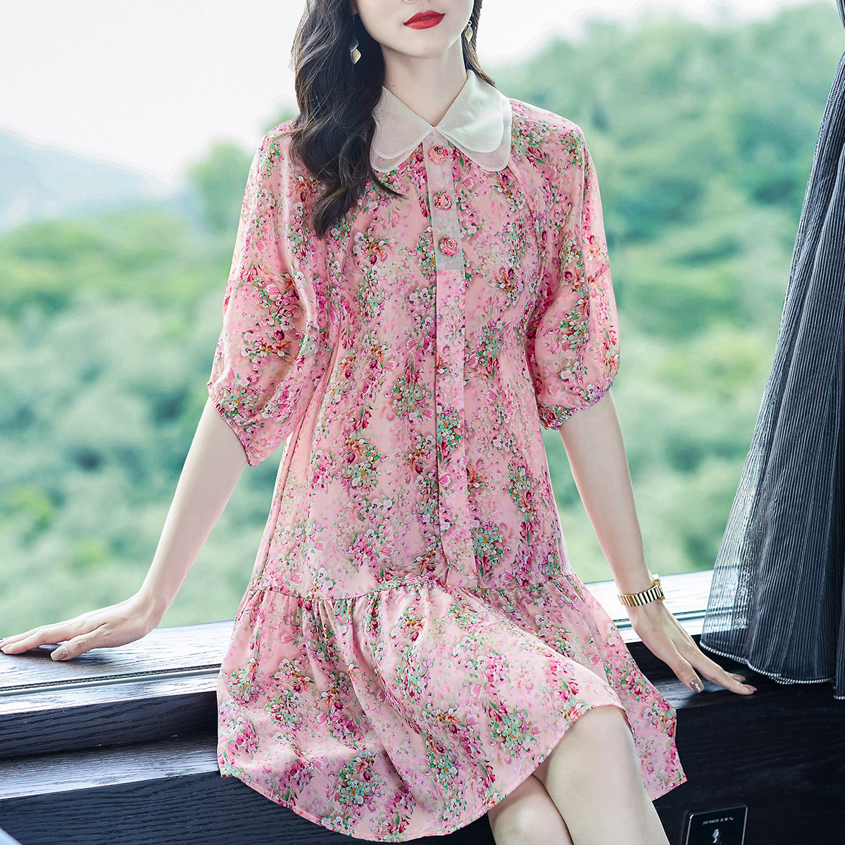 48748春夏季女装粉色碎花桑蚕丝娃娃裙子减龄翻领泡泡袖真丝连衣