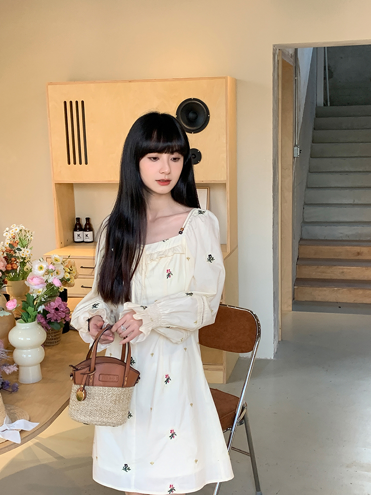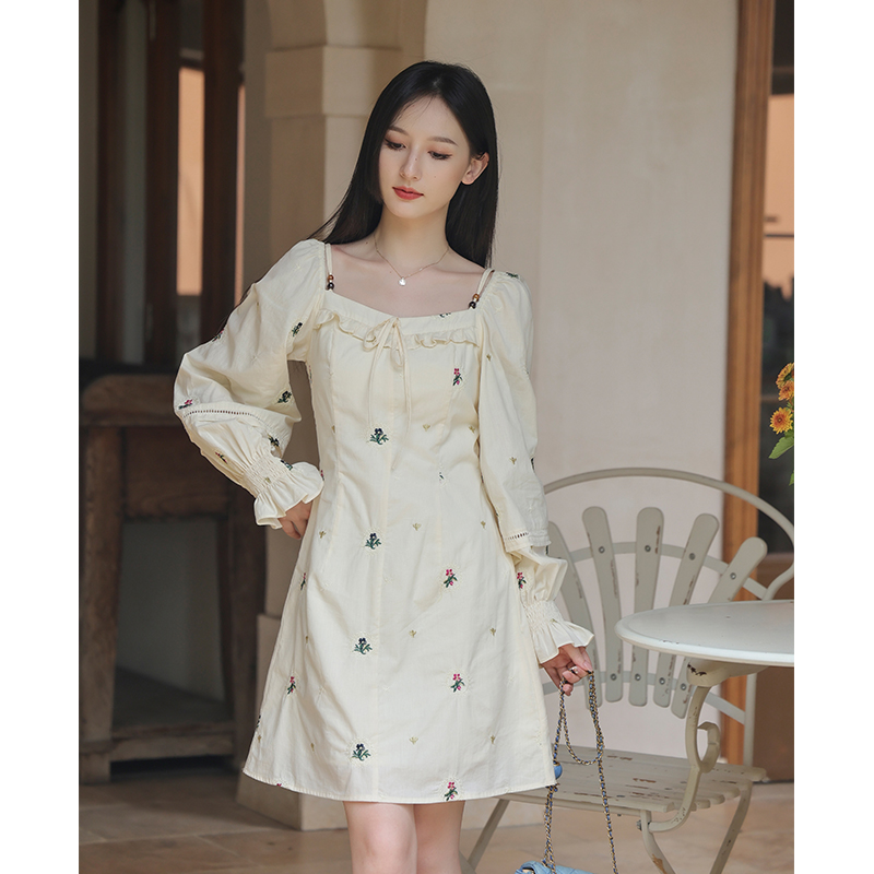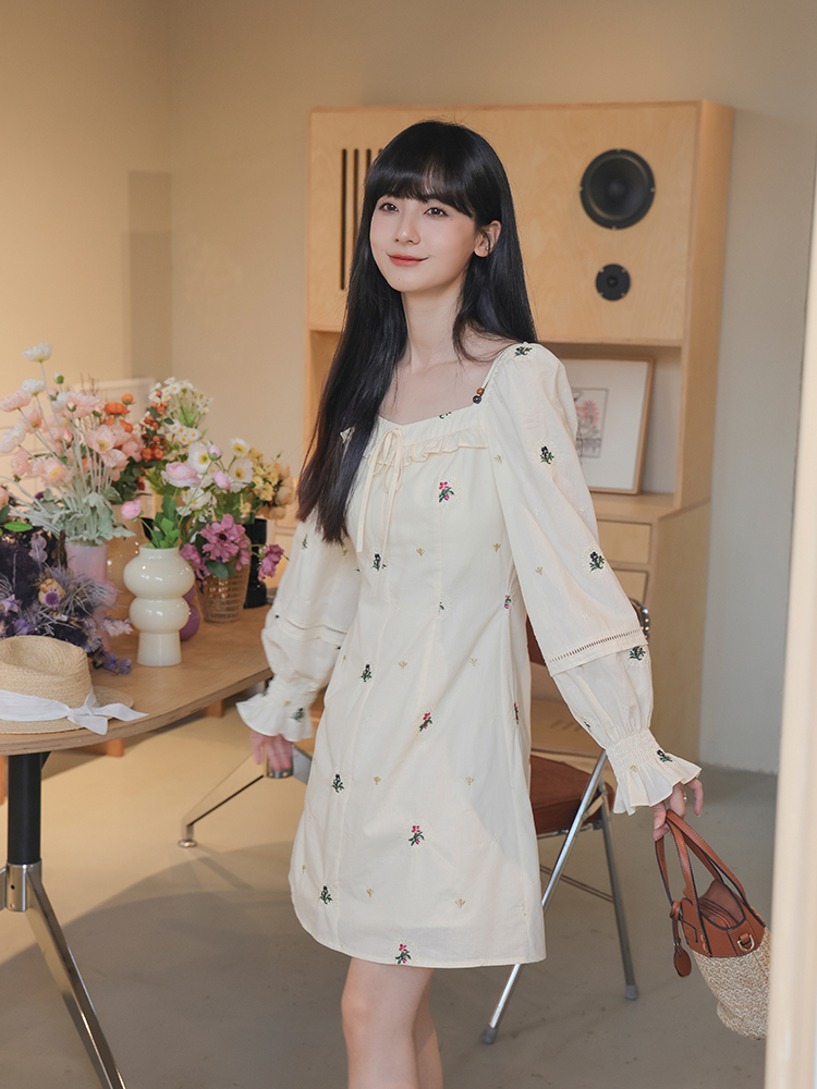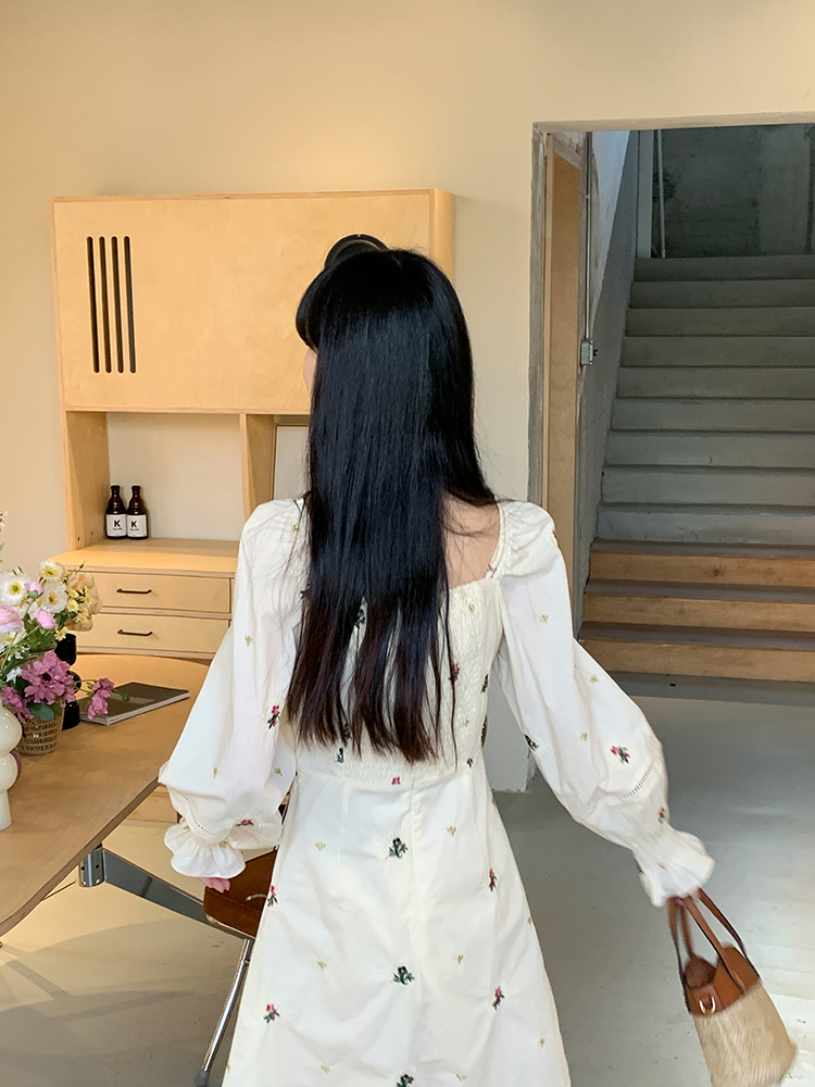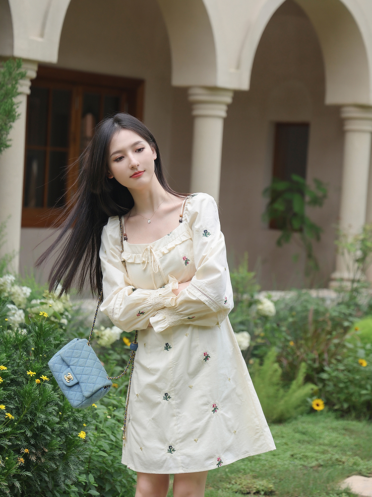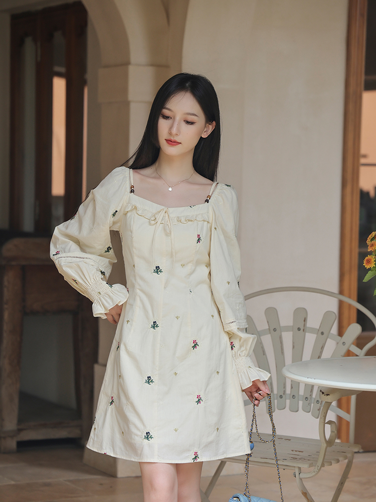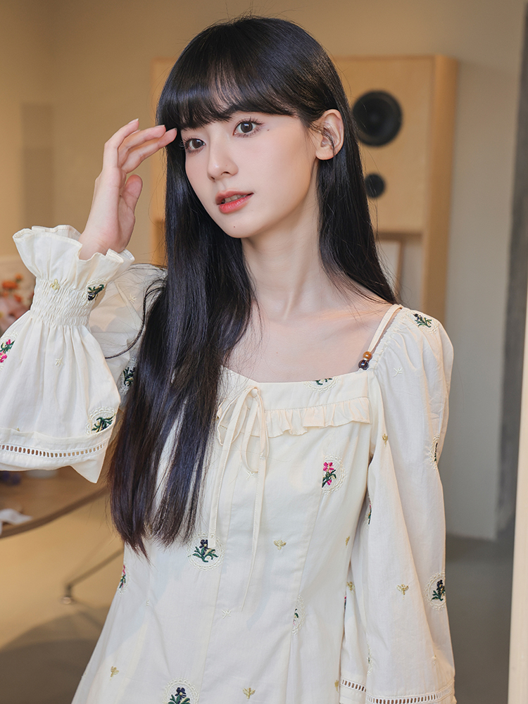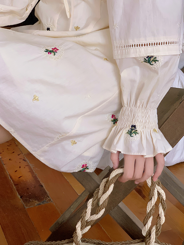小鎮姍姍 清風鈴蘭~法式溫柔方領繡花襯衫全棉長袖碎花a字洋裝