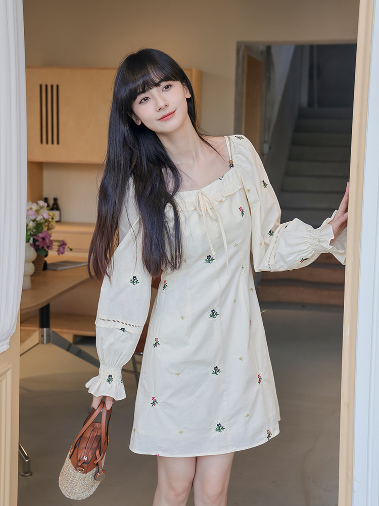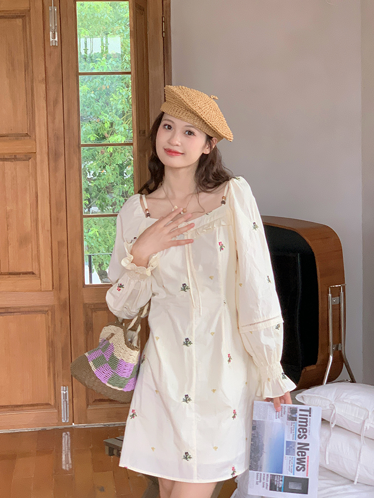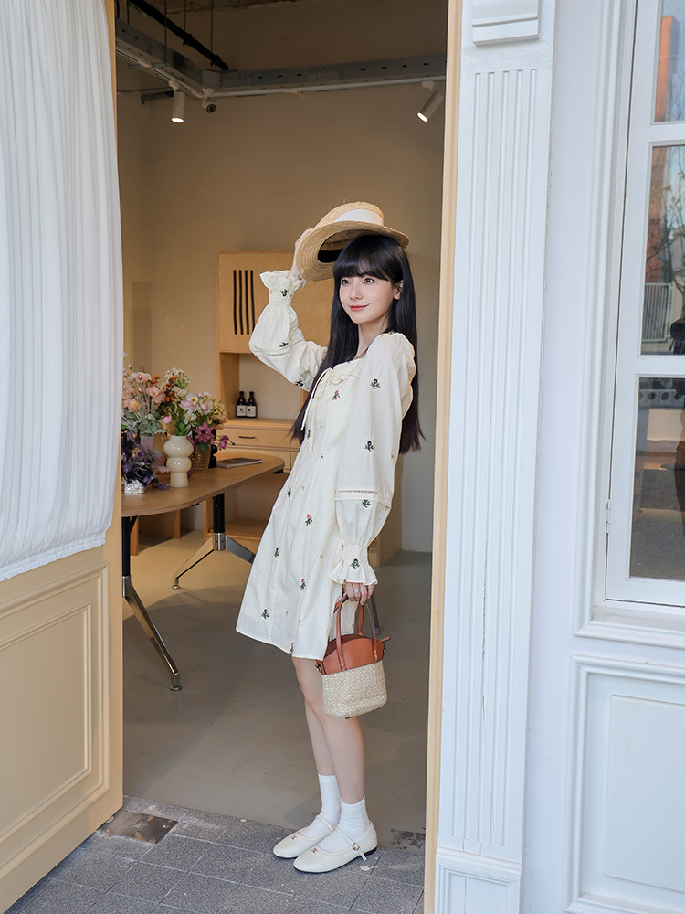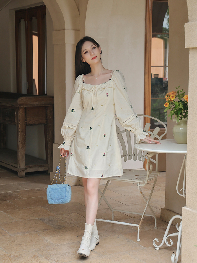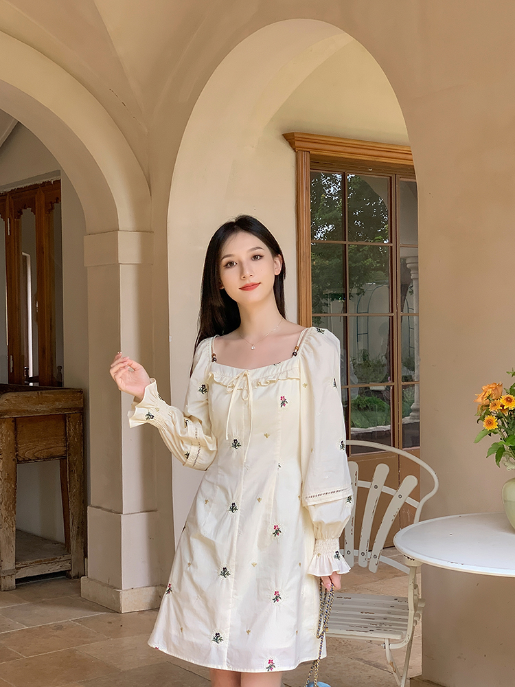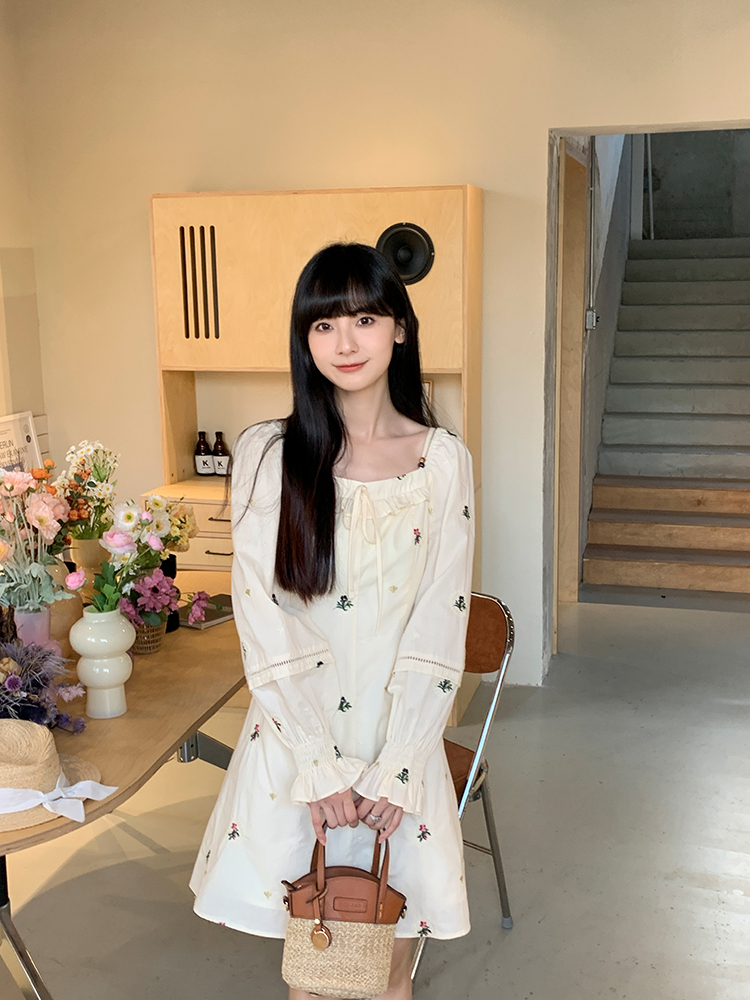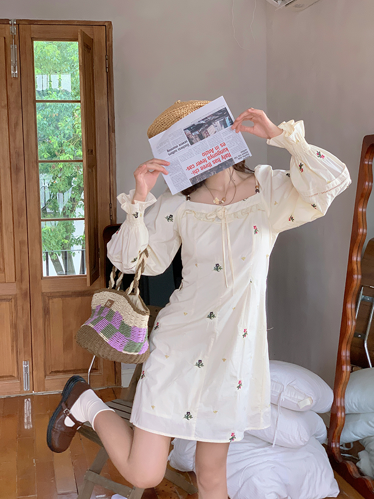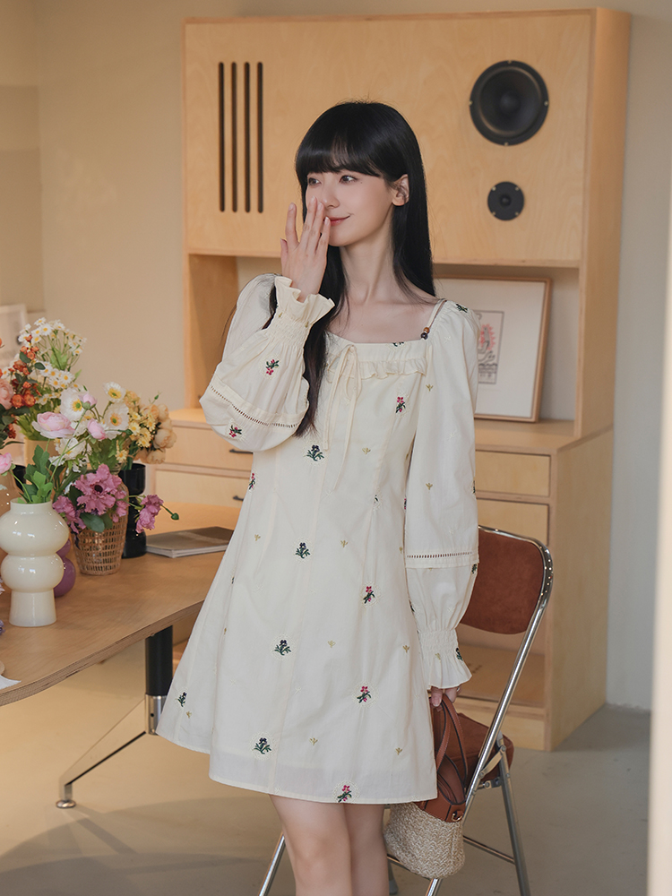 小鎮姍姍 清風鈴蘭~法式溫柔方領繡花襯衫全棉長袖碎花a字洋裝
