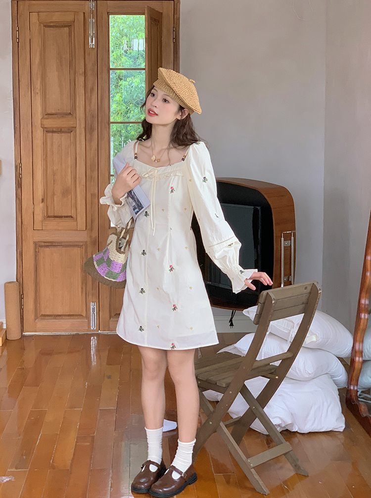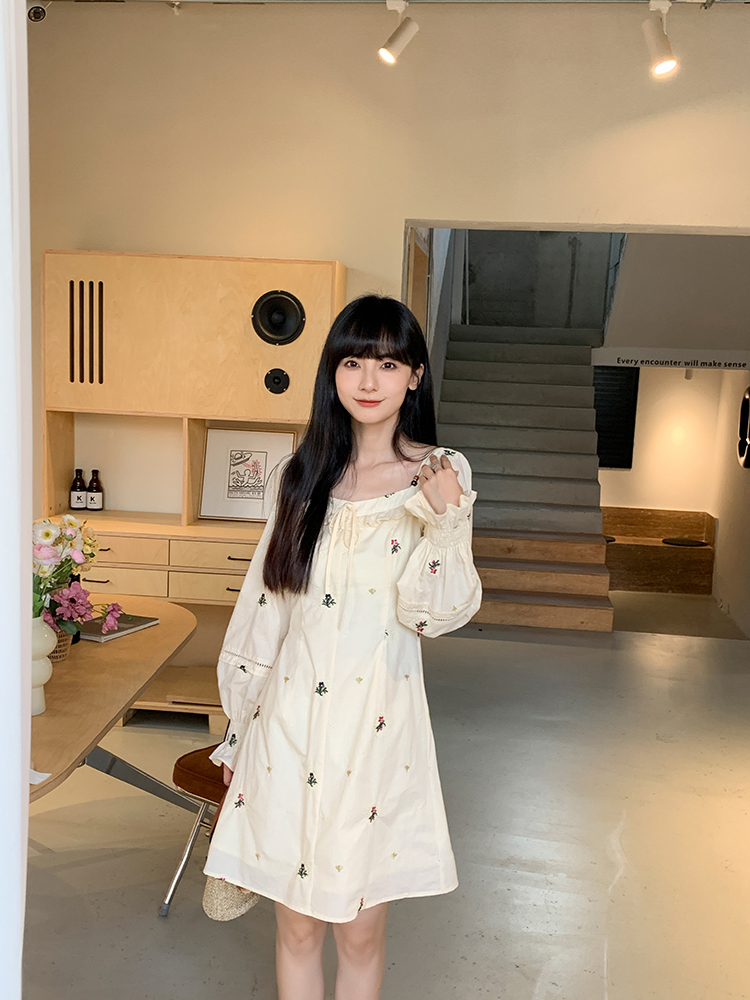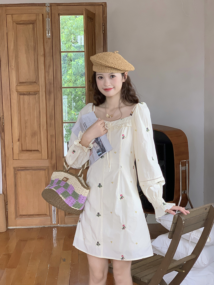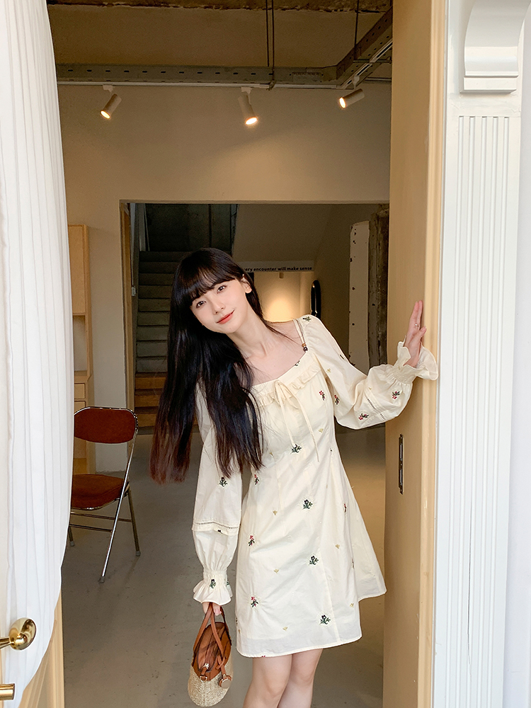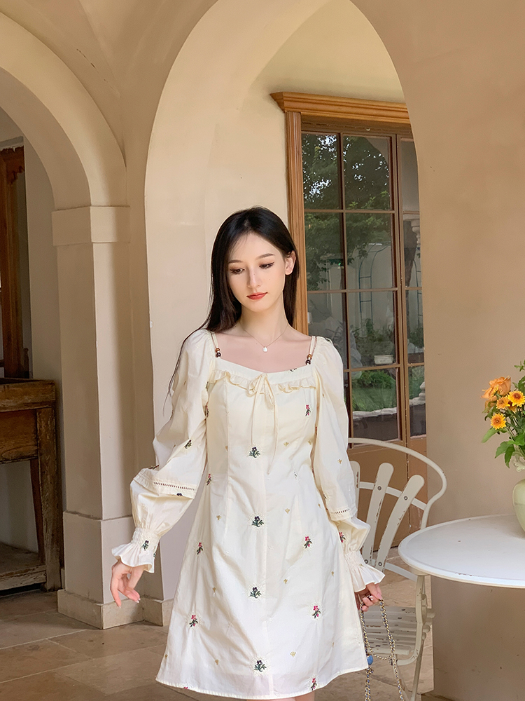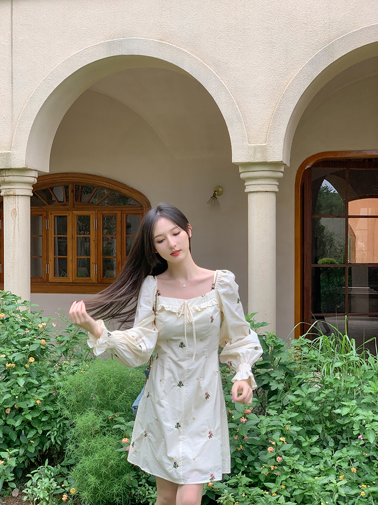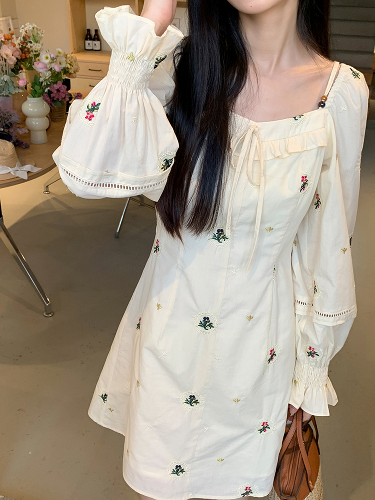 小鎮姍姍 清風鈴蘭~法式溫柔方領繡花襯衫全棉長袖碎花a字洋裝