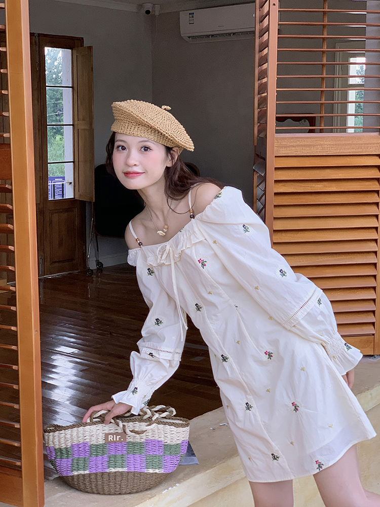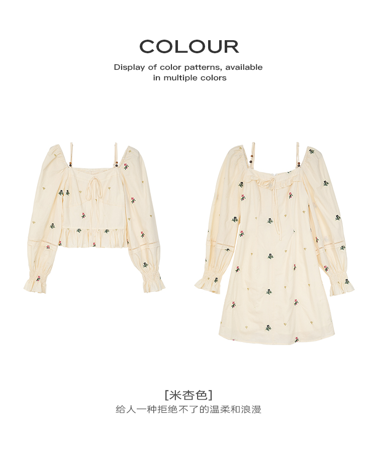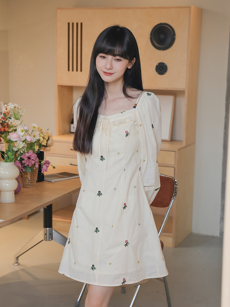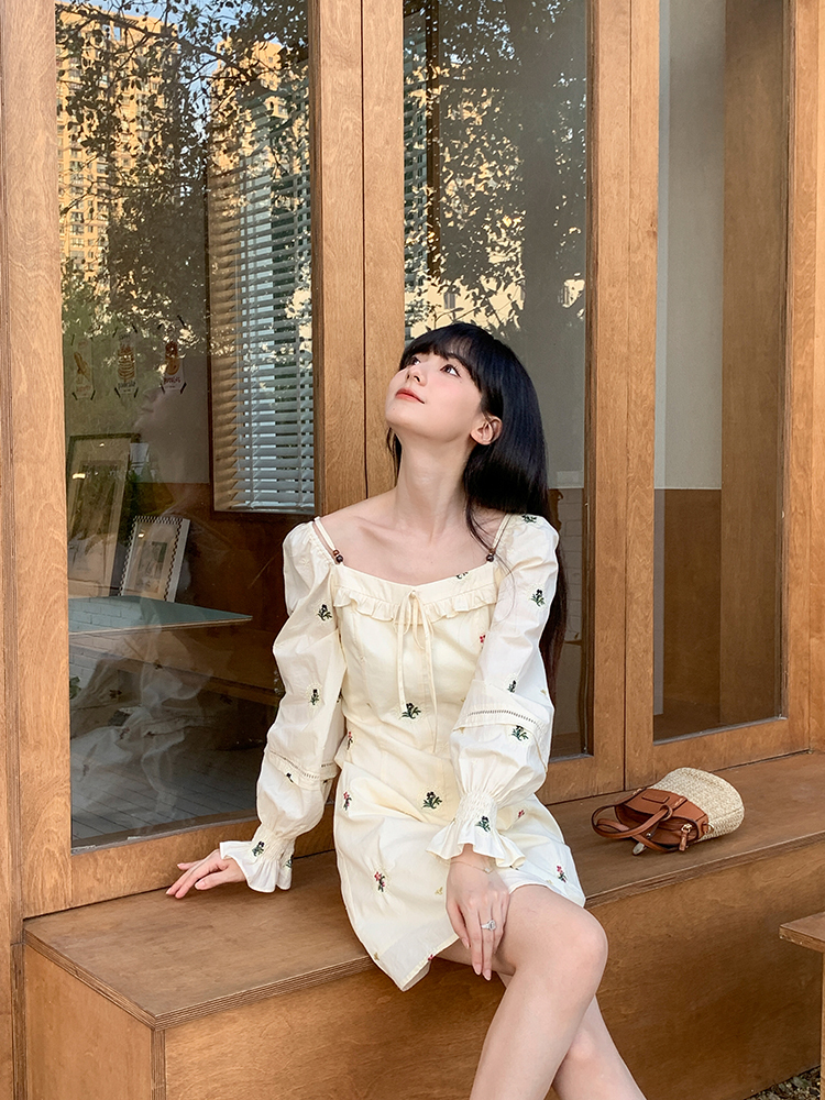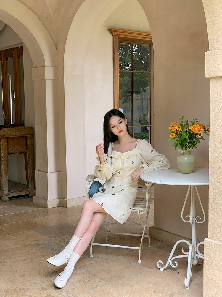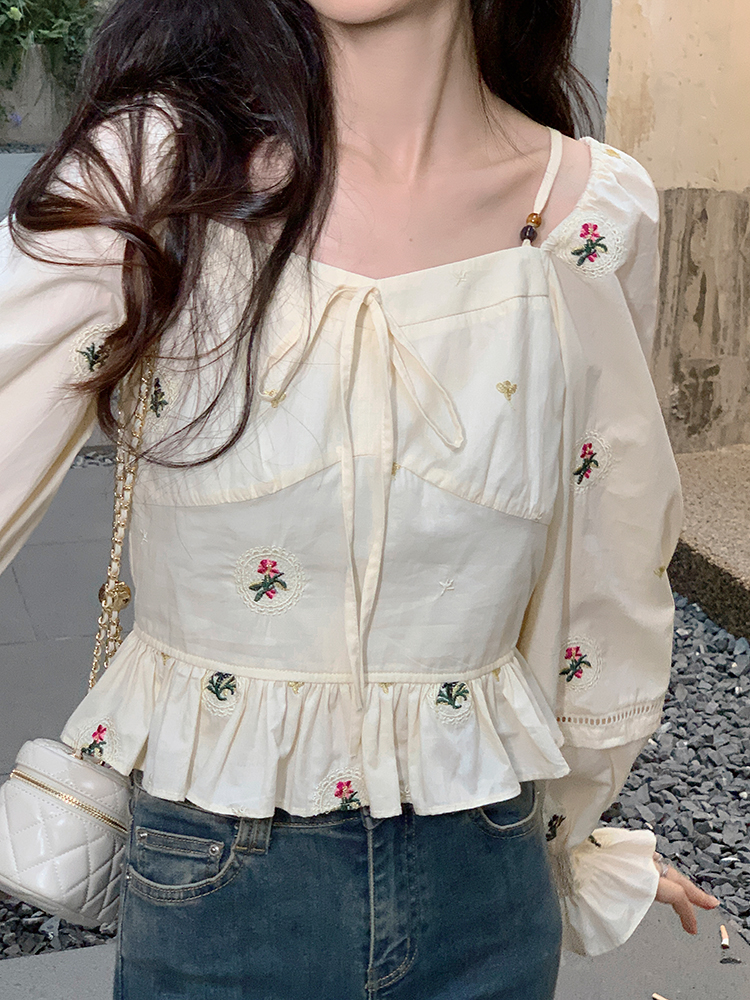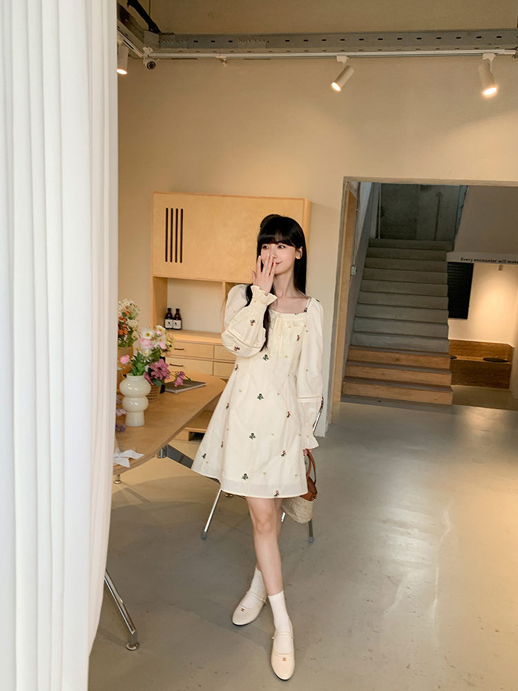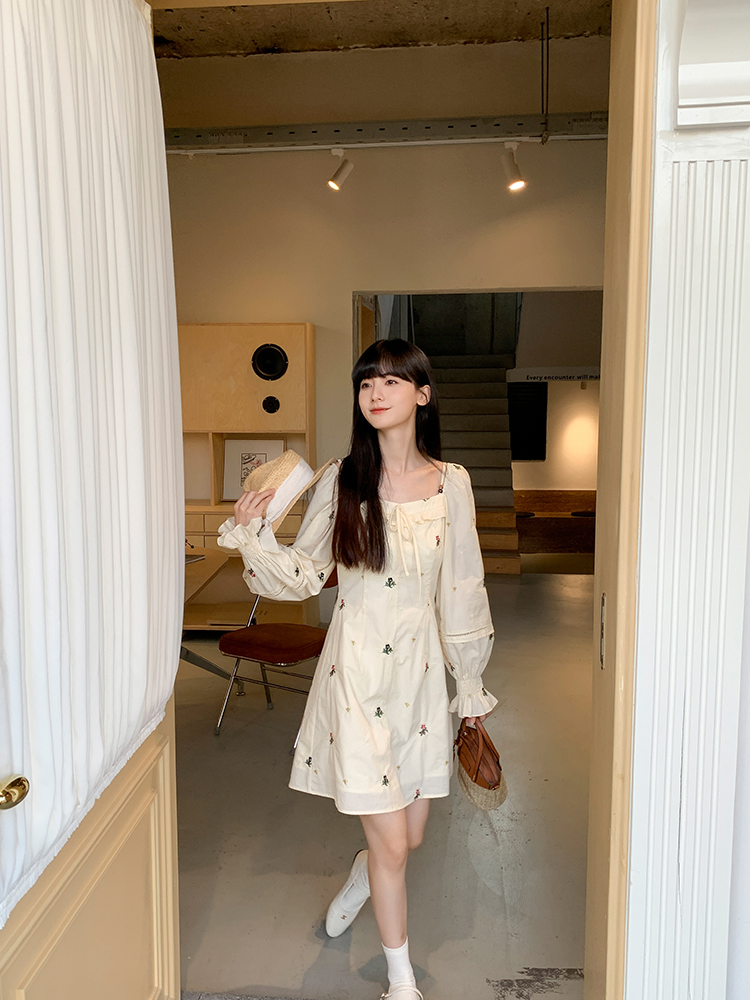 小鎮姍姍 清風鈴蘭~法式溫柔方領繡花襯衫全棉長袖碎花a字洋裝