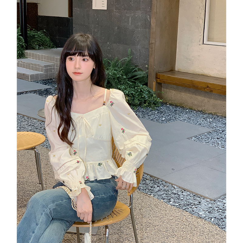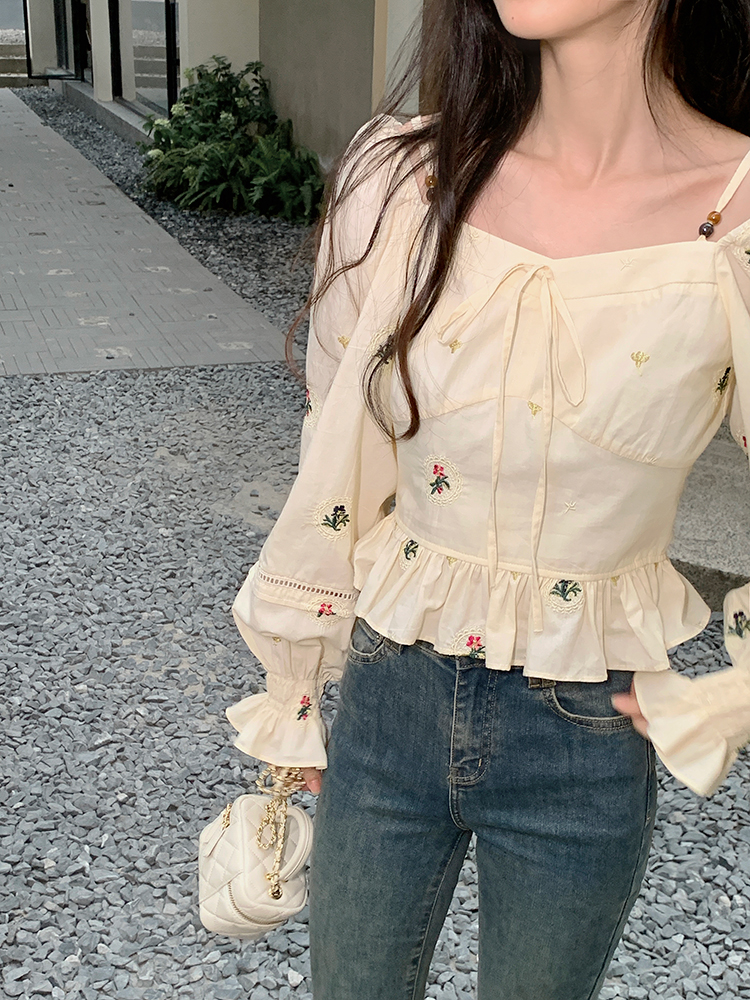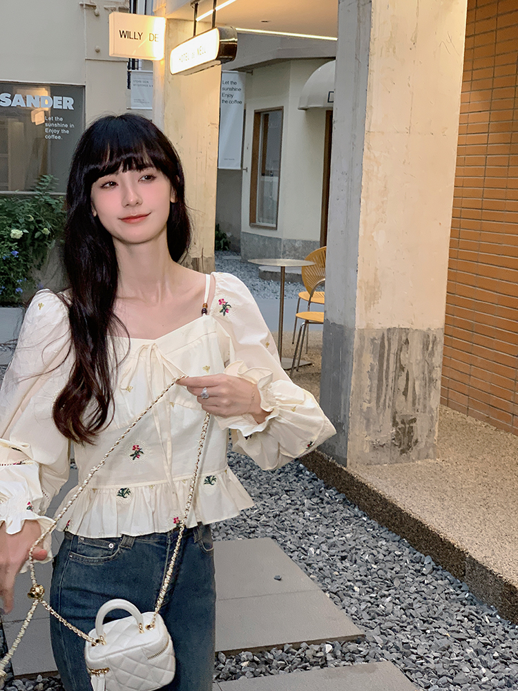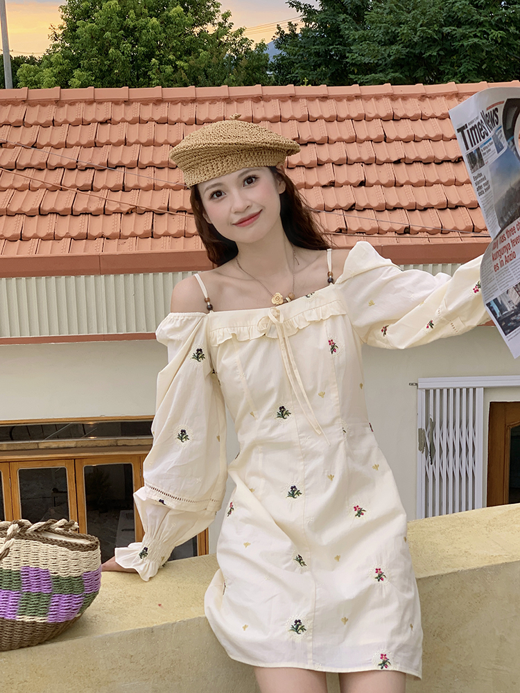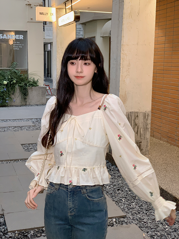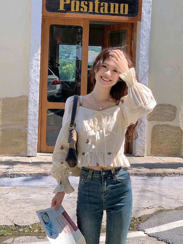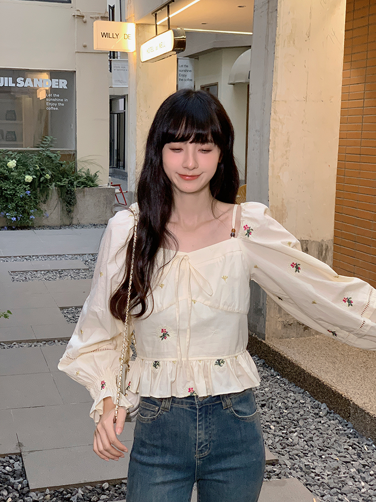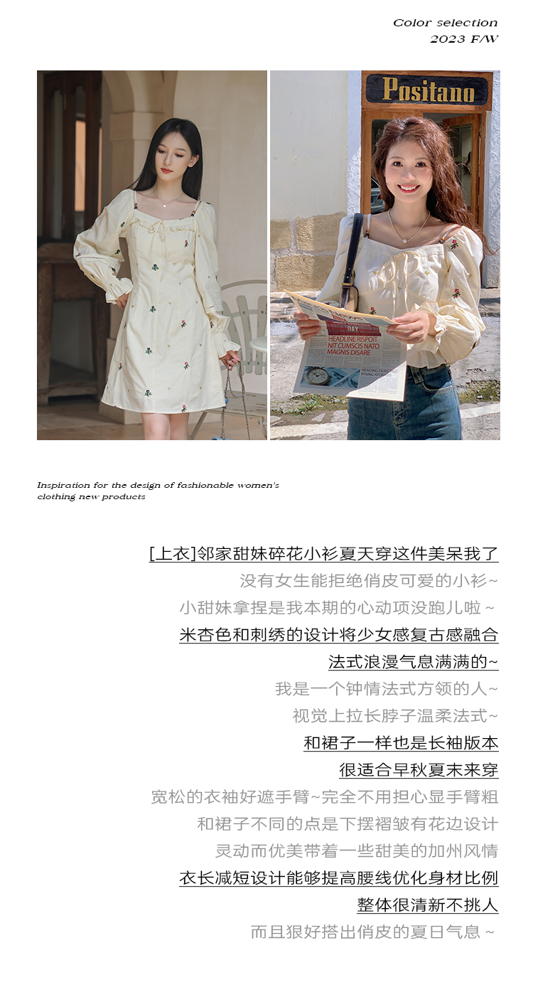 小鎮姍姍 清風鈴蘭~法式溫柔方領繡花襯衫全棉長袖碎花a字洋裝