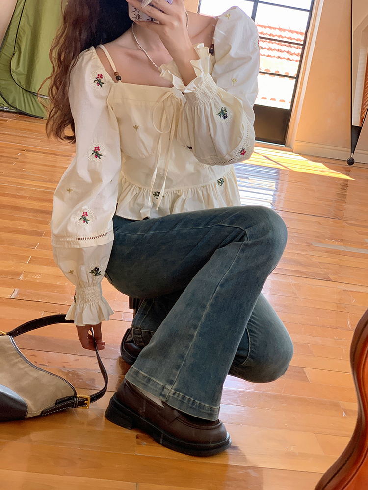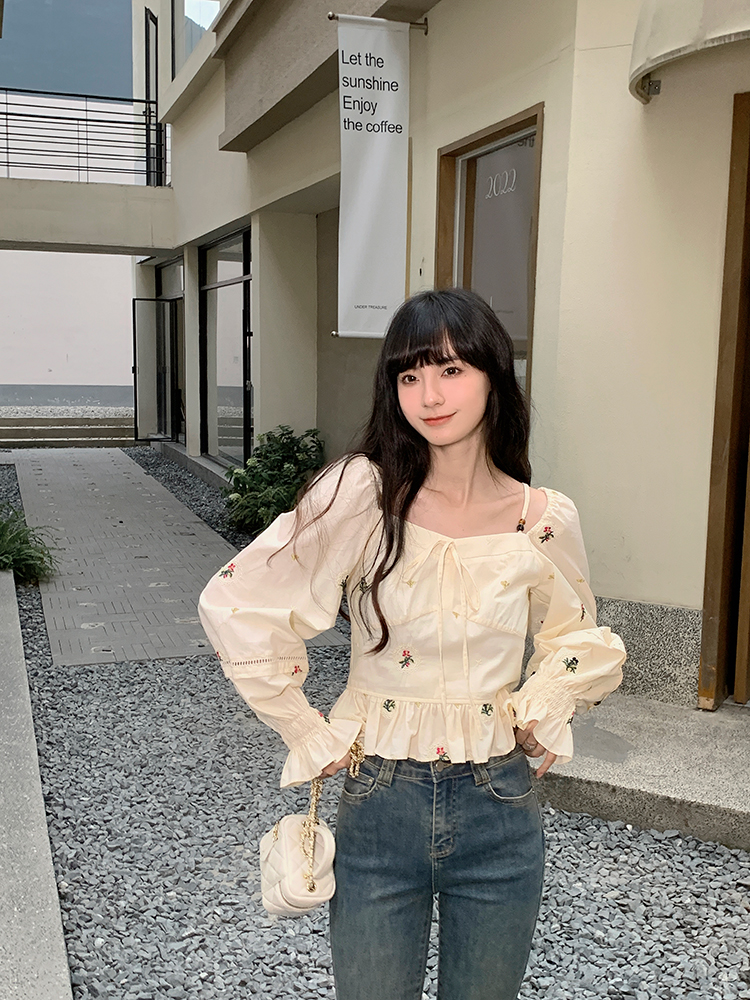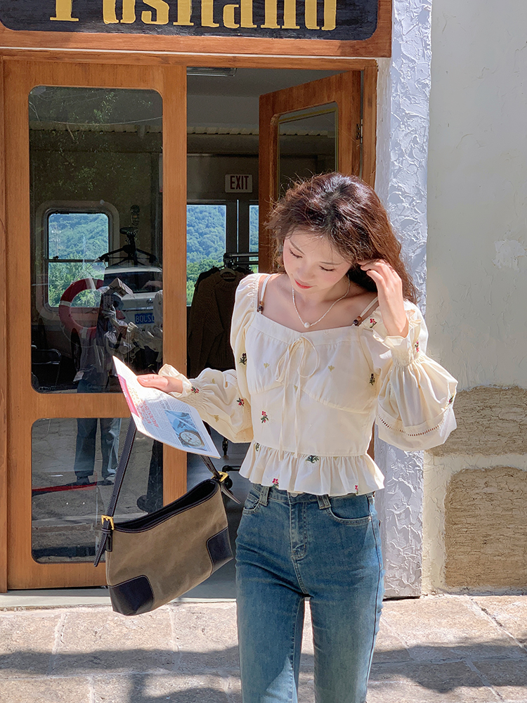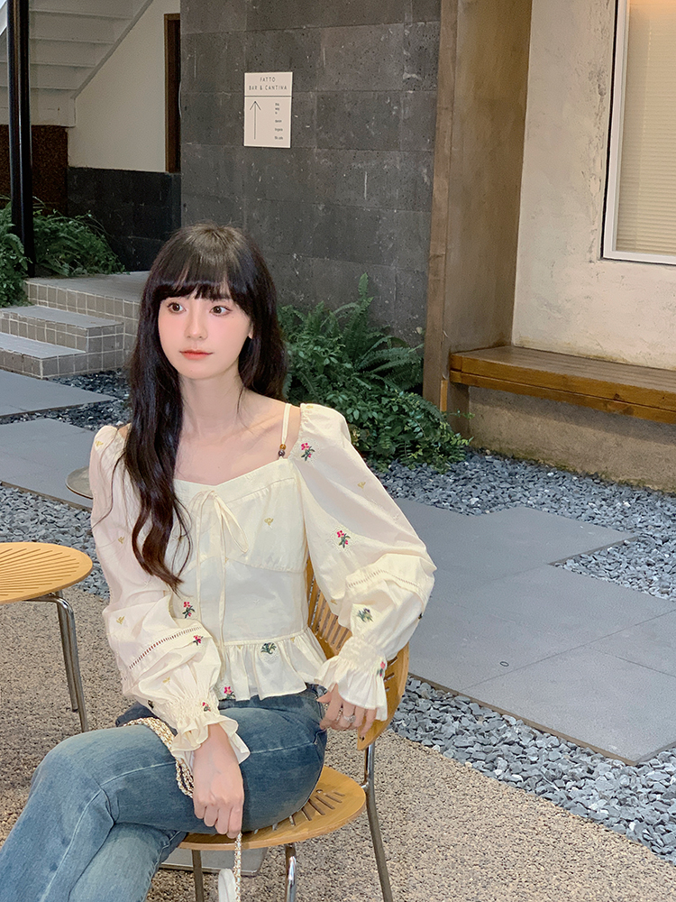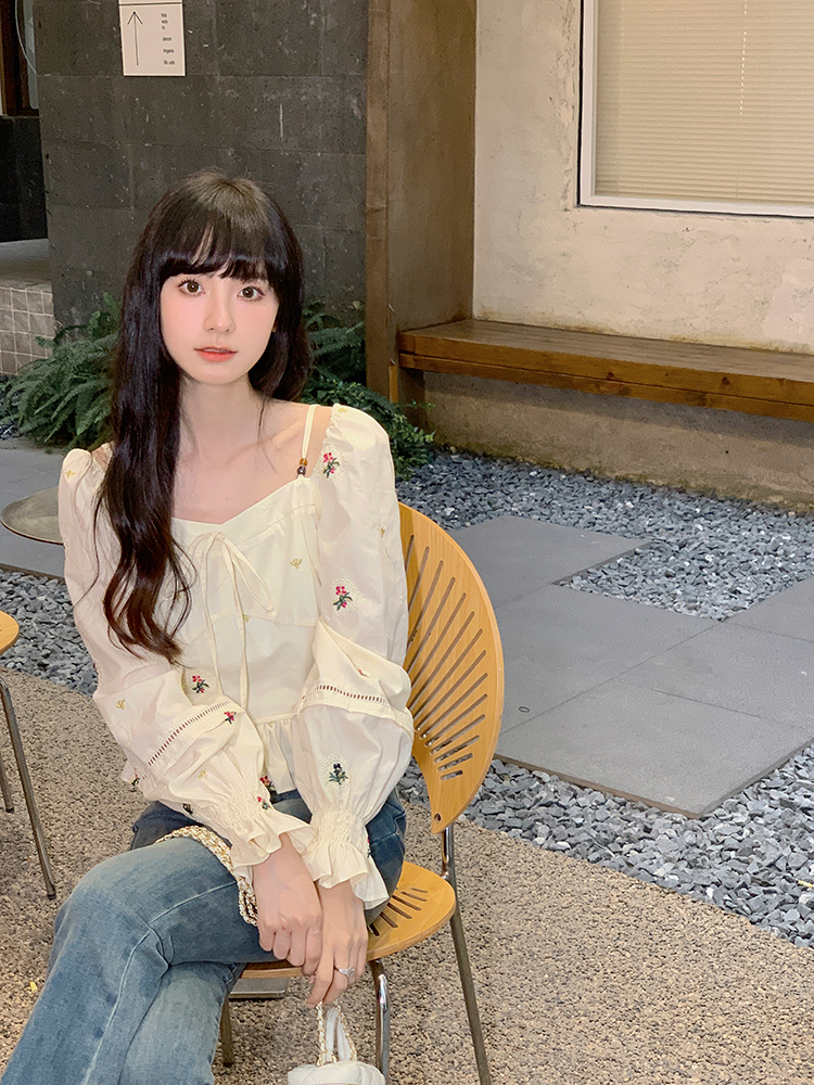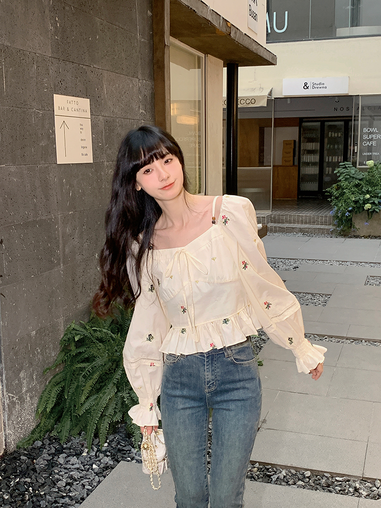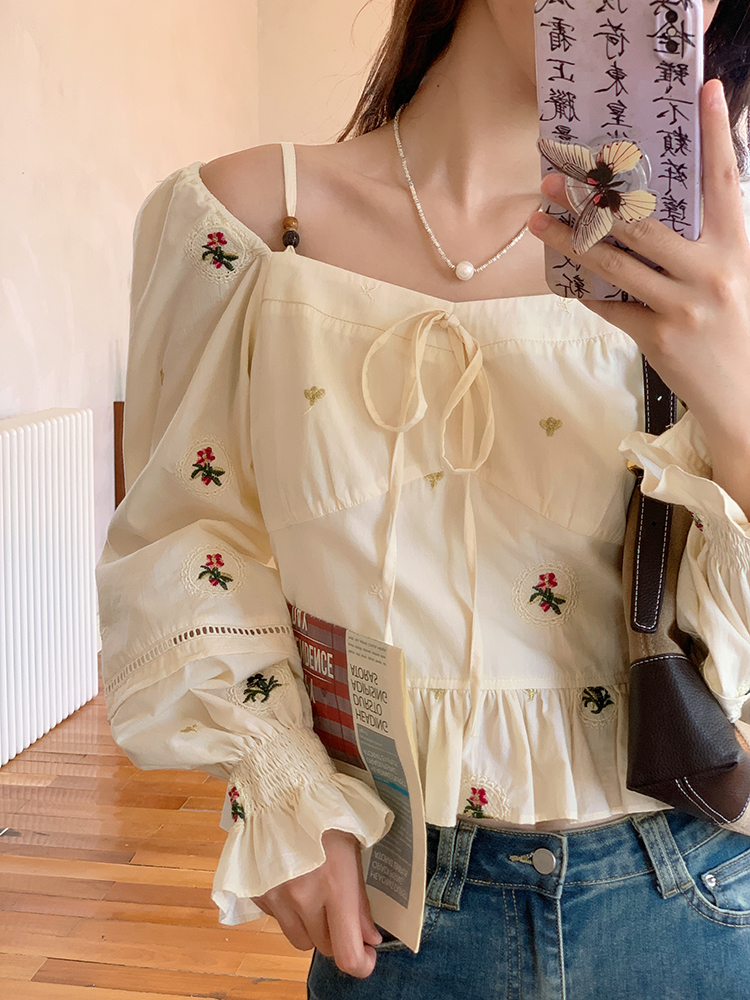 小鎮姍姍 清風鈴蘭~法式溫柔方領繡花襯衫全棉長袖碎花a字洋裝