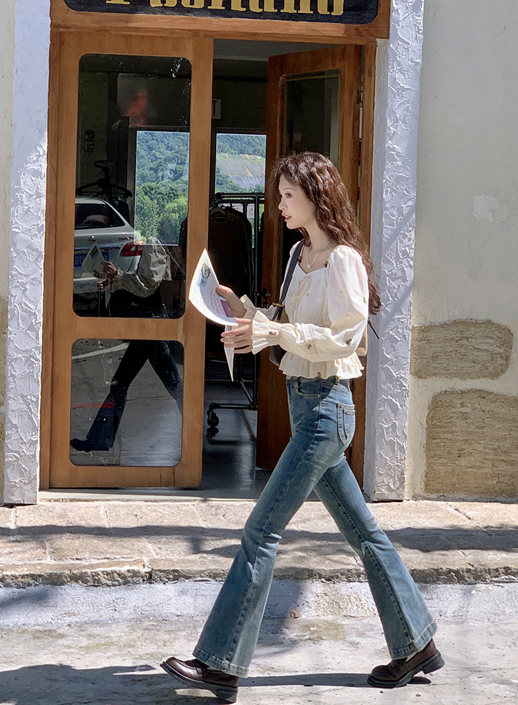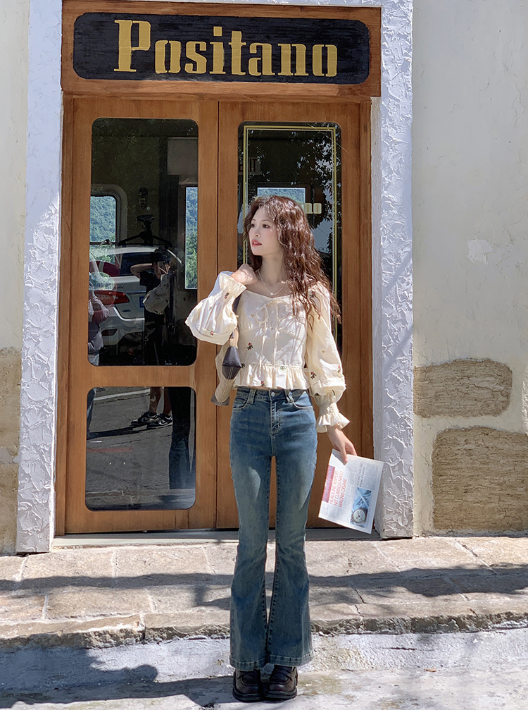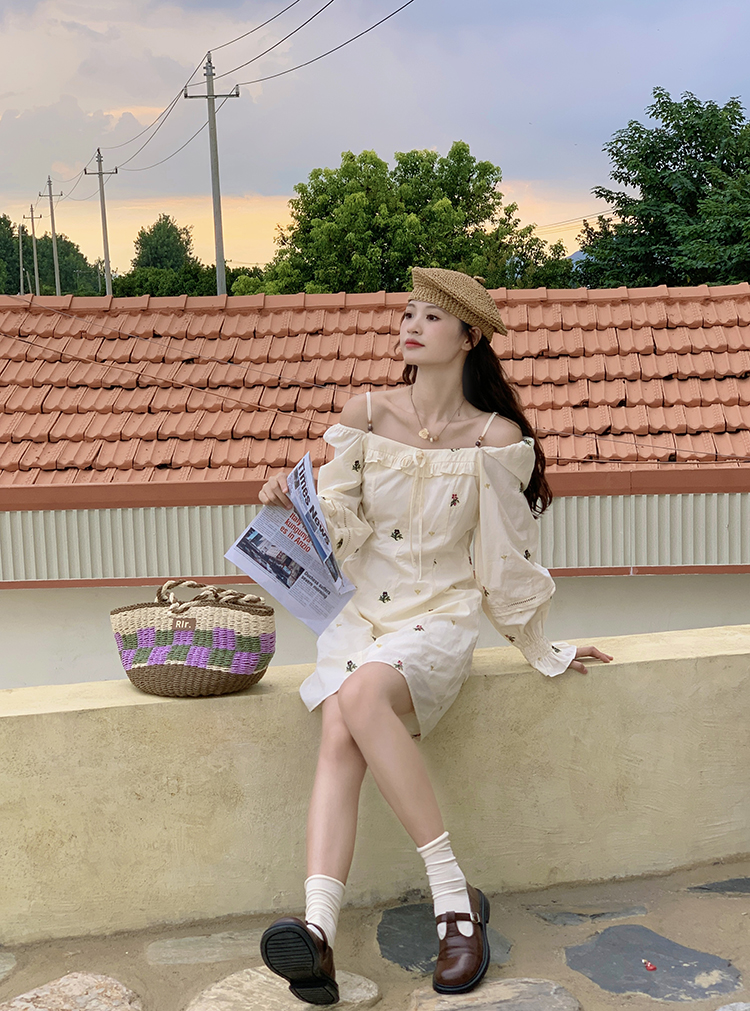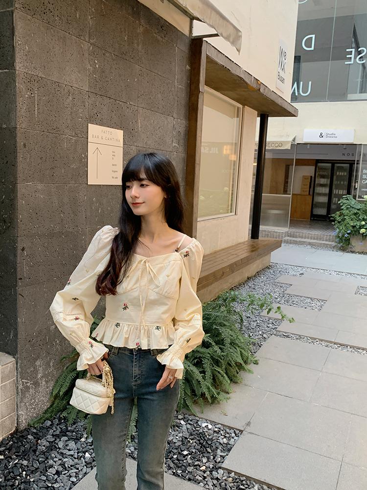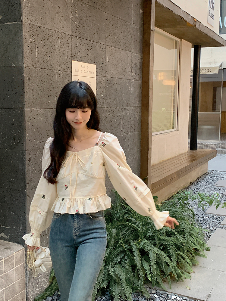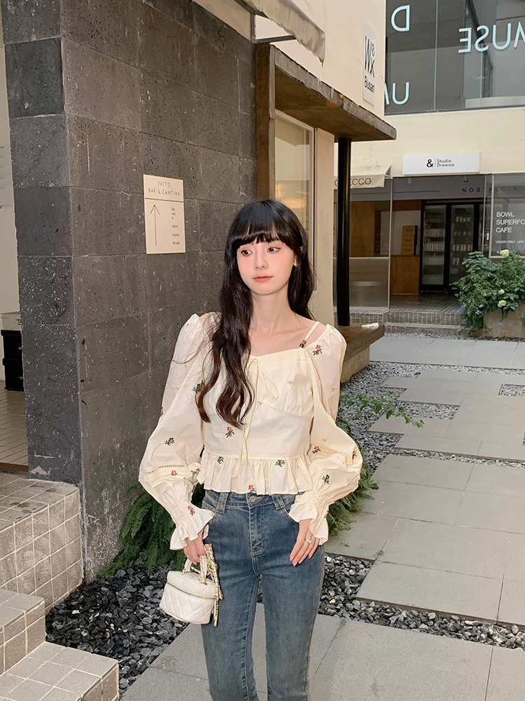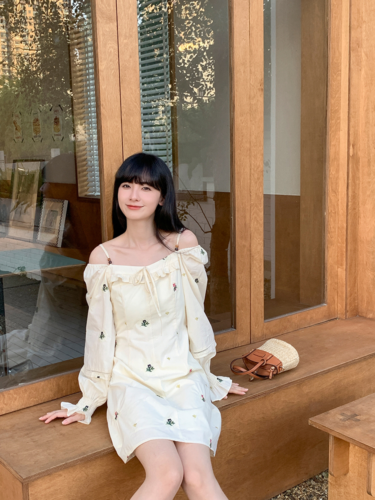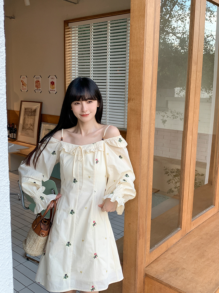 小鎮姍姍 清風鈴蘭~法式溫柔方領繡花襯衫全棉長袖碎花a字洋裝