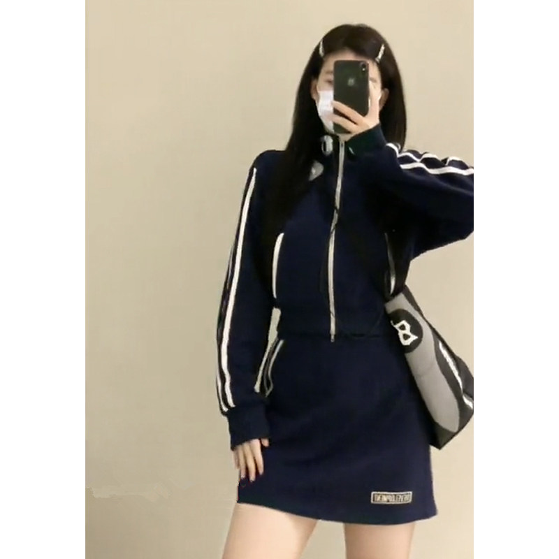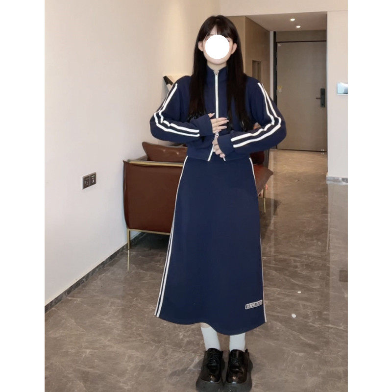 卡布斯辣定製美式復古雙拉鍊長袖外套+半身裙女秋季胖mm遮肉套裝
