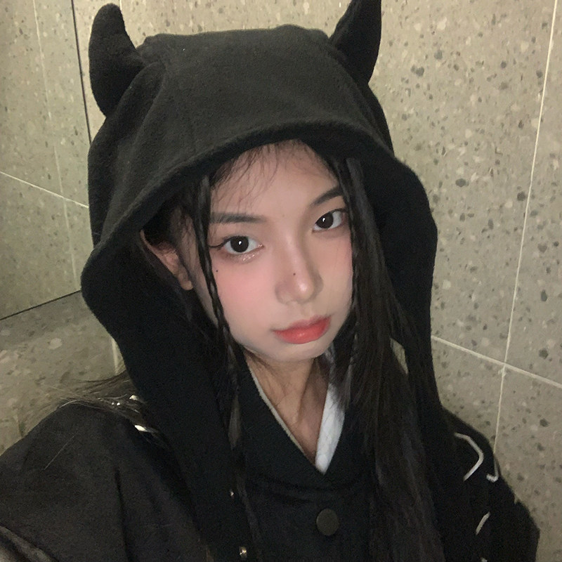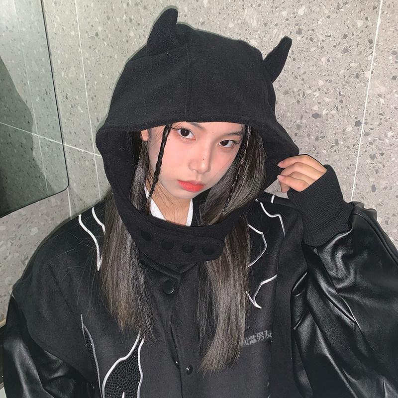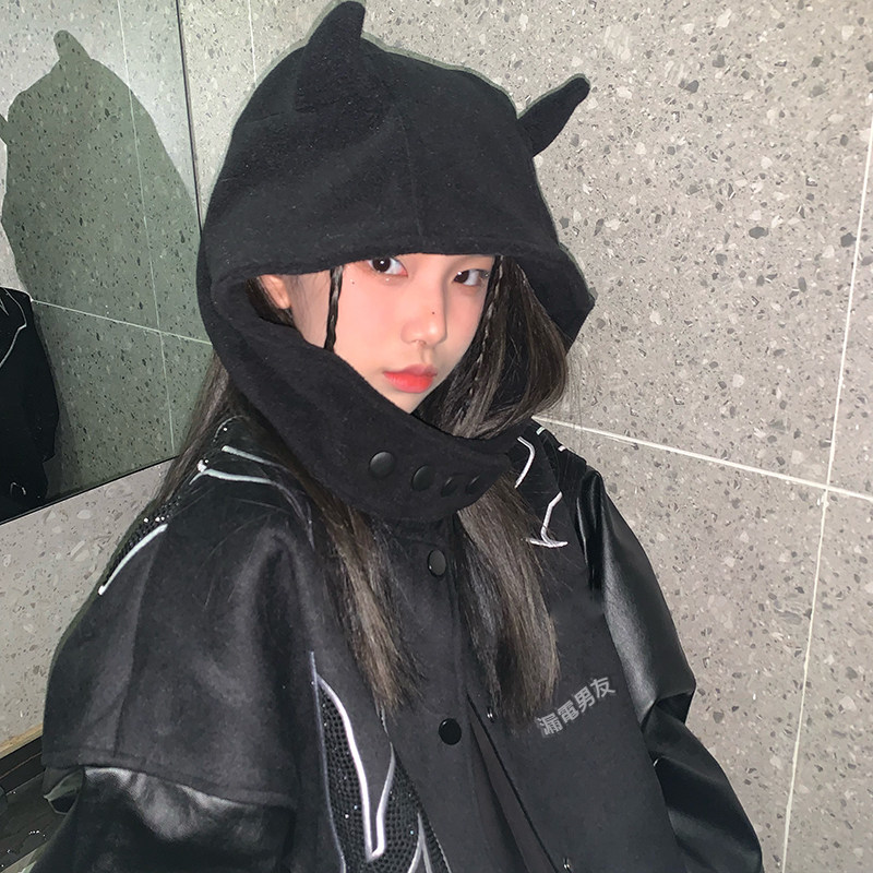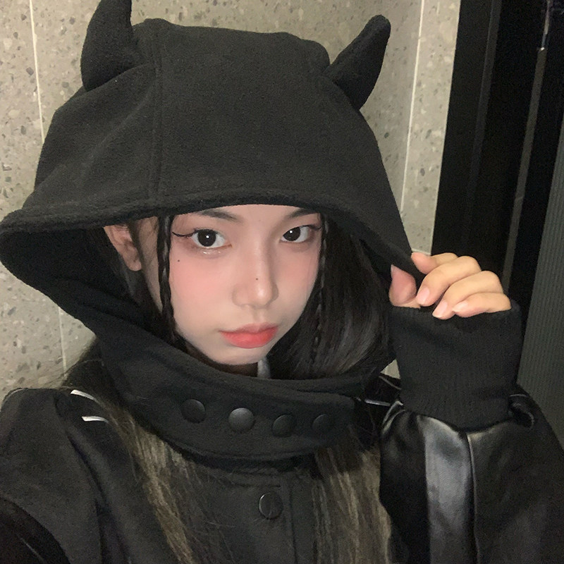 冬日保暖黑色可愛亞比小惡魔耳朵雷鋒帽牛角朋克護耳萬聖節包頭帽