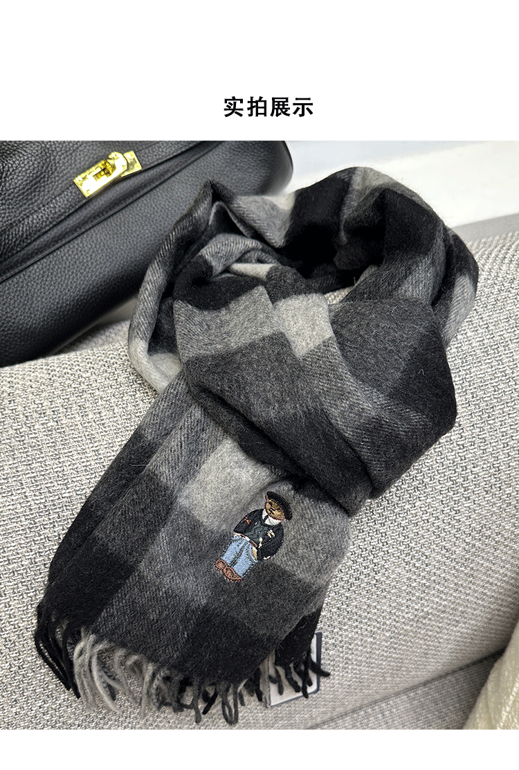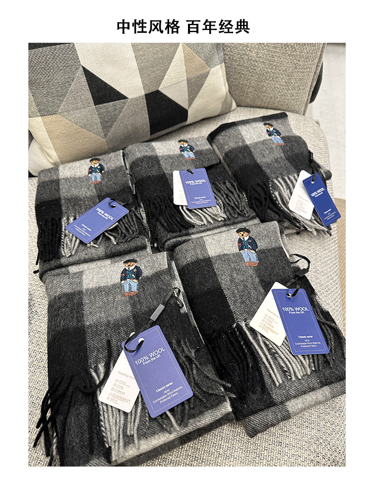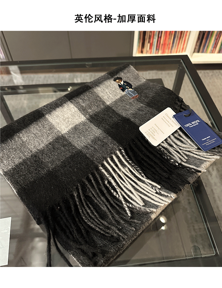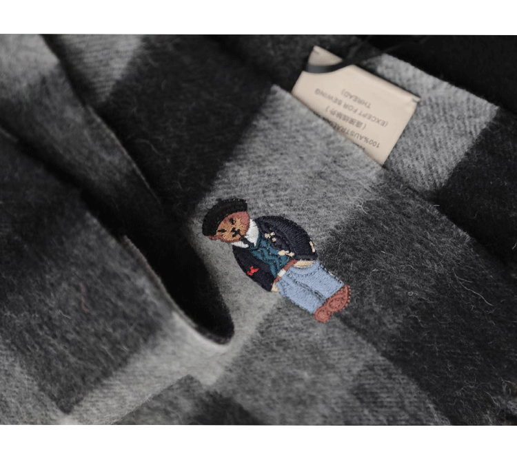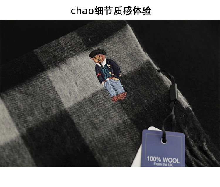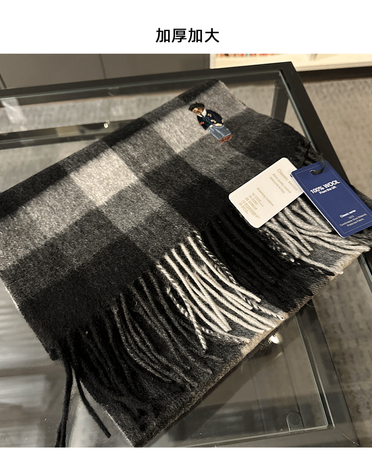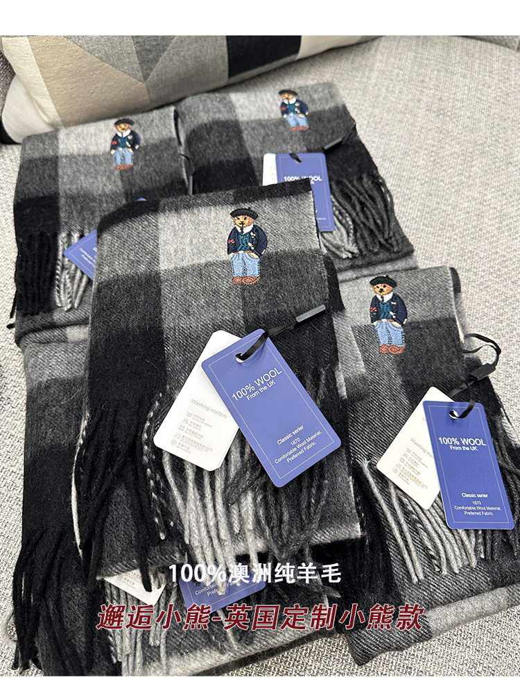限量發售!英倫經典小熊100%澳洲羊毛圍巾女冬季格子百搭情侶圍脖