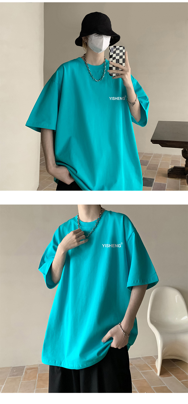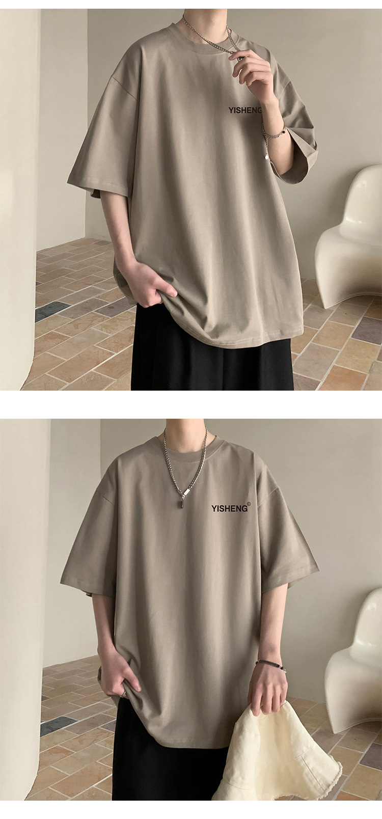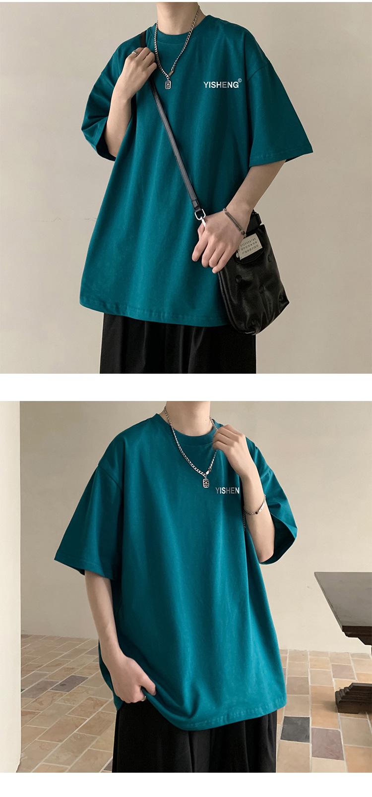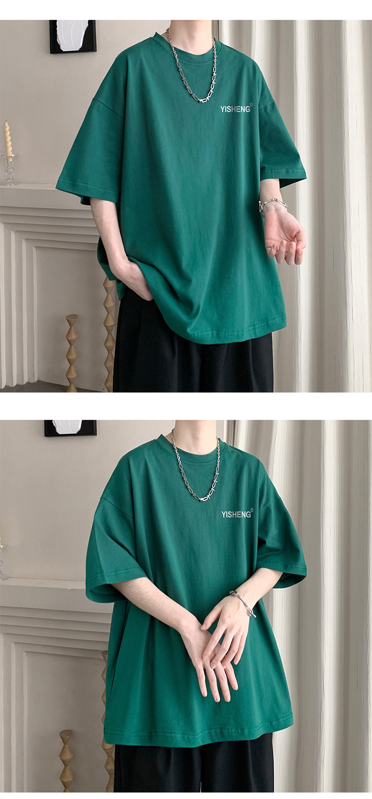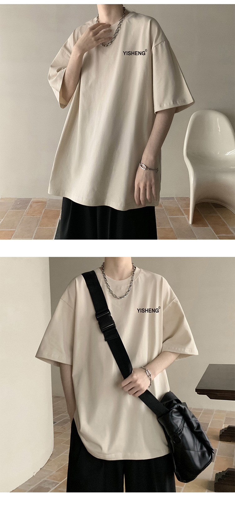 chic港味T恤情侶短袖夏季高克重小領口上衣男潮流古著百搭五分袖