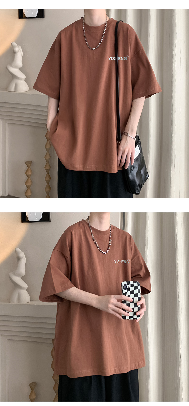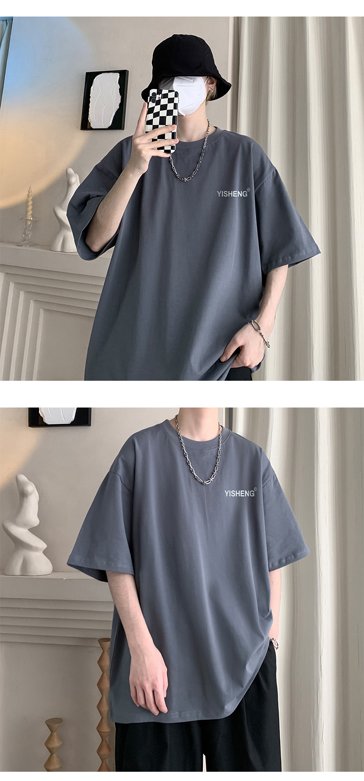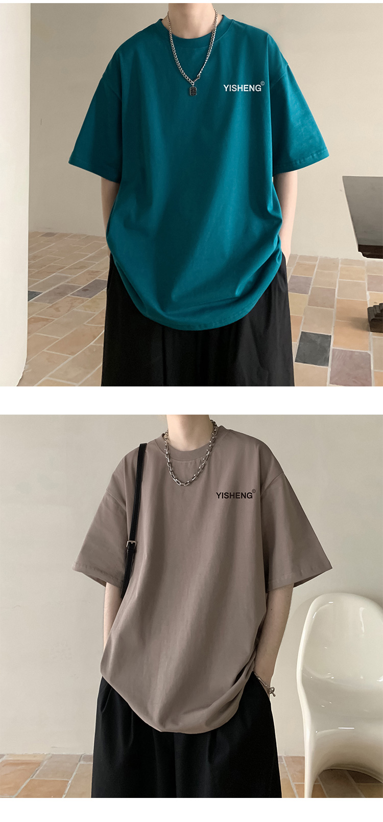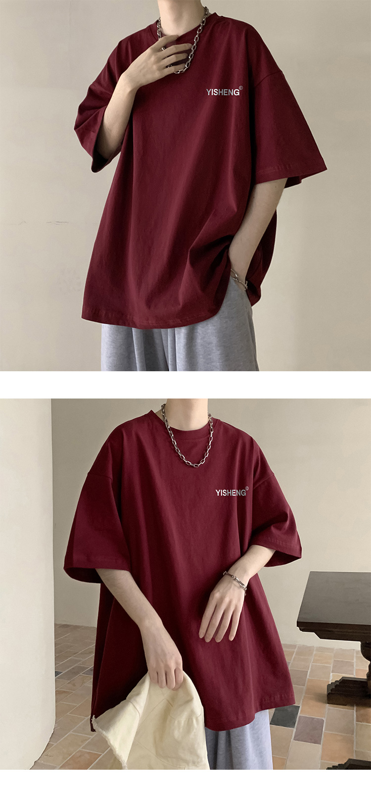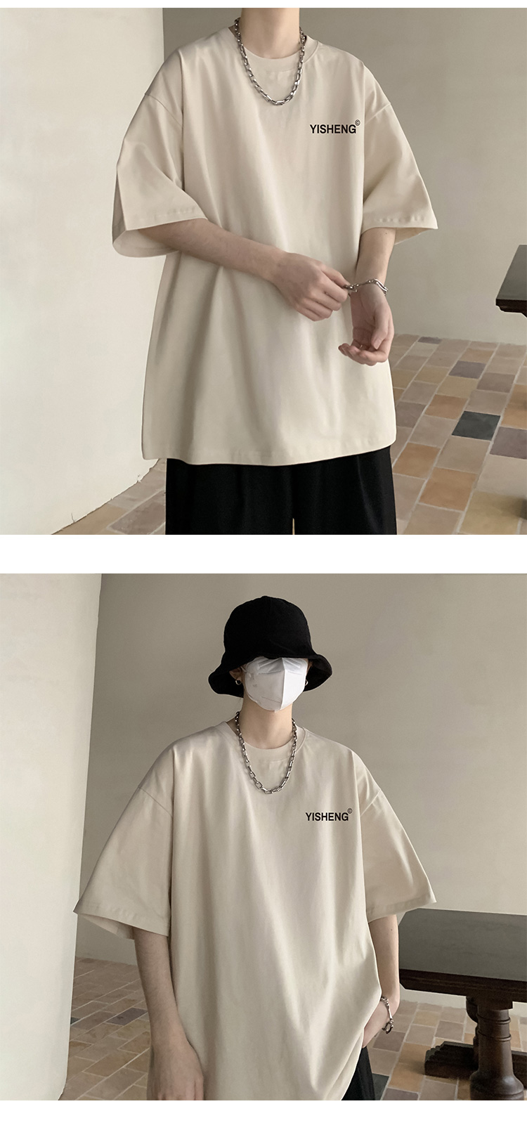 chic港味T恤情侶短袖夏季高克重小領口上衣男潮流古著百搭五分袖