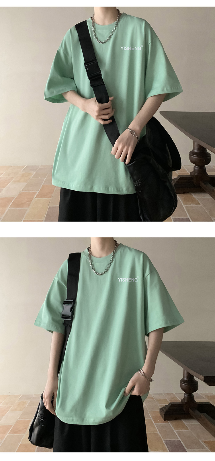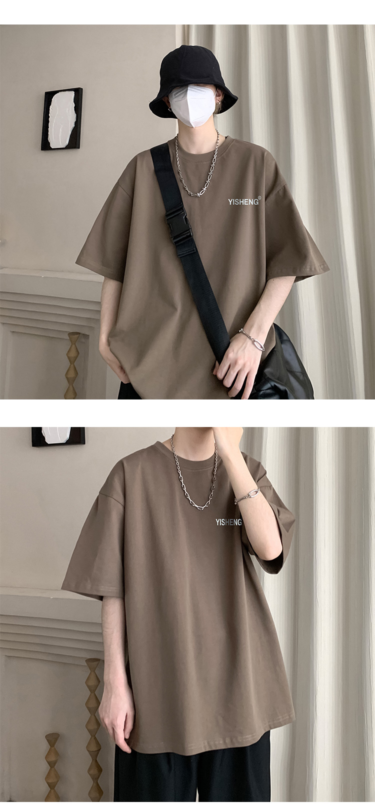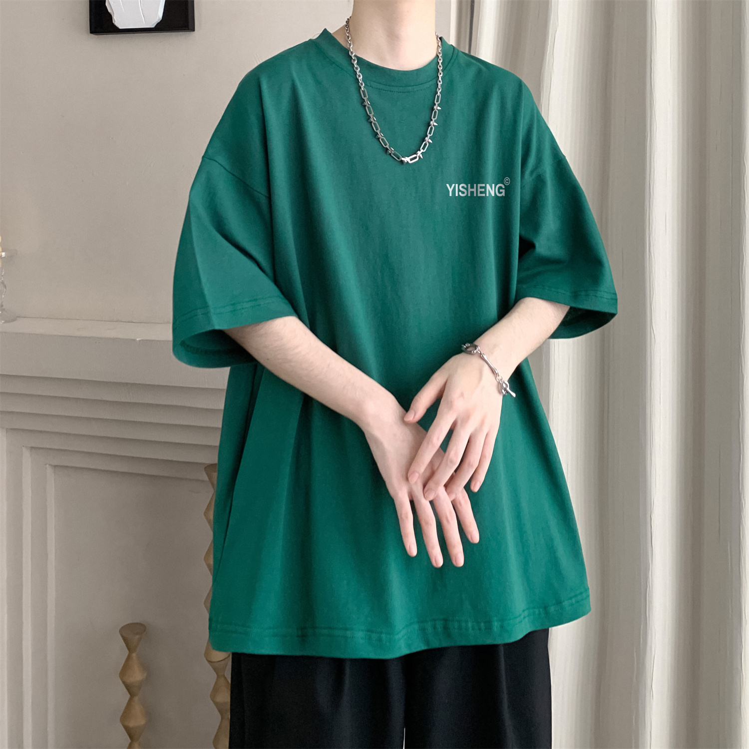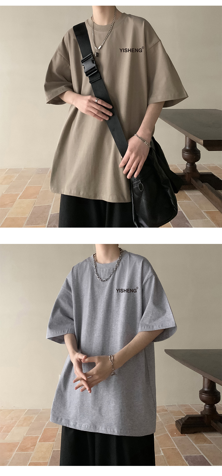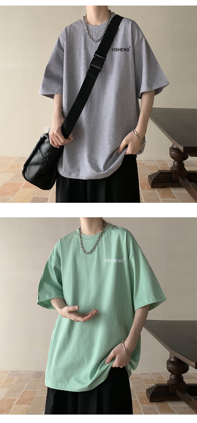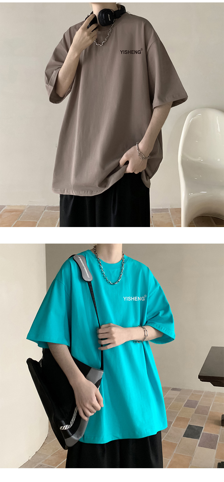 chic港味T恤情侶短袖夏季高克重小領口上衣男潮流古著百搭五分袖