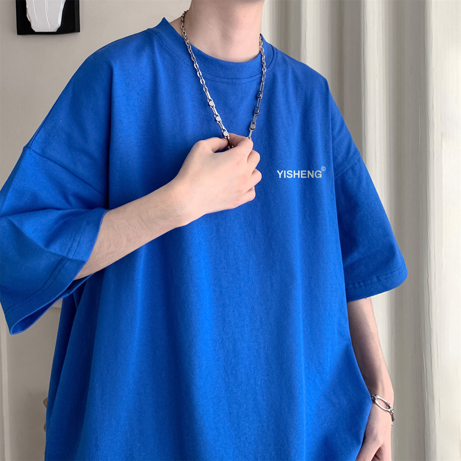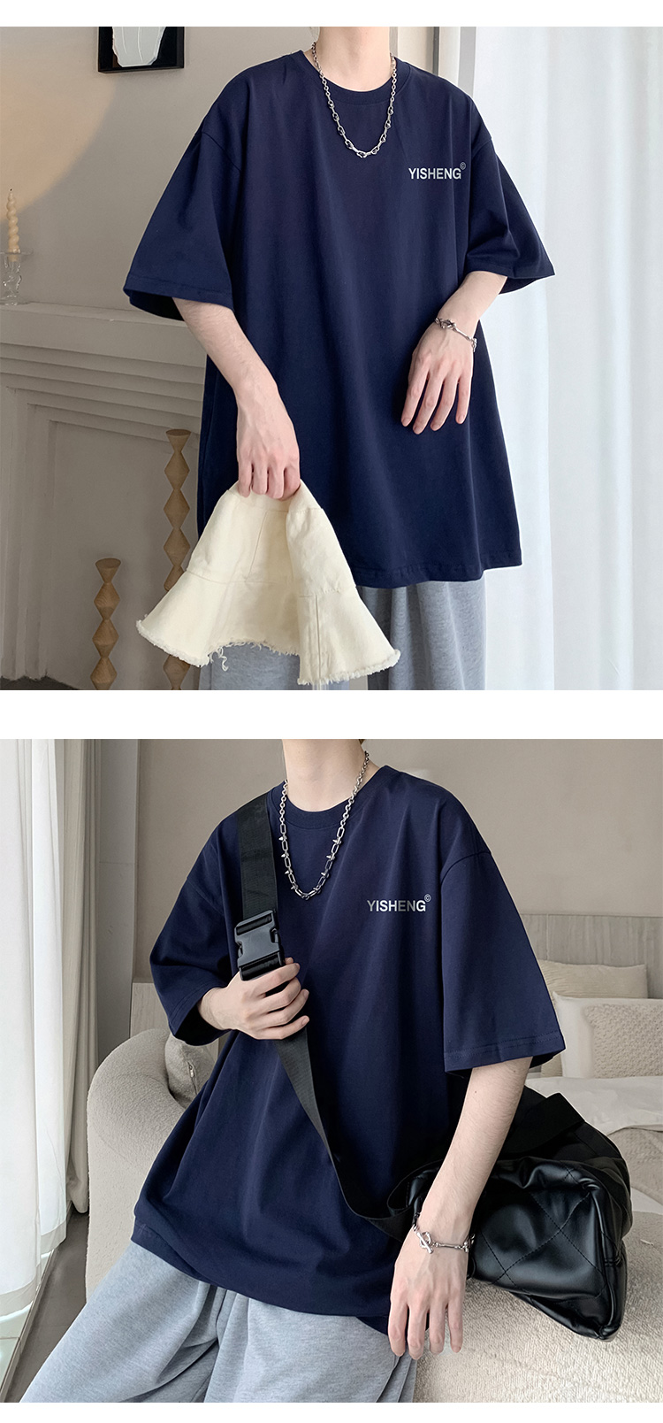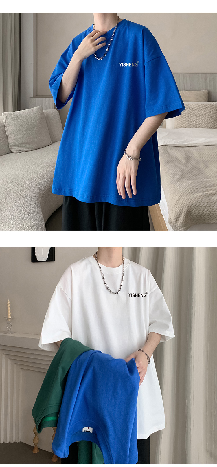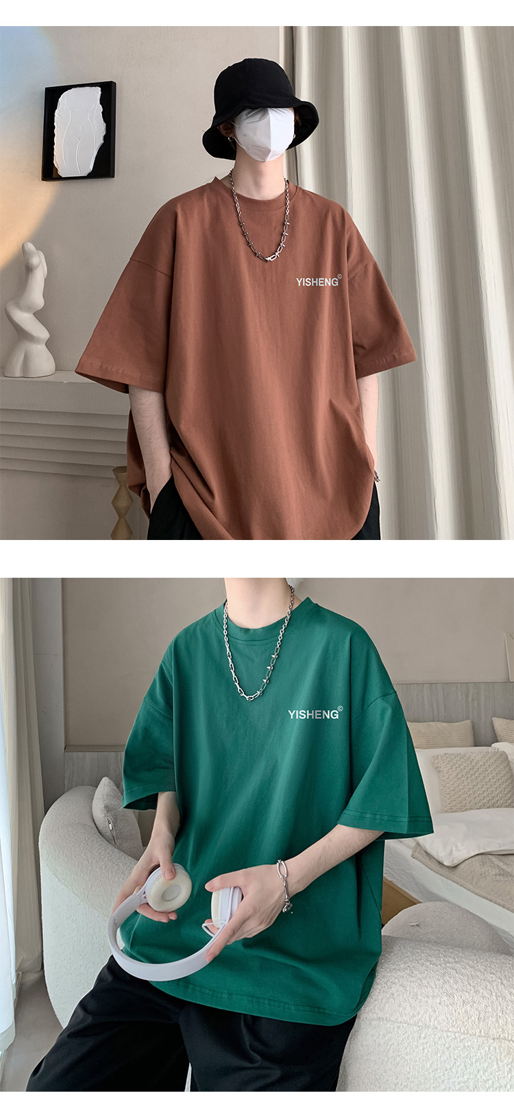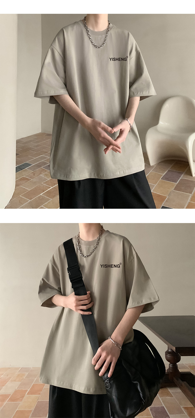chic港味T恤情侶短袖夏季高克重小領口上衣男潮流古著百搭五分袖