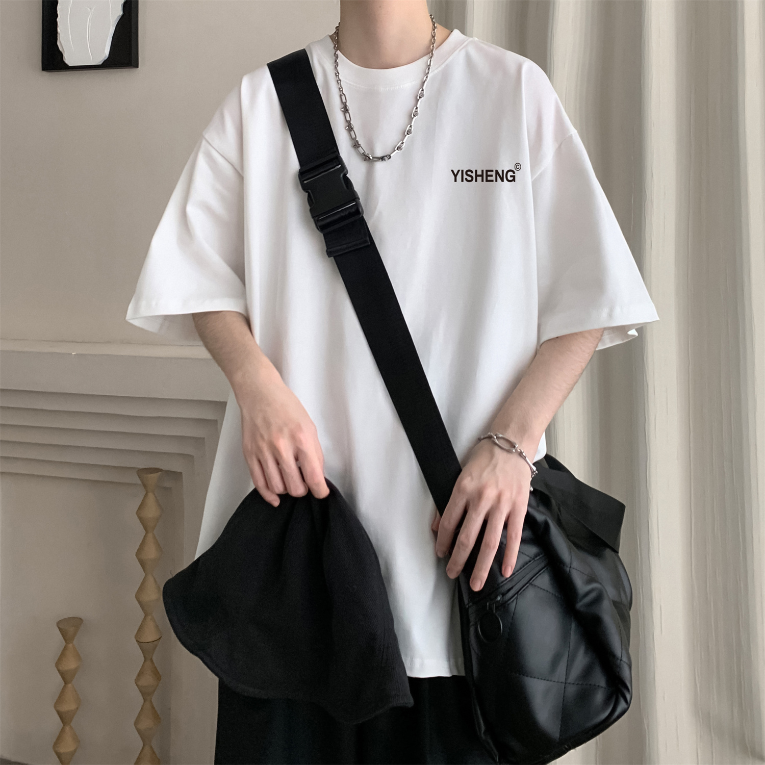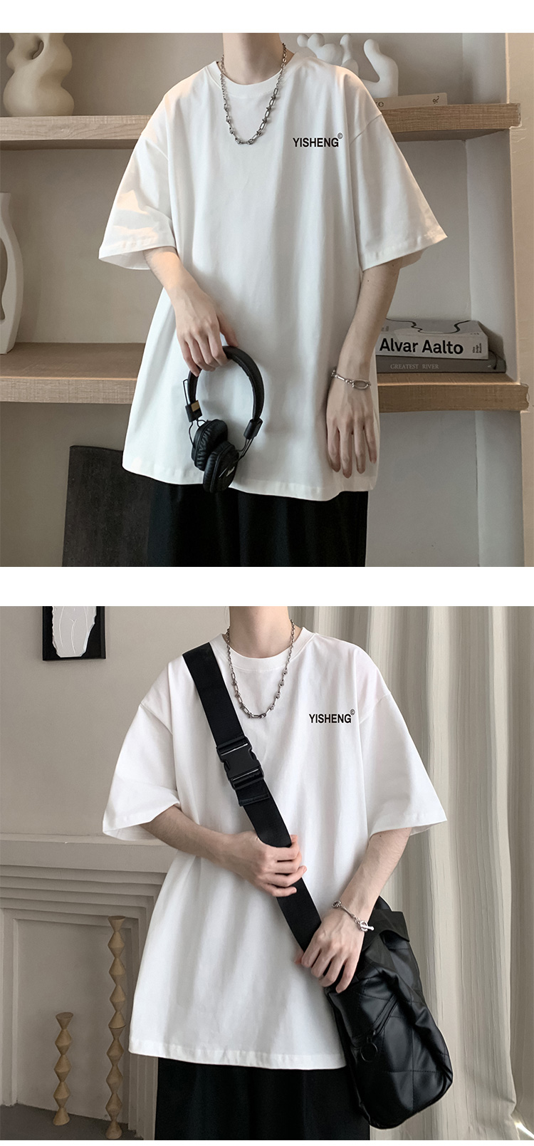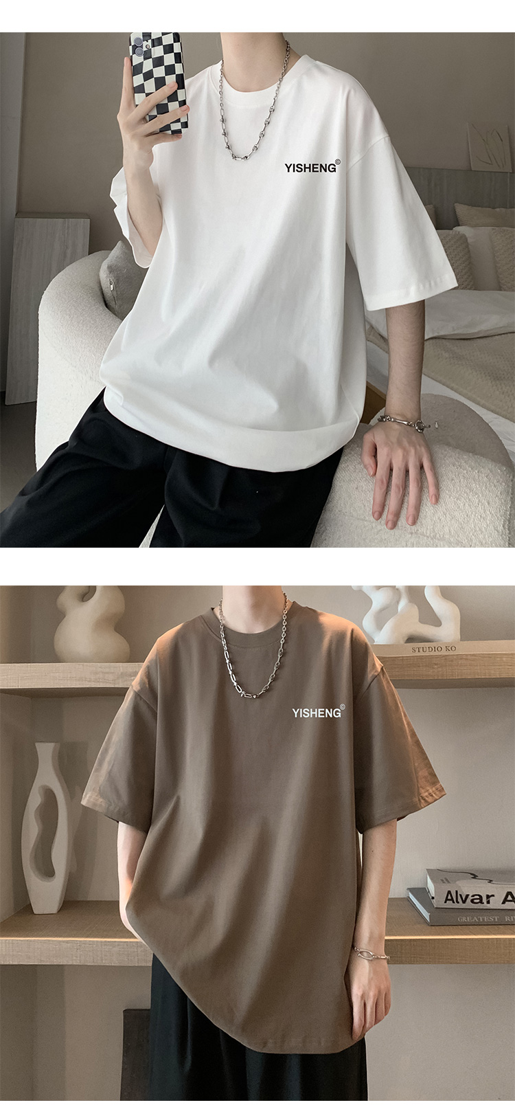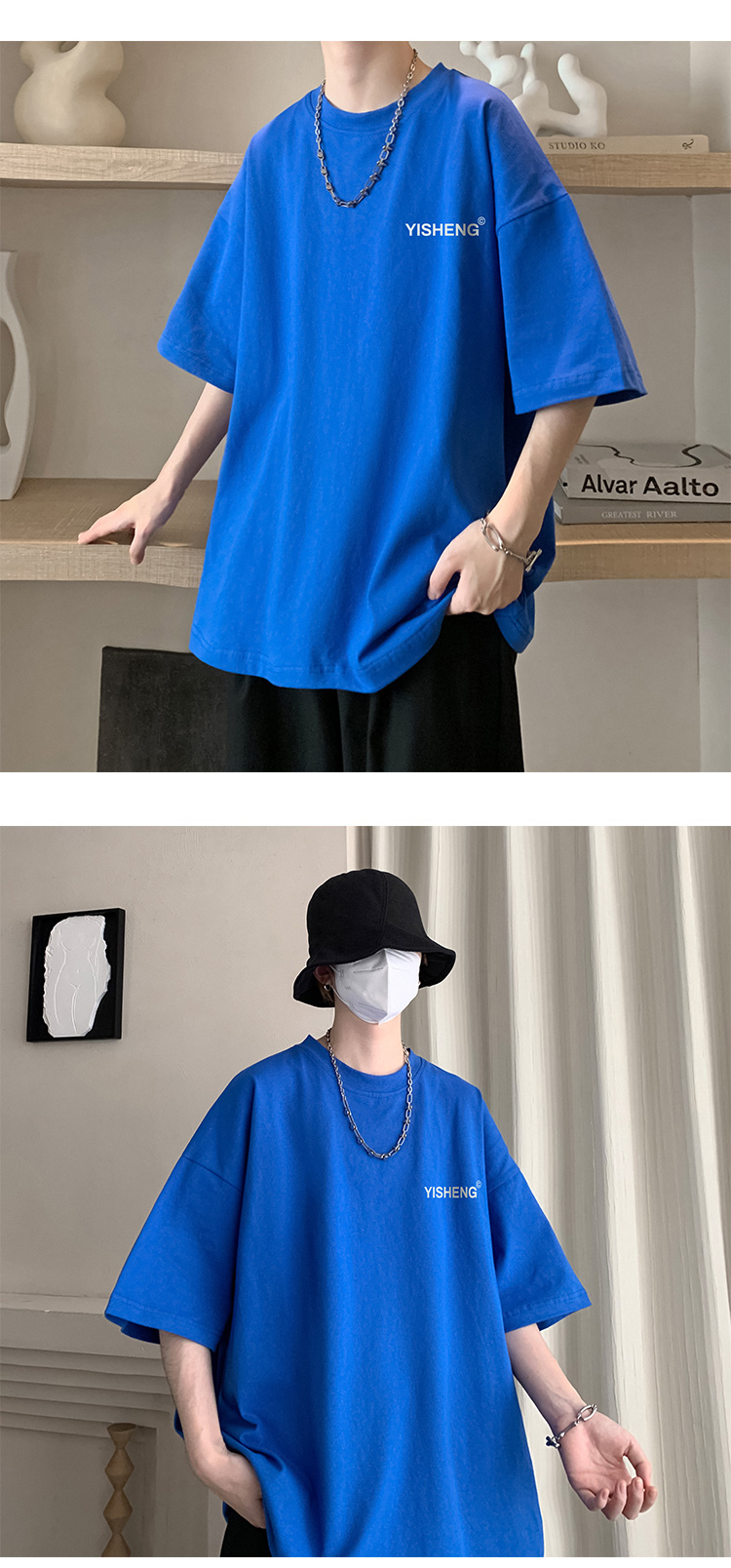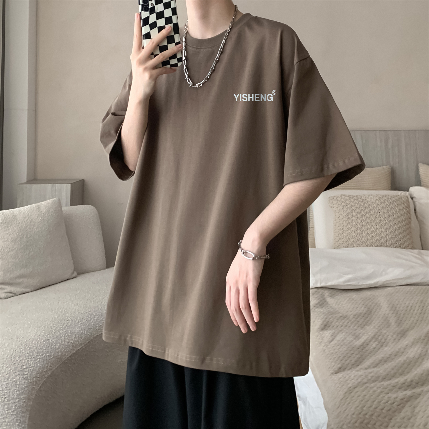 chic港味T恤情侶短袖夏季高克重小領口上衣男潮流古著百搭五分袖