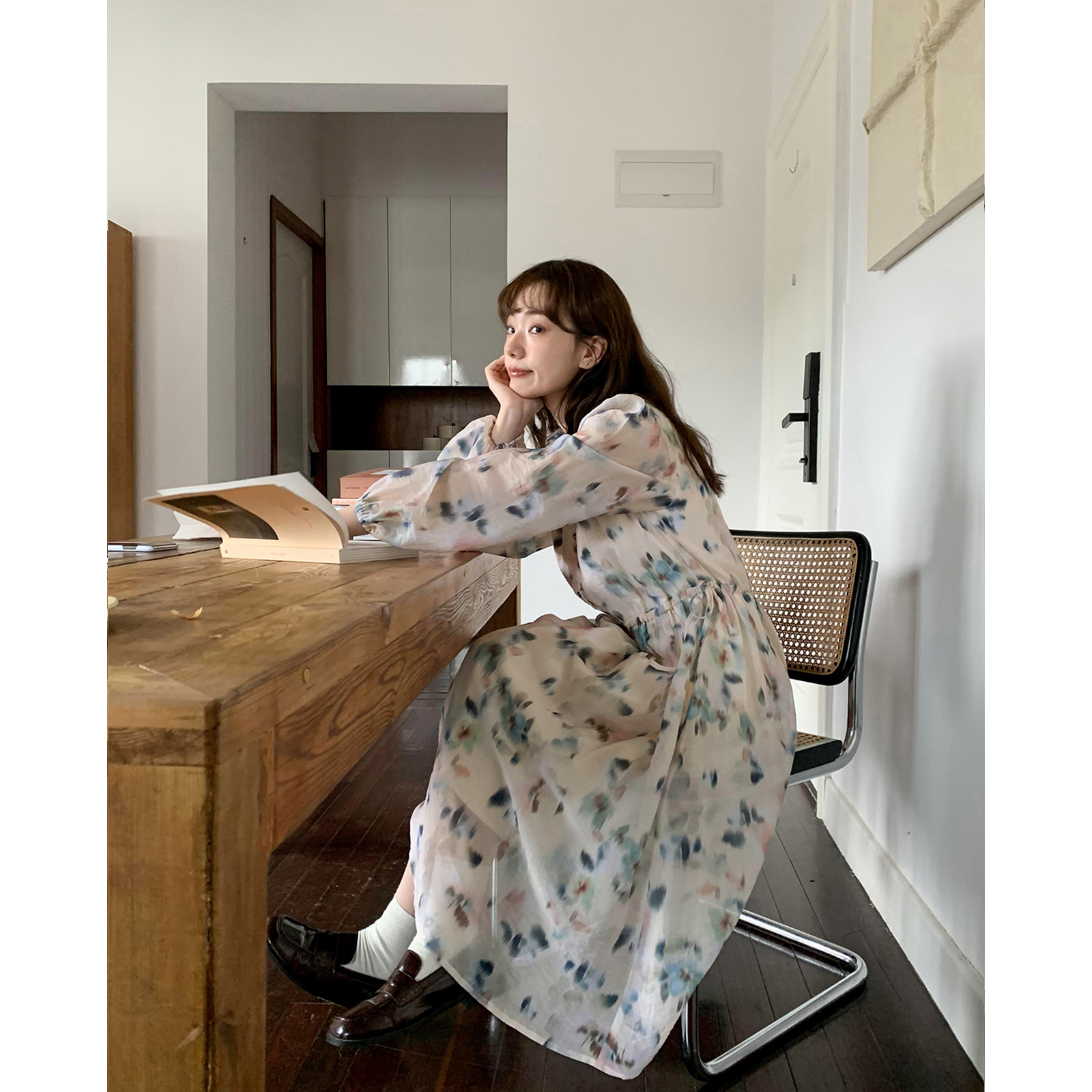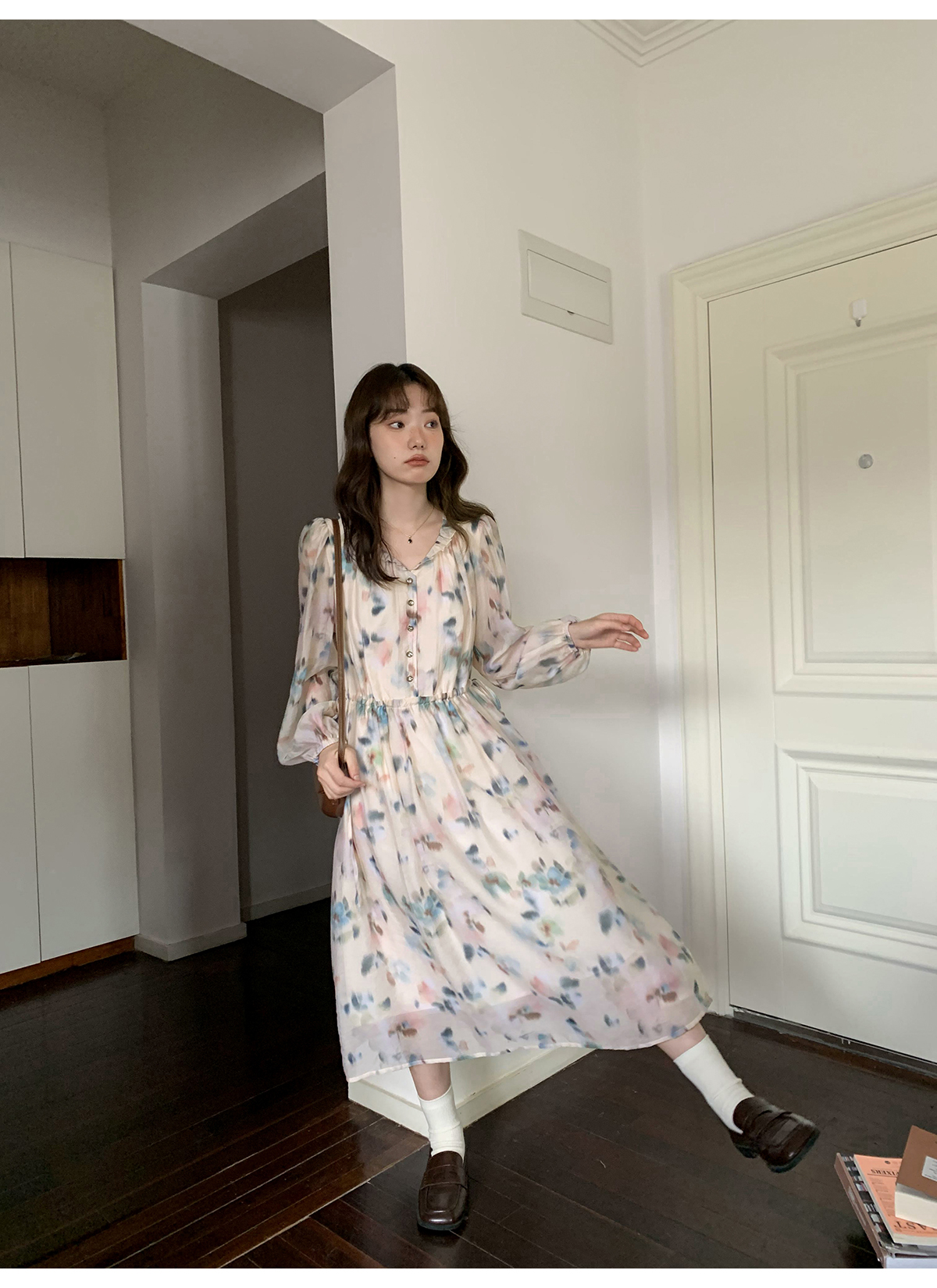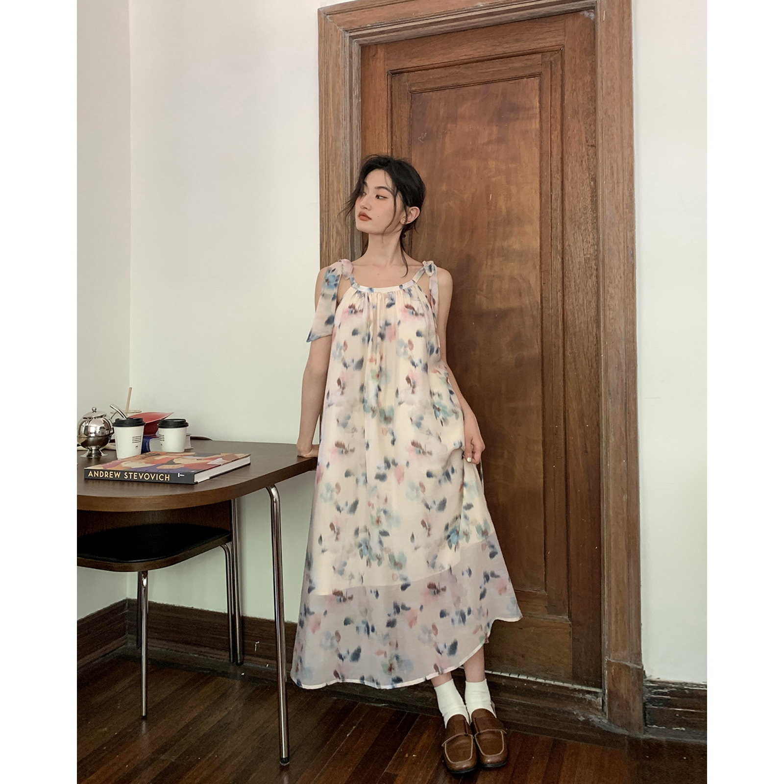 你好卡農 碎花長袖洋裝女早秋2023年新款小眾設計感氣質吊帶裙