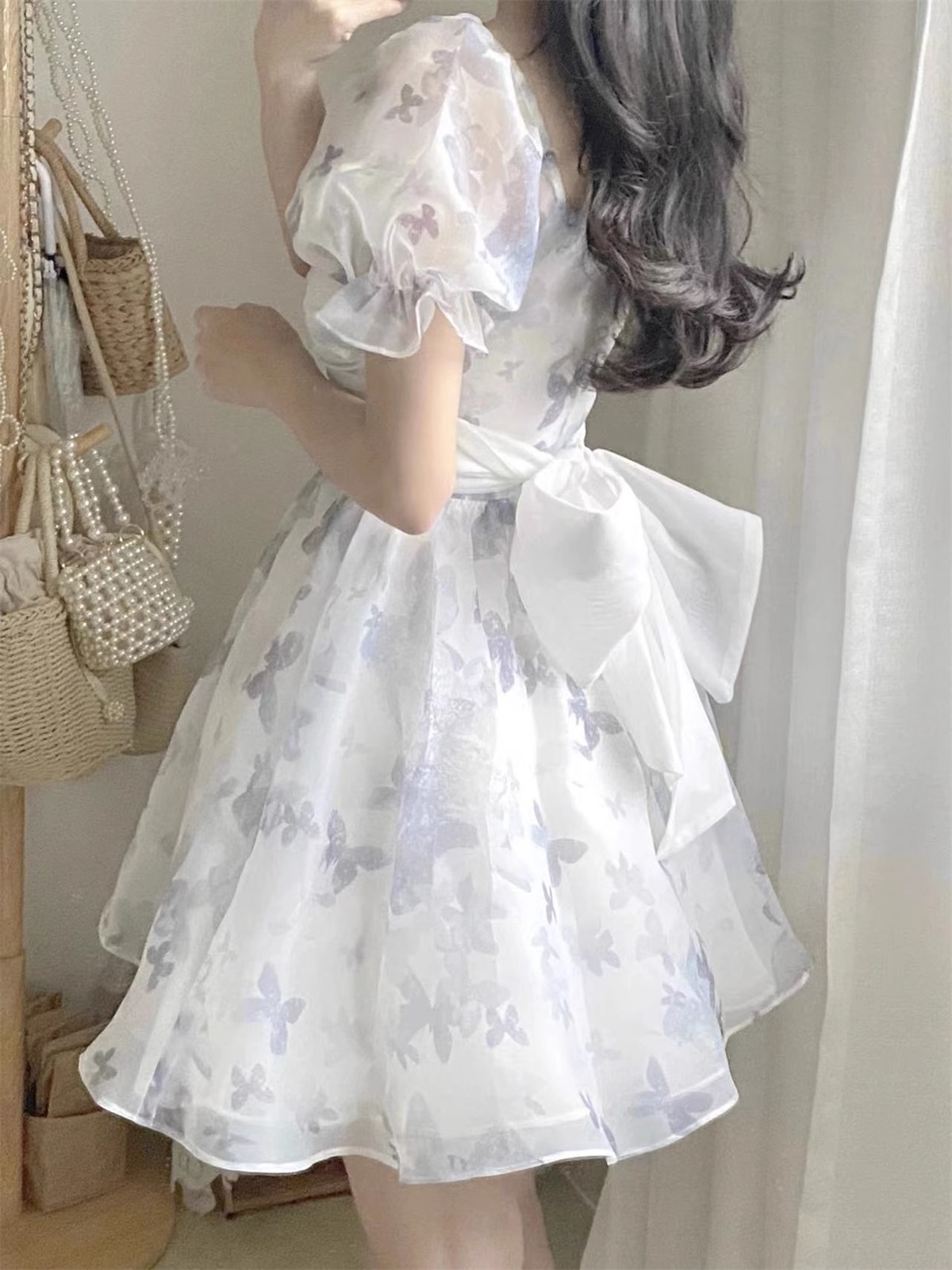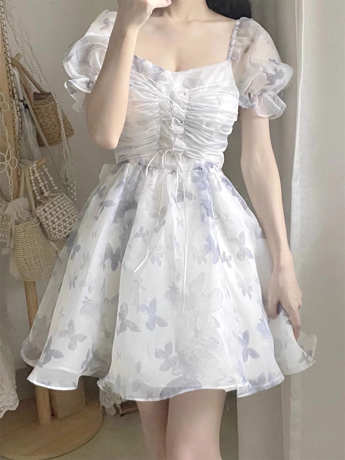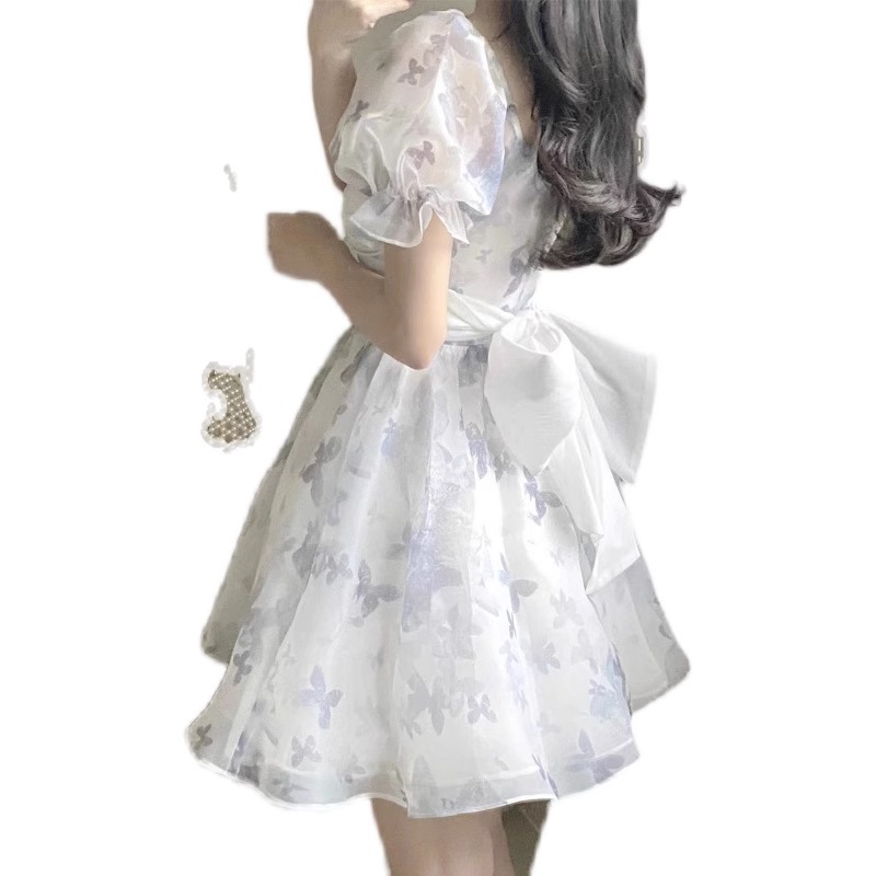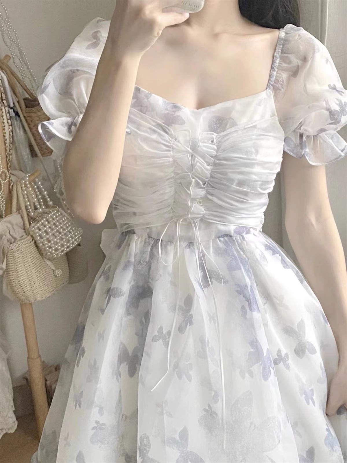 純欲綁帶蝴蝶初戀裙法式方領泡泡袖洋裝女夏季小個子仙女公主裙