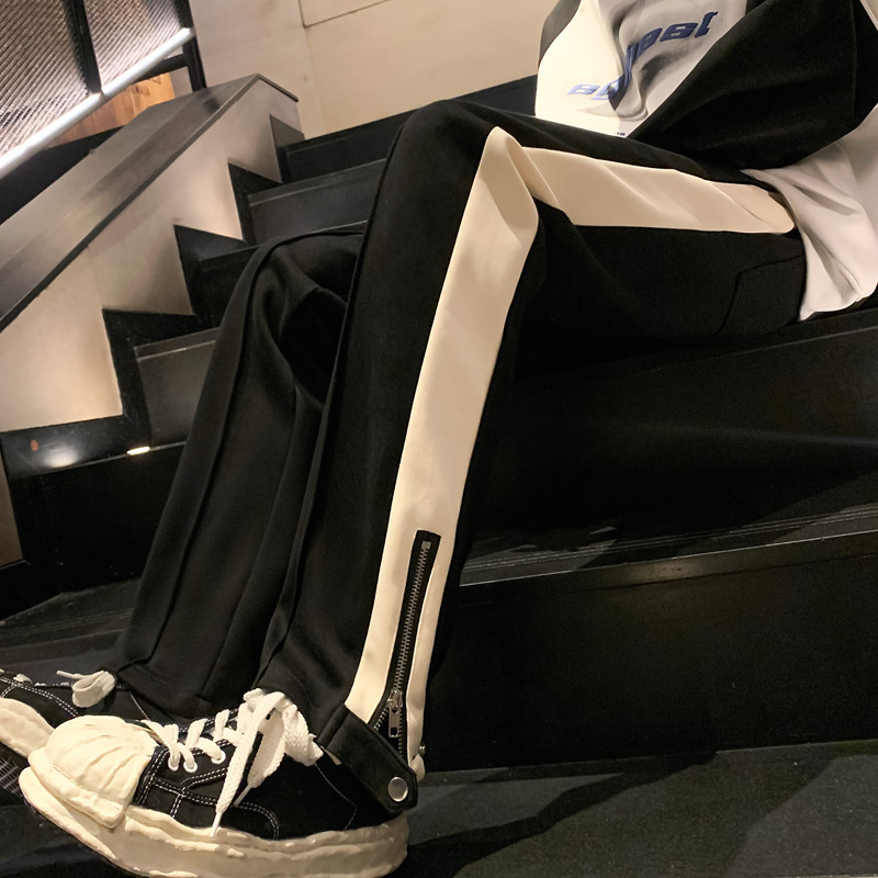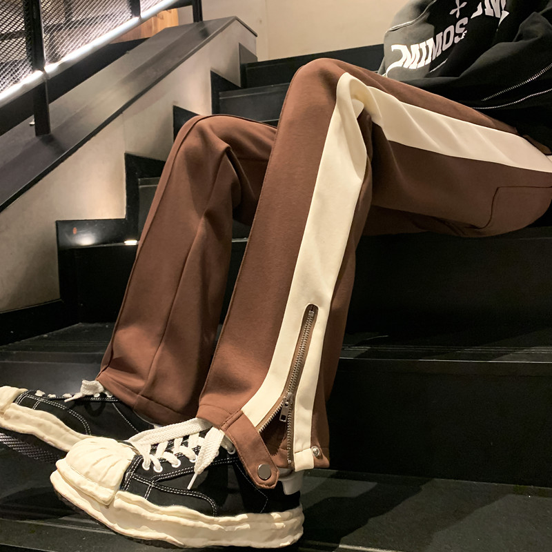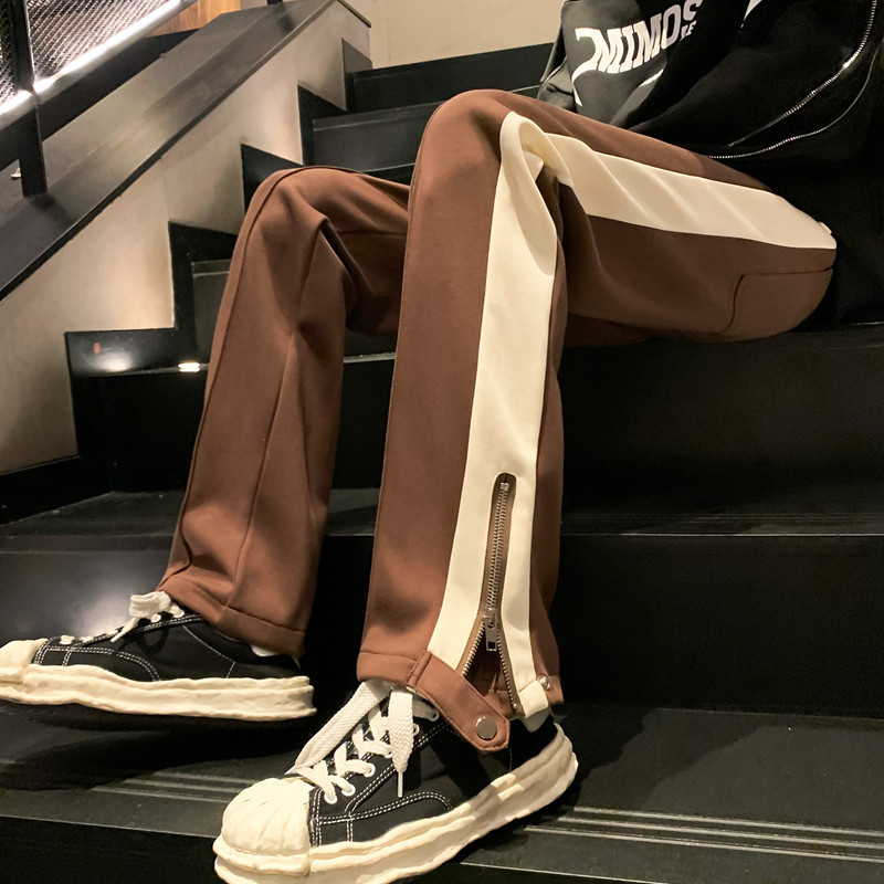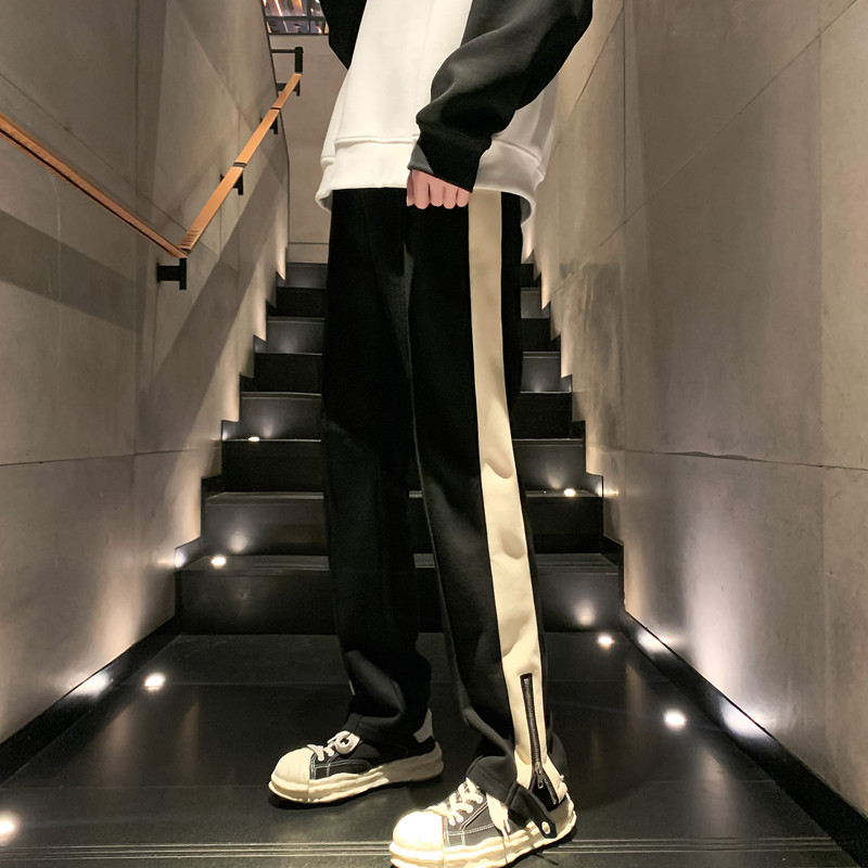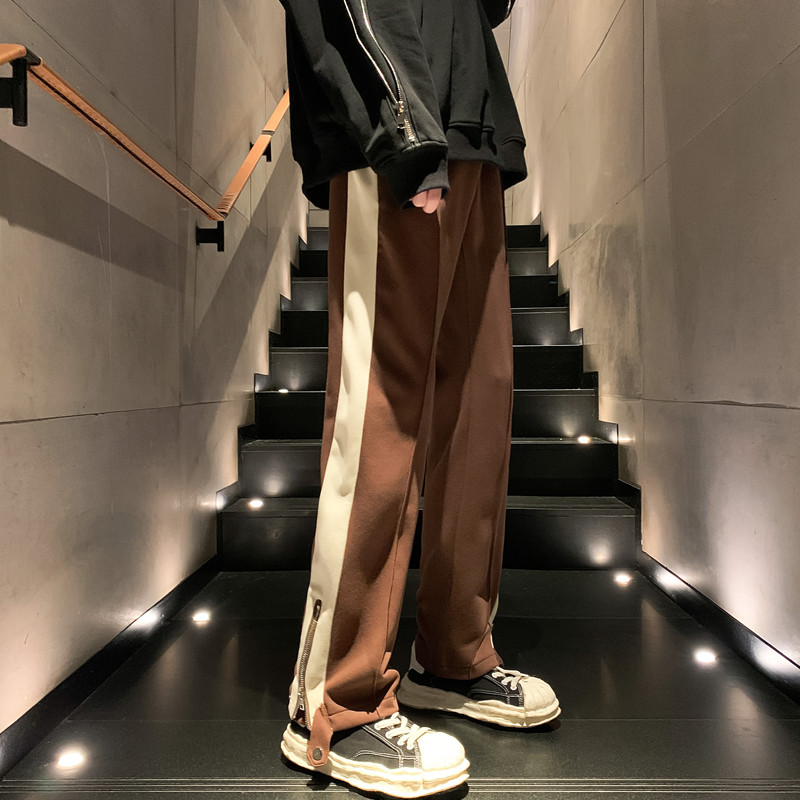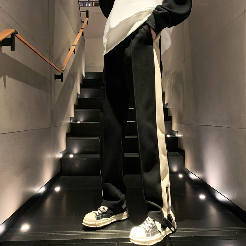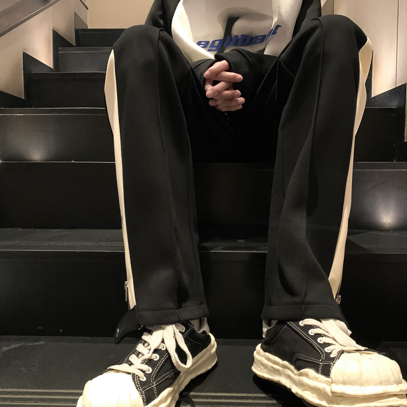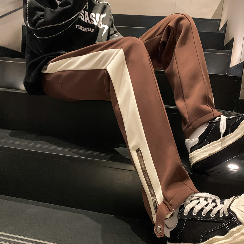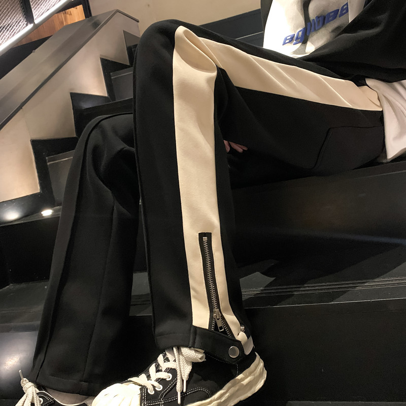 美式vibe褲子男小眾設計感拼接條紋衛褲加長高個子直筒修身微喇叭褲