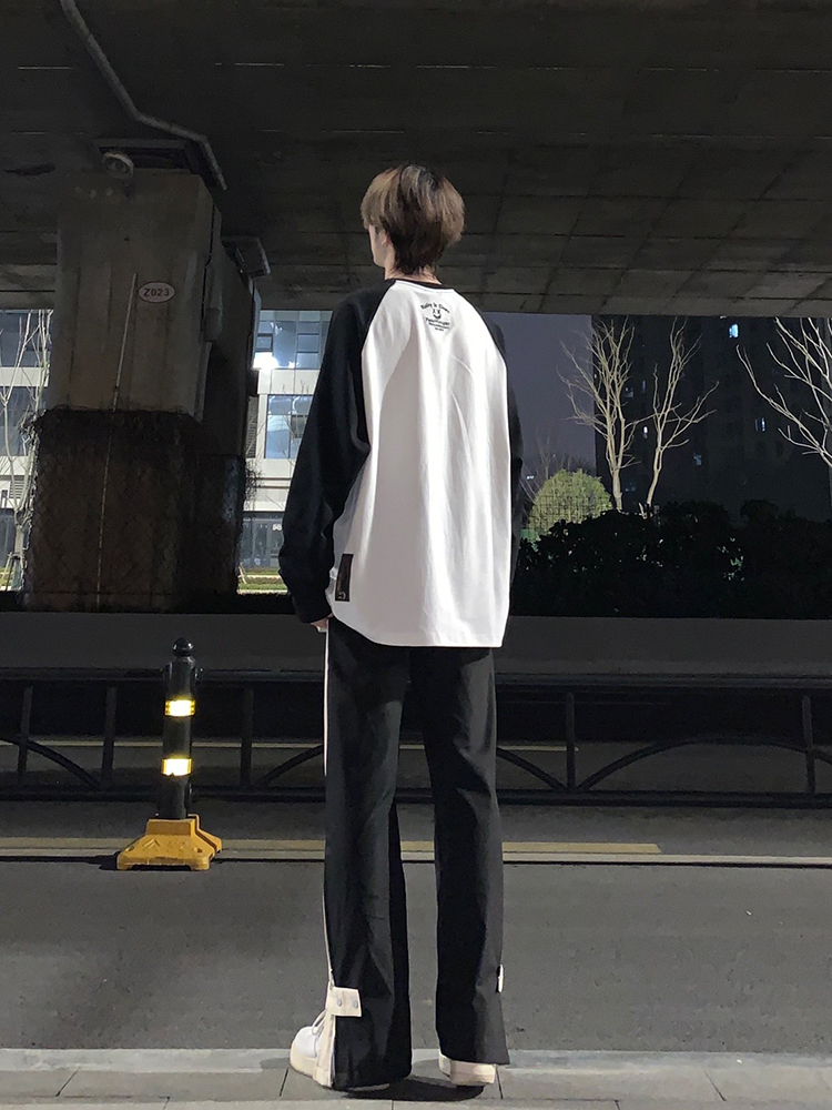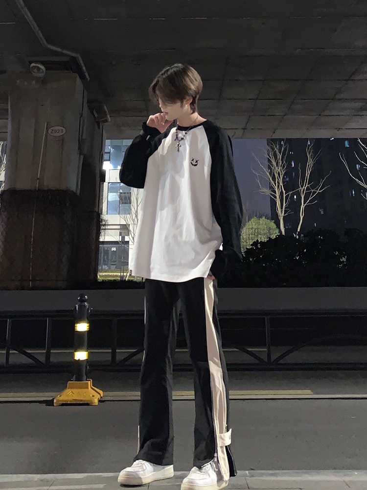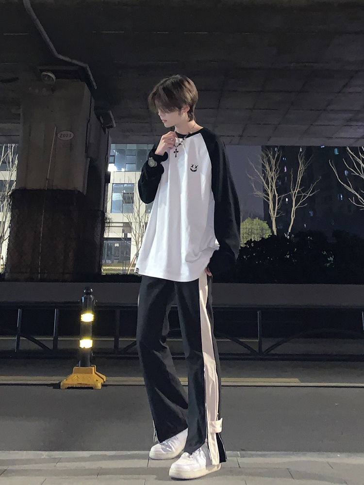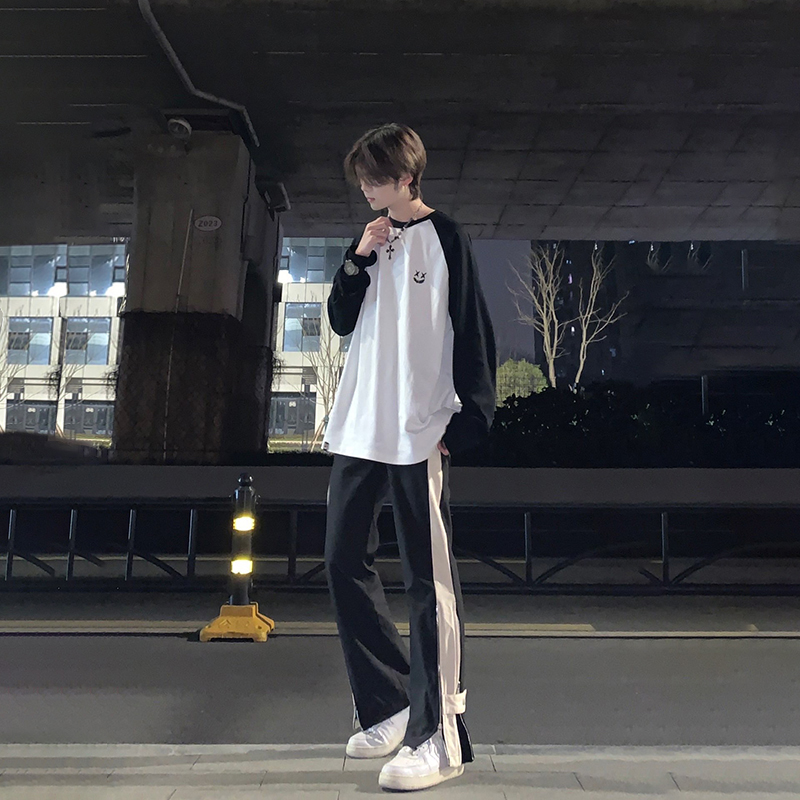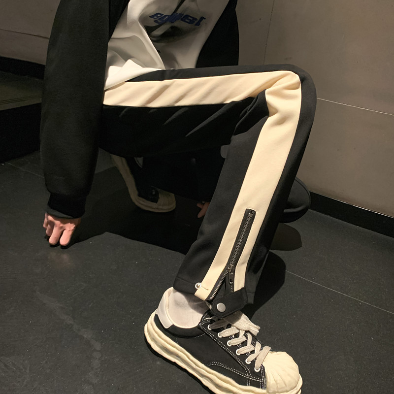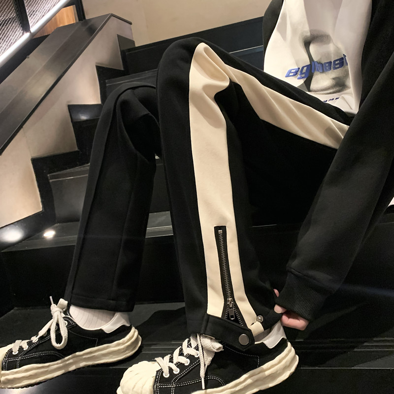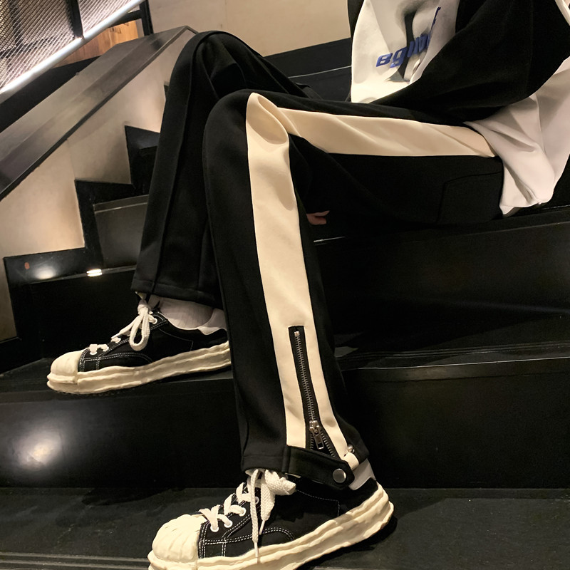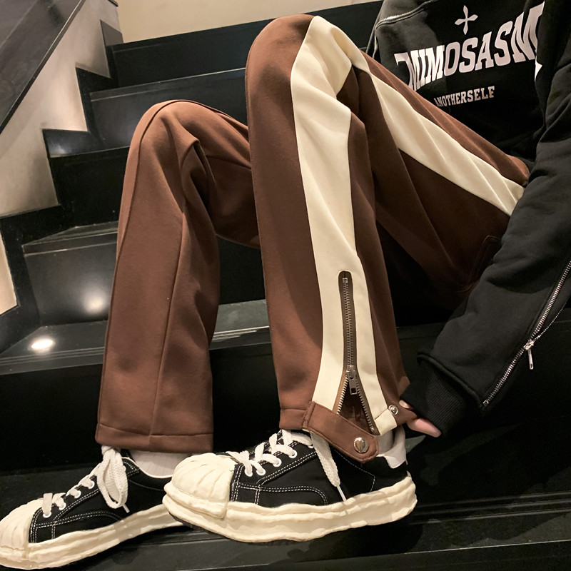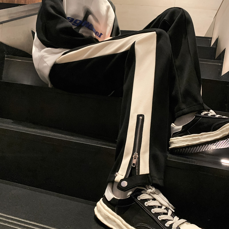 美式vibe褲子男小眾設計感拼接條紋衛褲加長高個子直筒修身微喇叭褲