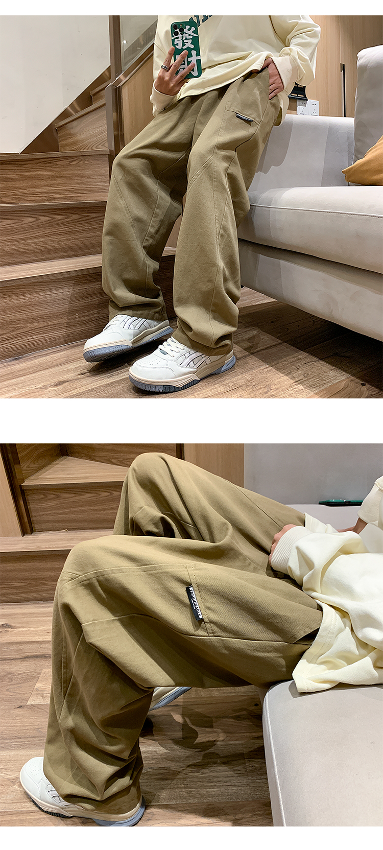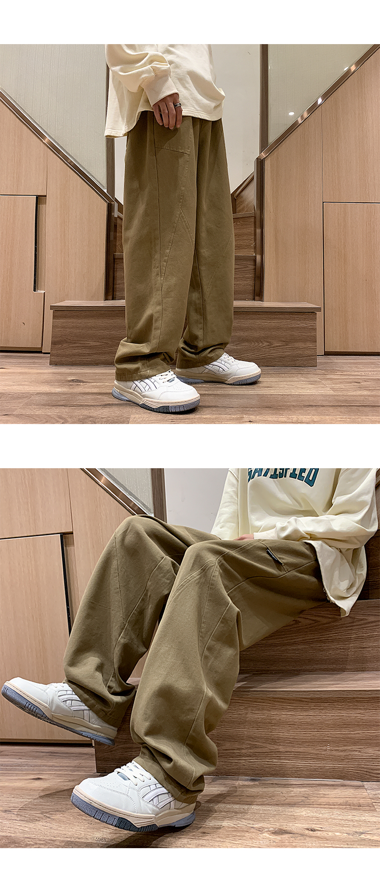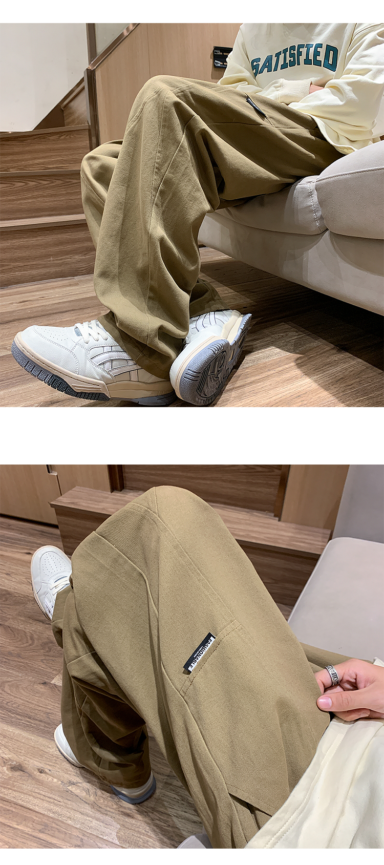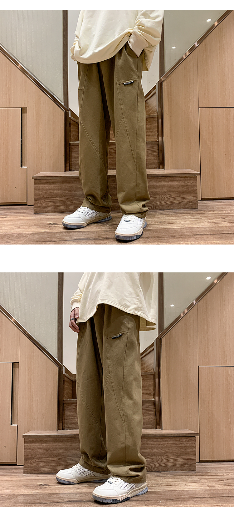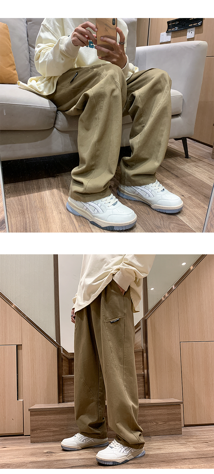 卡其色拼接直筒褲美式高街男設計感小眾oversize闊腿工裝褲ins潮