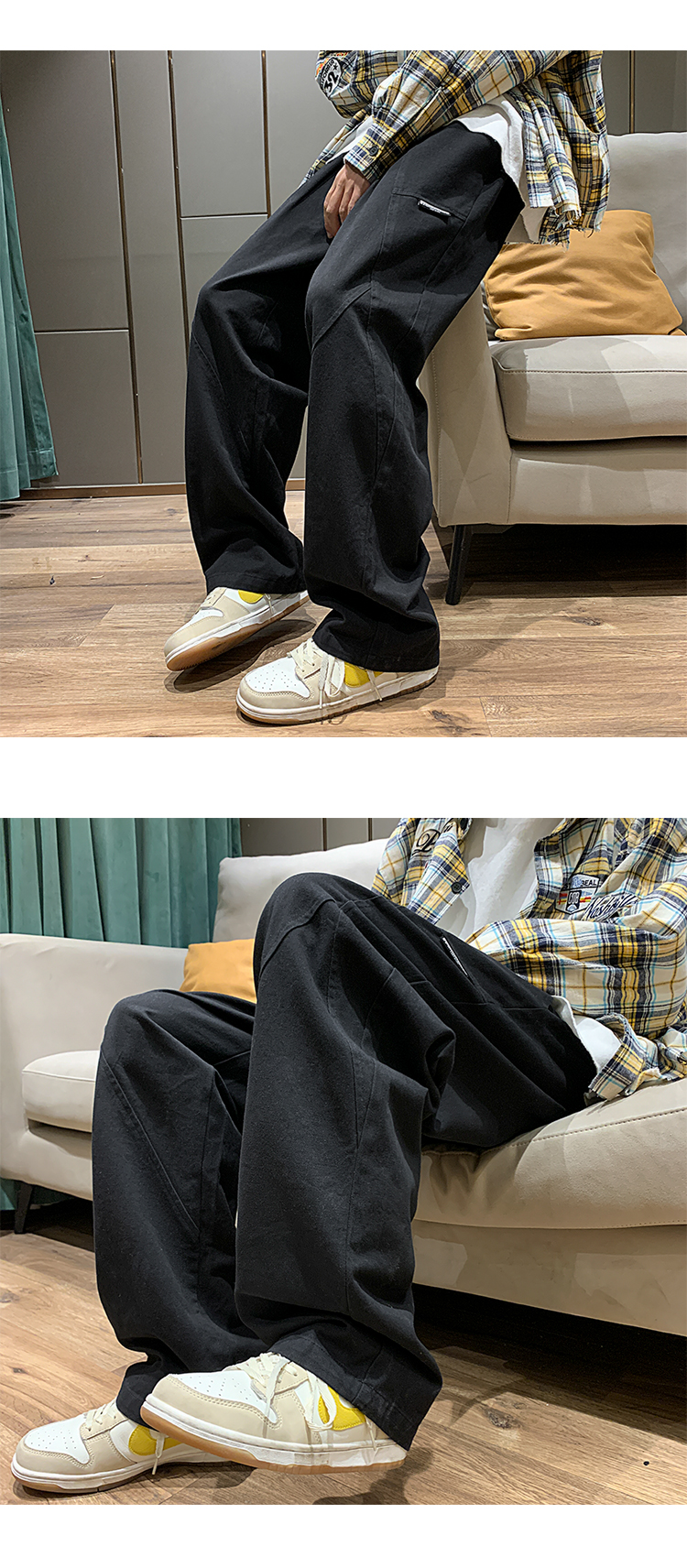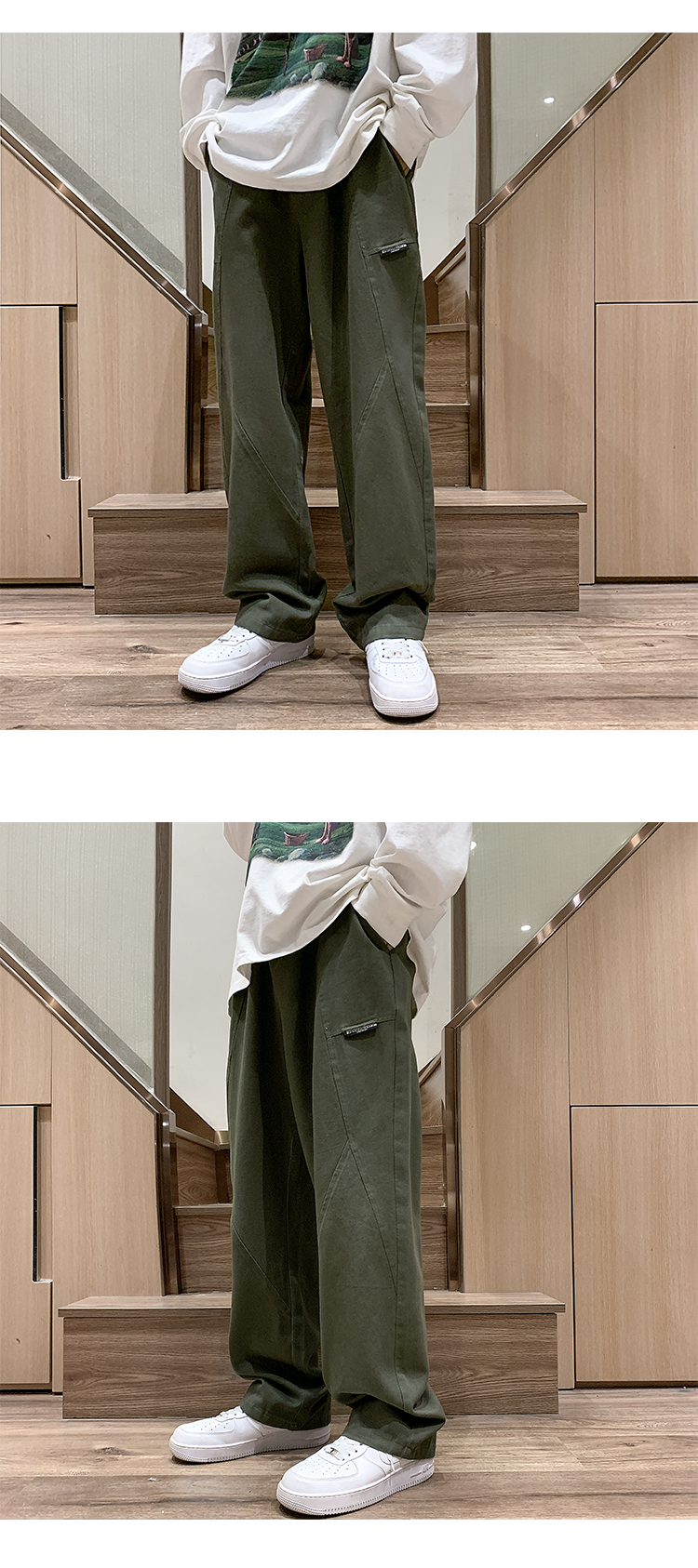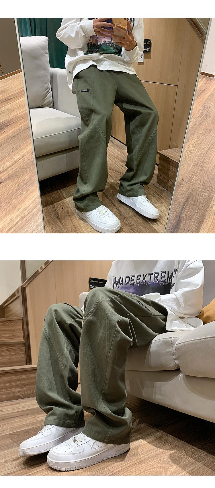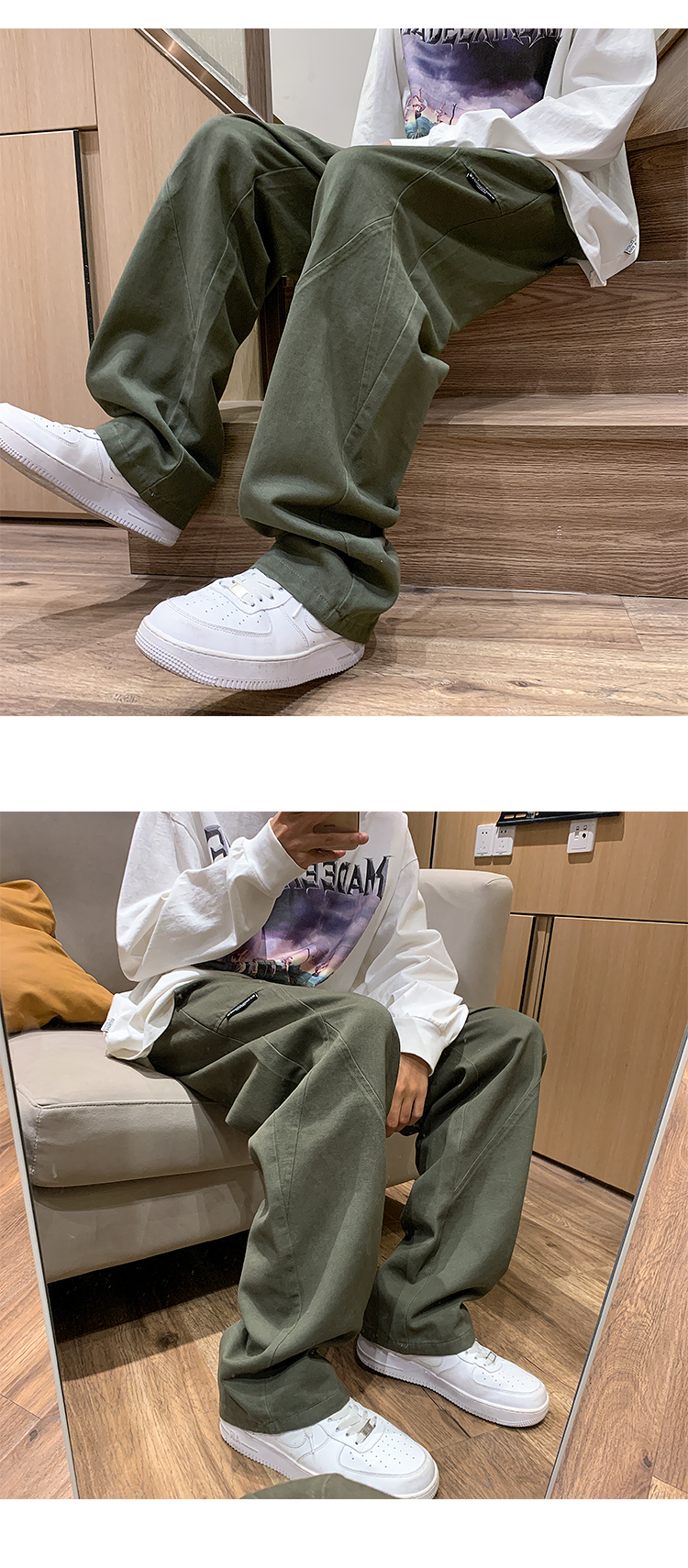 卡其色拼接直筒褲美式高街男設計感小眾oversize闊腿工裝褲ins潮