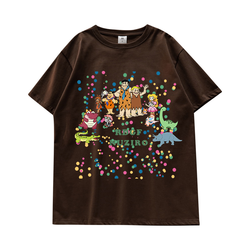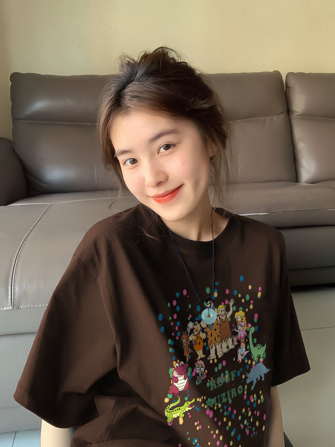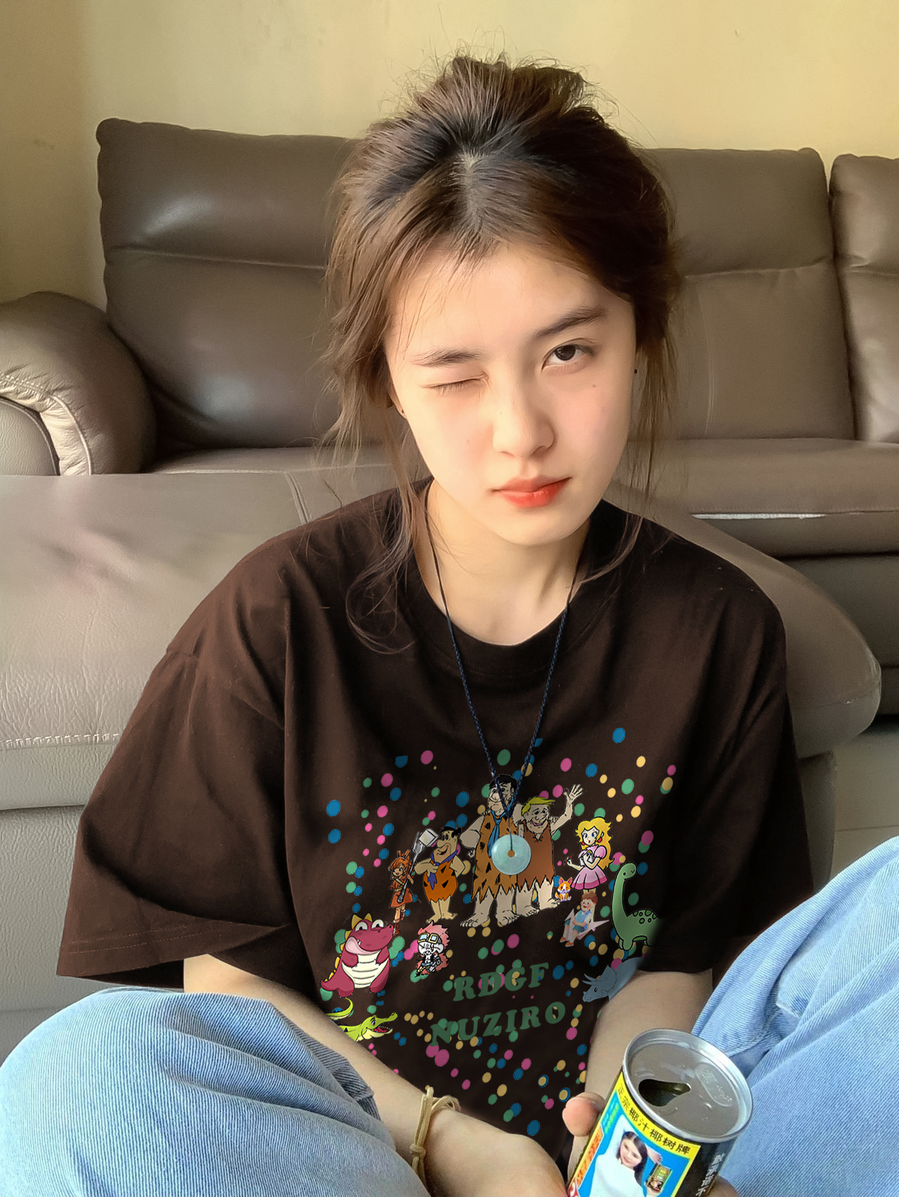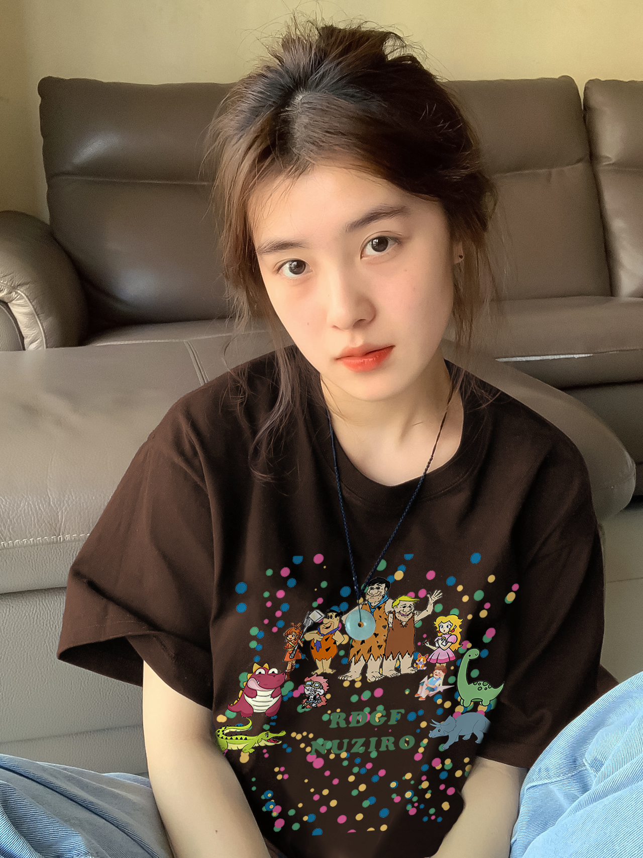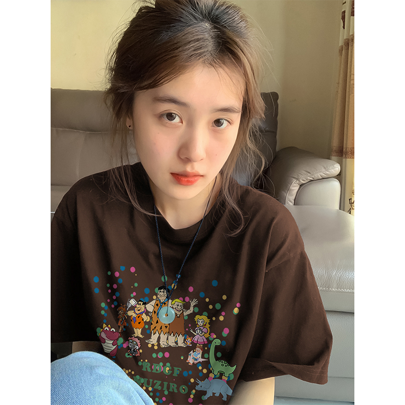 棕色正肩短袖t恤女夏季小眾設計美式復古國潮牌oversize半袖女款