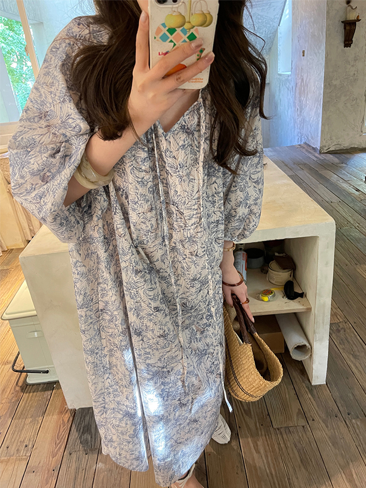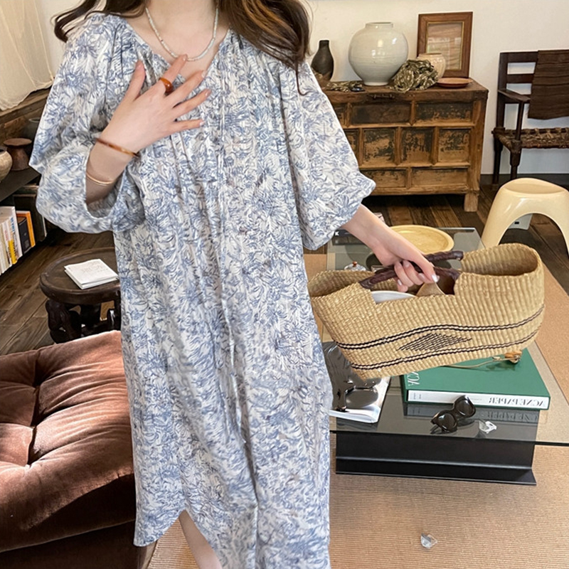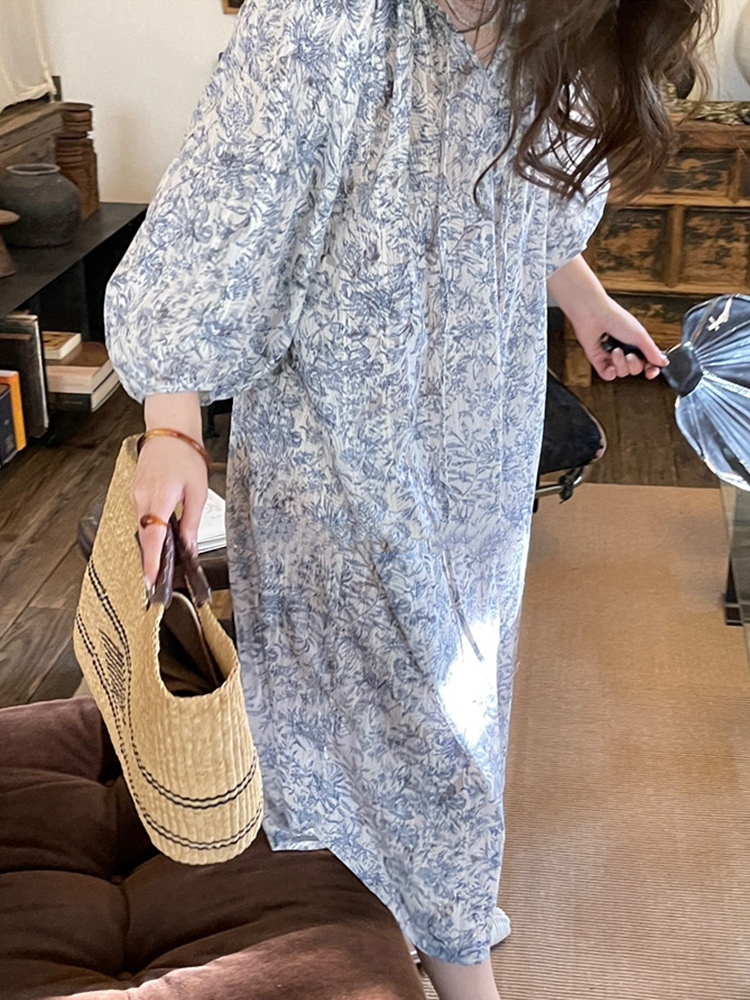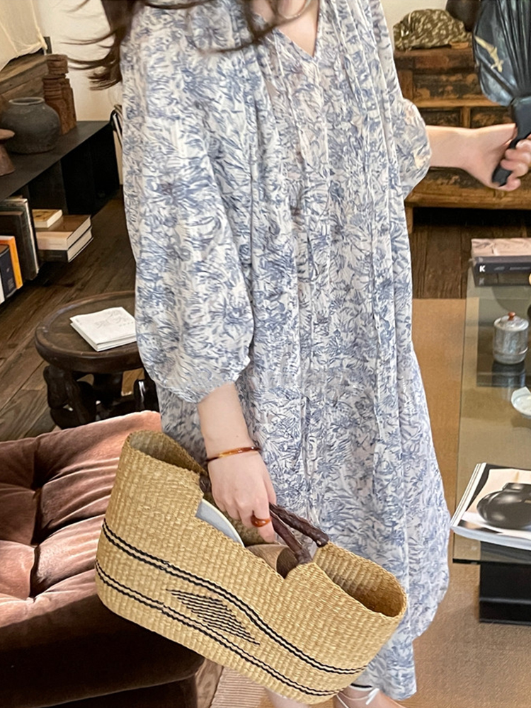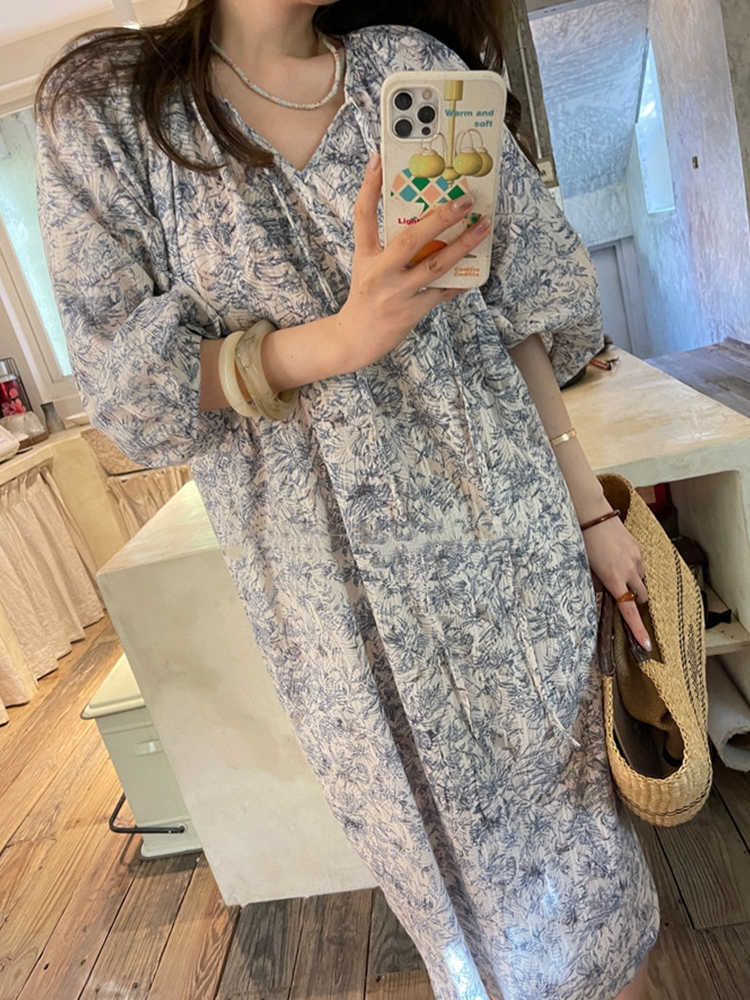 法式V領泡泡袖碎花洋裝女春設計感小眾七分袖襯衫式寬鬆小個子